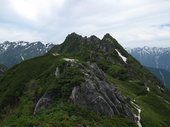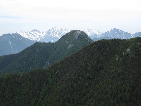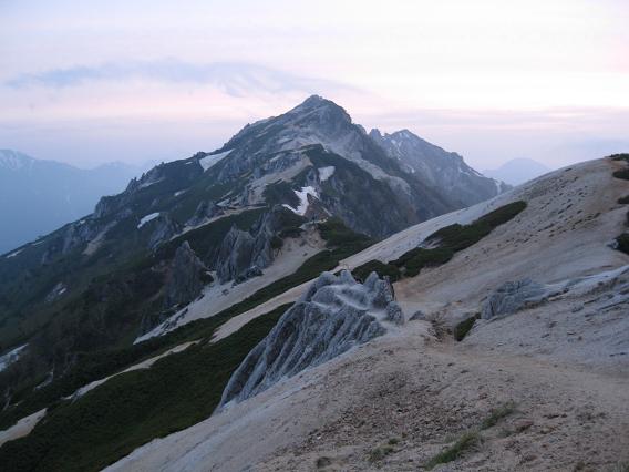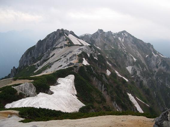 北アルプスの主脈でまだ辿ったことのないルートが二つある。 一つは餓鬼岳から東沢乗越の間であり、もう一つは薬師岳から越中沢岳の間である。 今回は前者のルートを日帰りで往復することにした。 登山口の中房温泉の駐車場に前泊し、夜中の1時に出発。 合戦尾根は柏原新道や八方尾根と同様、夜中でも道に迷うことはない。 今日は餓鬼岳までの長丁場なので、燕山荘まで3時間半を目標に、ゆっくりと疲れないように登る。 汗はそれなりにかくが、さすがに夜中なので夏の暑さはない。 喧騒の表銀座もこの時間帯なら人通りはなく、穂高の町の夜景も綺麗だ。 2時間少々で合戦小屋に着き、朝食をゆっくり食べる。 まもなく夜が白み始めると、足元に残雪があらわれた。 突然、目の前を鮮明な青白い光が右から左に走った。 流れ星にしては明るすぎるので、隕石か何かだったのだろうか?。 槍の穂先も微かに見えるようになり、目標よりも少し早く燕山荘に着いた。 山小屋のテラスはご来光を待つ人達で賑わっていた。 休むことなく燕岳へ向かうと、間もなくご来光となり、5時前に燕岳の山頂に着いた。 ご来光には恵まれたが、予報どおり天気はあまり良くなく、早くも南からの湿った風が吹き始めた。 燕岳からは指呼の間に見える不遇な北燕岳の山頂直下から再び残雪が登山道を覆い始めた。 予想どおりトレースはなく、硬い雪にピッケルを打ち込みながら、キックステップで急斜面をトラバースしていく。 核心部となる次のピークの奥北燕からの下りでは、濃い霧のため正しいルートが分からず、右往左往したあげくの果てに、這松の茂みに残された古い赤布に騙されて一つ隣の急峻な谷を下ってしまった。 ピッケルの制動が利かず、二人揃って5メートルほど急斜面を滑落したのを機に引き返したが、登り返しにも時間が掛かる。 軽量化のためアイゼンを持ってこなかったことが悔やまれる。 霧が少し晴れ、ようやく正しいルートを探し当てたものの、急斜面の雪渓を後ろ向きになって一歩一歩足を蹴りこみながら慎重に下らなければならずもどかしい。 8時過ぎに中房温泉への下山ルートとの分岐である東沢乗越に着いたが、燕岳からはコースタイムよりも1時間以上多くの時間を費やしたのみならず、体力を無駄に消耗してしまった。 天気が予報以上に悪くなればここから中房温泉へ下山することも考えていたが、とりあえず展望の利く東沢岳まで登ってみることにした。 東沢乗越から40分ほどで東沢岳に着くと、ちょうど餓鬼岳から縦走してきた数人のパーティーと出合った。 天気は生憎の高曇りであったが、岩の露出した東沢岳からの展望は新鮮で、眼下に見えた高瀬湖を挟んで対峙する裏銀座の山並みはもちろんのこと、燕岳がいつもと違う面持ちで望まれ、これから辿る餓鬼岳とその手前に荒々しい中沢岳(剣ズリ)の岩峰のピークが立ちはだかっていた。 ここから餓鬼岳まで往復5時間ほどであるが、空を見る限り少なくとも午前中に雨の降り出すことはなさそうだったので、予定どおり餓鬼岳を目指す。 東沢岳から少し下り、燕岳周辺と似たようなユニークな形の岩塔が乱立する稜線を辿る。 東沢岳とほぼ同じ高さの無名のピークまで登り返すと、登山道は中沢岳の左側の樹林帯に向かって一気に標高を下げていく。 ガレた崩壊地をトラバースする辺りで疲れの見えてきた妻と別行動することとなり、私のみ餓鬼岳まで行くことになった。 中沢岳の岩峰の基部を時計回りに回り込むようにして進み、鬱蒼とした樹林帯の中にジグザグにつけられた急坂を喘ぎながら登ると、大小の岩が堆積する展望の良いピークの一角に躍り出たが、三角点や山頂の標識はなく、地図どおりそこは中沢岳の山頂ではないようだった。 岩伝いにルートを探せば真の山頂まで行けそうな感じであったが、妻と別行動になってしまったのでやむなく今回は先を急ぐ。 中沢岳から先は小さなアップダウンが連続する面白い岩稜となった。 小さな梯子が随所に架けられ、スピーディーに行動出来る。 見た目には標高を落とさずに餓鬼岳まで稜線を辿れそうだったが、最後は雪の急斜面を山小屋のスタッフによって刻まれた大きなステップに導かれ、再び樹林帯の中の鞍部まで下る。 鞍部からは緩やかにだらだらと登り返すと、ようやく赤い屋根の餓鬼岳小屋が近づいてきた。 11時半過ぎにようやく餓鬼岳小屋に到着。 小屋の前のベンチに荷物を置き、空身で目と鼻の先の山頂に向かう。 山頂にはこれから唐沢岳に向かう登山者が1人いた。 午後からは下り坂という予報に反して天気は尻上がりに良くなり、お昼近いこの時間帯の展望としては申し分ない。 眼前には針ノ木と蓮華、そして立山と剣が頭を揃え、爺や鹿島槍も良く見える。 しかし何といっても、辿ってきた燕岳からの縦走路と遥か遠方の槍の穂先がはっきり見えたことが驚きだ。 餓鬼岳の頂に立つのはこれで3回目だが、いつ来てもこの頂は印象深い。 4年前に山仲間