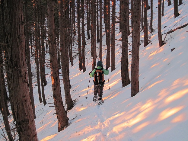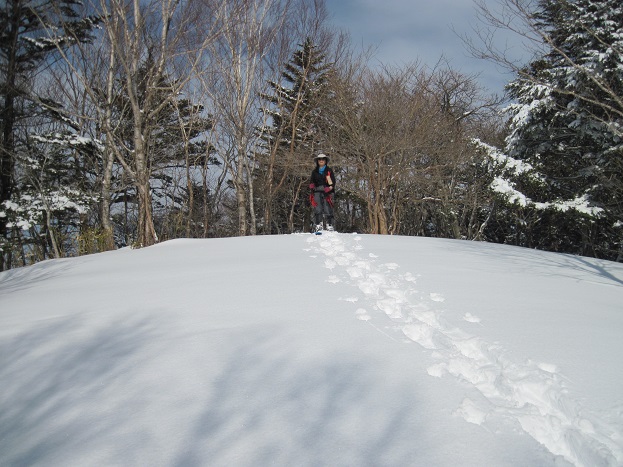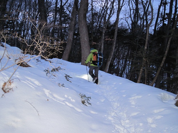 2時前に静かな山頂を後にしたが、先日の男体山とは違い、今日は周囲に人の気配は全く感じられなかった。 登りでは雪の状態が悪くて辿れなかった雪庇の尾根を下りではむしろ積極的に使ったので、妻が雪の亀裂に落ちるハプニングがあった。 1514m峰からは下るスピードが一段と速くなり、林道終点の登山口まで山頂からほぼコースタイムどおり2時間半で下れたので、まだ明るい5時半前に小山宅に着いた。