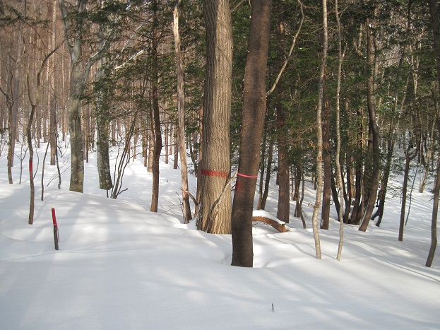 登山口付近にもトレースの名残は皆無で、少なくともここ半月くらいは入山者がいないことが分かった。 前回はここから登山道の取り付きが分からず難儀したが、入口の木には新しいピンクのテープが巻かれていた。 高度計を1030mに合わせ、前回の記憶と地形図を頼りに道型の全くない樹林帯の斜面を木々の間が空いている所を繋いで登っていく。 雪はそこそこ締まっていたので、スノーシューの沈み具合は10センチほどだった。 登山口から500mほど先の所にある平坦地の赤ペンキが印された木を目標に尾根を巻きながらトラバース気味に進んでいくが、平坦地が広すぎて目標の木が探し当てられず付近を徘徊してしまい、赤ペンキが印された木を見つけるまで登山口から1時間も掛かってしまった。