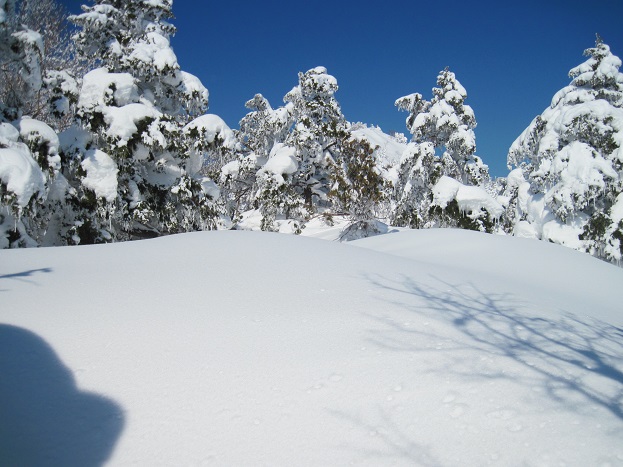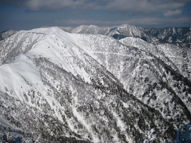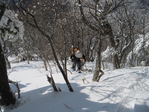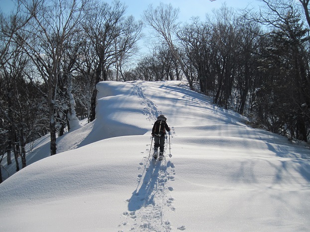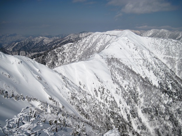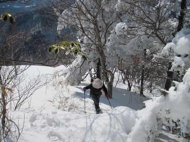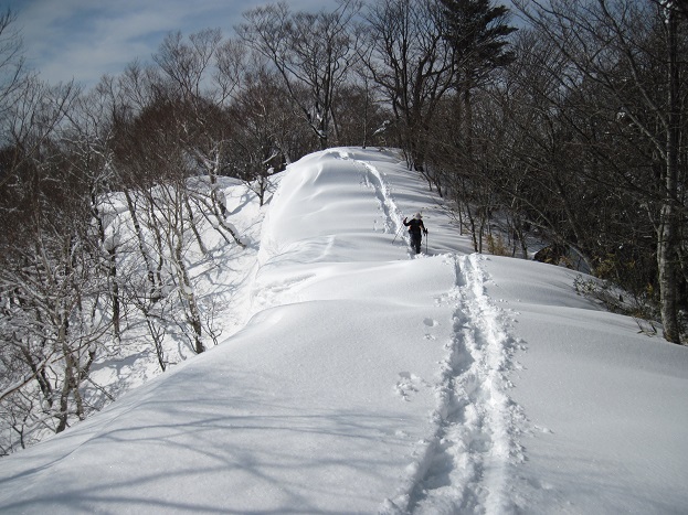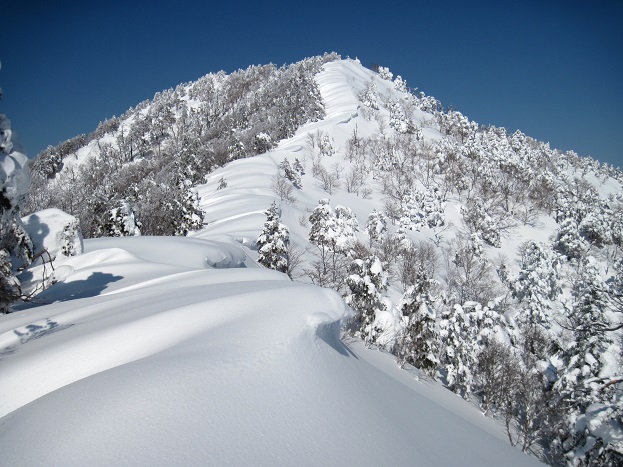 1514m峰からは尾根が90度近く右に折れ、緩やかな登り下りを繰り返した後、再び50mほど鞍部に向けて下る。 樹間から日留賀岳の山頂と、これから登る顕著な尾根が見えた。 尾根の右側に雪庇が大きく張り出しているので、冬道のルートはとても分かり易く記憶にも新しかった。 1470mの鞍部までは軽いラッセルで雪庇の上を歩けたが、鞍部からの登り返しからは新雪と気温の上昇で雪庇の上を積極的に歩くことが出来なくなり、雪の状態に合わせて尾根の左側の登山道、尾根上の藪、そして時には尾根の右側の雪庇の基部を状況に応じて選びながら登るようになった。 良く締まった雪庇の上をスムースに直登することが出来た前回に比べると煩わしいかぎりだが、逆にこれが本当の山登りだと思えてならなかった。 それでも傾斜の緩い尾根のお蔭で、12時半過ぎに山頂直下の僅かな平坦地まで登ることが出来た。