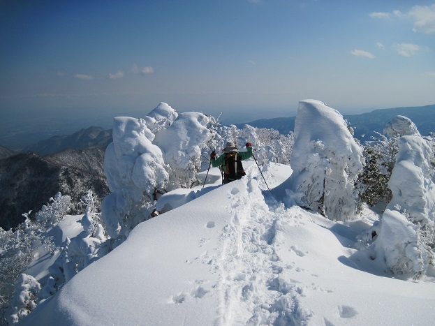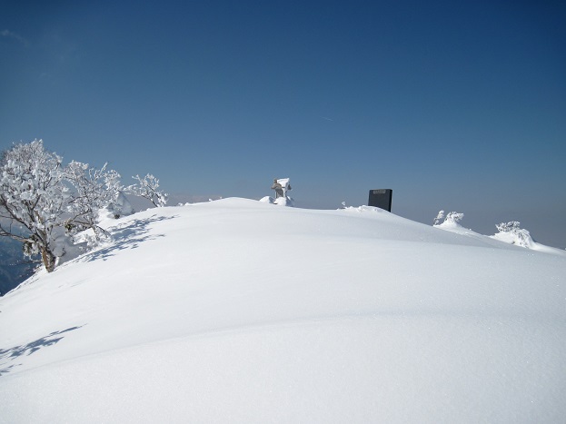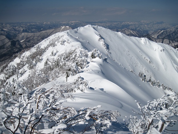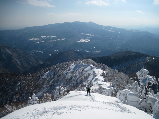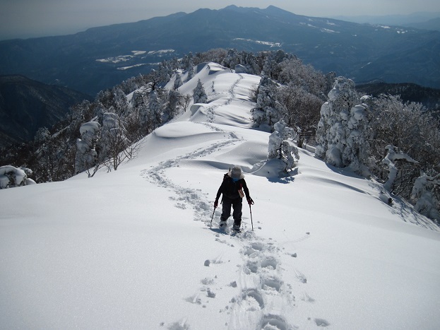 山頂直下の平坦地からは積雪と新雪の量が一気に増え、逆に雪庇の上しか歩けないようになってしまった。 ボリューム感のある雪庇の上に足を踏み入れる。 南斜面の雪庇は湿雪となっていたが、数メートルにも積もった下の雪はその重みで硬く締まり、雪は重たいが積雪に関係なくスノーシューの沈みは最大20センチほどで済んだ。 快適とまではいかないが、良い天気に恵まれた会心の登りだ。 困難に思えた山頂直下の雪庇を僅か30分ほどで登り終え、山頂の南端に着いた。 南端からはモンスターと化した木々の間を雪に足を取られながら僅かに進み、1時半前に三度目となる日留賀岳の山頂に着いた。 ここは毎度私達だけの静かな頂だ。 既に昼過ぎとなり、クリアーな展望は得られなかったが、南には高原山、北には鹿又山、男鹿岳、大佐飛山、そして裏那須の山々、西には荒海山、七ケ岳、会津駒ケ岳、三ツ岩岳などの南会津の山々が望まれた。 この時期にしては珍しく山頂は無風だったので、ラッセルで疲れた足を労りながら30分ほどゆっくり寛ぐことが出来た。