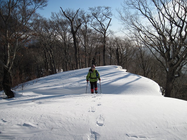南岸尾根にはトレースは見られず、今日も貸切りとなりそうだった。 鹿が飛び跳ねる“通い慣れた”1792m峰、1816m峰を稜線漫歩で越えていくが、気温の上昇で次第に雪が重くなり、積雪が少ない所ではスノーシューが下駄を履くこともあったが、大平山への分岐が近づいて積雪が多くなると、逆に雪が良く締まっていて歩き易くなった。