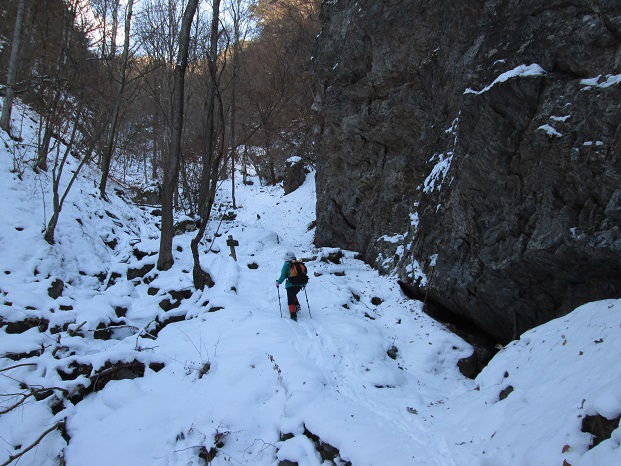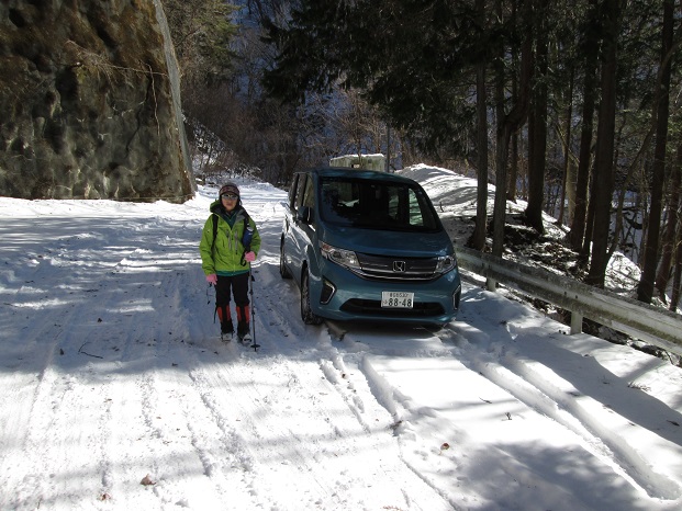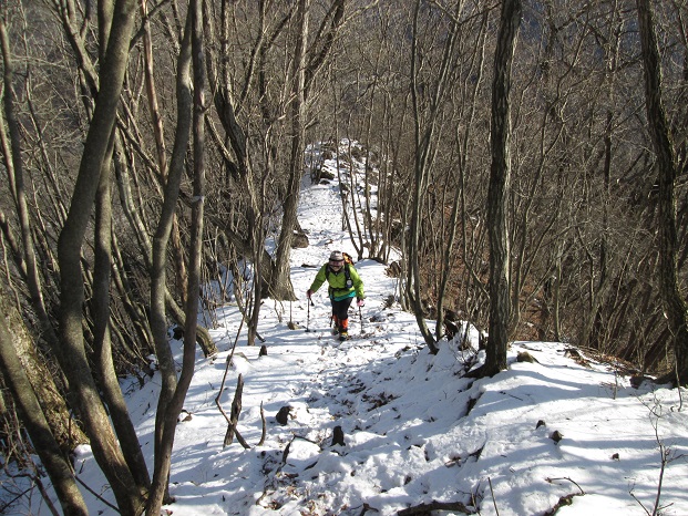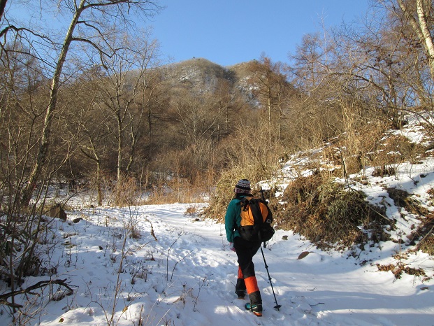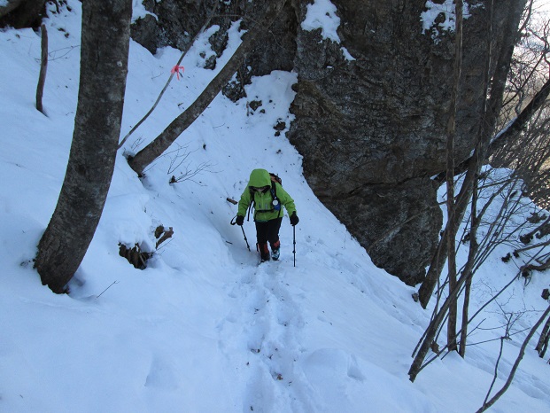 日暮山からの下山後は車で1時間ほど南に移動し、正午過ぎに国民宿舎『やまびこ荘』のすぐ先の車道の路肩に車を停めて出発。 40分ほど轍のある車道を歩いてシラケ山(天狗岩)の登山口に着くと、地元ナンバーの車が1台路肩に停まっていた。 登山道の積雪は日暮山よりも多く、トレースはその車のパーティーのものと思われた。 30分ほど歩いて休憩小屋のあるシラケ山と天狗岩の分岐に着くと、トレースは天狗岩方面に付けられ、シラケ山方面にはトレースがなかった。 私達も天狗岩を経由してシラケ山に登る予定だったので、先行者のトレースを辿って行く。 幸か不幸かトレースのお蔭でコースタイムどおりに歩けた。 猫の額ほどの狭い天狗岩の山頂は雑木に覆われていたが、すぐ先に見晴らしの良い展望所があり、妙義や荒船山周辺の山々の展望が良かった。