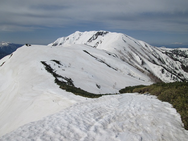 今日は樅沢岳か双六岳に登ってから新穂高温泉に下山する予定でいたが、昨日の帰りが大幅に遅くなり、また疲れも残っていたので、ゆっくりと7時半に双六小屋を出発した。 Nさんもその5分ほど前に出発して行った。 天気は昨日よりもやや雲が多いが、今日も爽やかな五月晴れだ。 まだ気温は低いので、弓折岳までのハイマツの尾根の踏み抜きはなかった。 弓折岳の山頂で最後の展望を楽しみ、アイゼンを着けて往路と同じ冬道のルートで下る。 シシウドが原付近まで下ると、登ってくる人が見られるようになり、トレースはさらに明瞭になっていた。 帰路はコースタイムどおり、双六小屋から4時間弱で小池新道の起点となる左俣林道との分岐に着いた。 予想どおり林道を覆っていた雪は殆どなくなり、旬のフキノトウを収穫しながらワサビ小屋まで歩き、1時ちょうどに新穂高温泉に着いた。