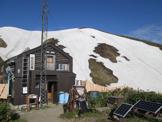 越後駒ケ岳の山頂に至る5つのルートのうち、唯一辿ったことがなかった駒ノ湯温泉からのルートで越後駒ケ岳に登った。 登山口の駐車場を出発した時は他に車はなく、途中の小倉山を過ぎてからも枝折峠からの登山者数名と出会っただけだったが、山頂直下の駒の小屋に着くと予想以上の宿泊者で賑わっていた。 小屋の前で山小屋のスタッフに声を掛けられ、今日は山開きということで記念品の御守りをいただき、登山者名簿に名前や住所などを記帳した。