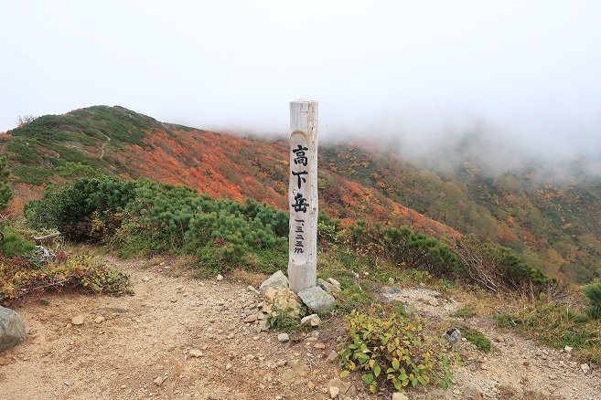 根菅岳から高下岳へは和賀岳から眺めたとおりの起伏のあまりない道で正に稜線漫歩だ。 山肌の紅葉はこの区間が一番素晴らしく、高下岳の山頂を待たずに来年以降に再訪することを心に誓った。 根菅岳から楽々30分ほどで最後のピークとなる高下岳(1323m)の山頂に着いた。 相変らず霧は晴れないが、それでも僅かながら見通しが利くようになってきた。 高下岳の山頂で初めて腰を下ろしてランチタイムとし、少し先の南峰まで往復してから往路を引き返した。