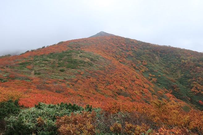 沢尻岳から先は森林限界となり、ブナに替わって山肌を覆う背の低い草木の紅葉が素晴らしい。 稜線の紅葉のタイミングは正にジャストミートだった。 霧のため山々の展望は殆ど利かないが、もし晴れていれば足が前に全然進まなくなってしまうだろう。 沢尻岳から30分ほどで目標の大荒沢岳(1313m)の山頂に着いたが、霧に煙った山頂からはお目当ての羽後朝日岳は全く見えず、下見としての目的を果たすことが出来なかった。 天気は悪いが雨の予報は無かったので、昨日和賀岳から良く見えた根菅岳とその先の高下岳まで足を延ばすことにした。 天気は予報どおり下り坂に入ったと思ったが、風の強弱により時々霧が途切れて稜線の紅葉した山肌が見えて嬉しくなる。 山頂直下でようやく見えた根菅岳は和賀岳から見た地味な山容とは全く違う存在感のある面持ちで1345mの山とは思えない迫力さえ感じた。 大荒沢岳から1時間ほどで根菅岳の山頂に着いたが、残念ながら山頂はやはり霧に煙っていた。