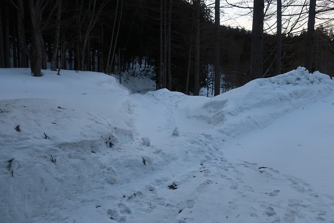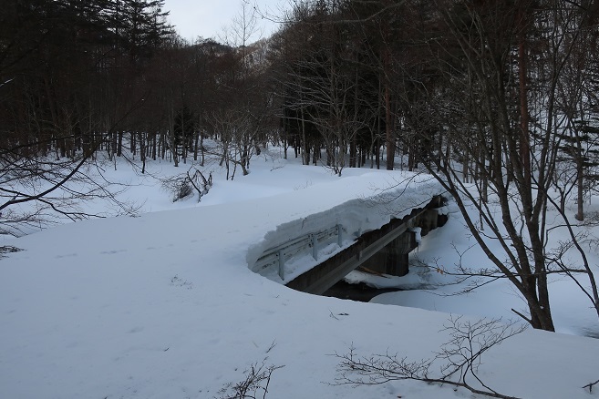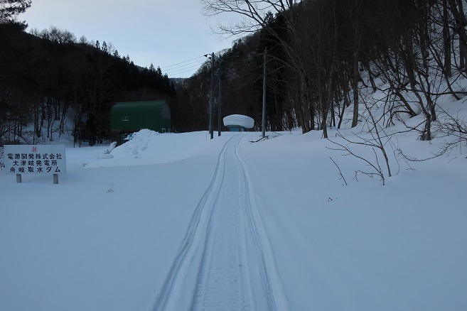 檜枝岐村の中心部に近い大畑集落の外れの除雪終了点から大中子山の取付きとした1031m地点の牛首橋に向けて林道を歩く。 付近にある取水ダムへのスノーモービルの轍につられて少し道を外してしまたが、1時間足らずで大中子山の取付きとした牛首橋に着いた。 大中子山は地形図に登山道が記されていないので、ネットの情報を参考にここから取付くことにしていたが、付近には目印となるようなものは見当たらなかった。 現場判断で登る山を長須ケ玉山に変更し、1031m地点からキャンプ場などを通りながら30分ほどで長須ケ玉山への取付きとした1085m地点に着いた。 長須ケ玉山も地形図に登山道が記されていないので、ネットの情報を参考にここを取付きに決めたが、大中子山と同じように取付きには目印となるようなものは見当たらなかった。