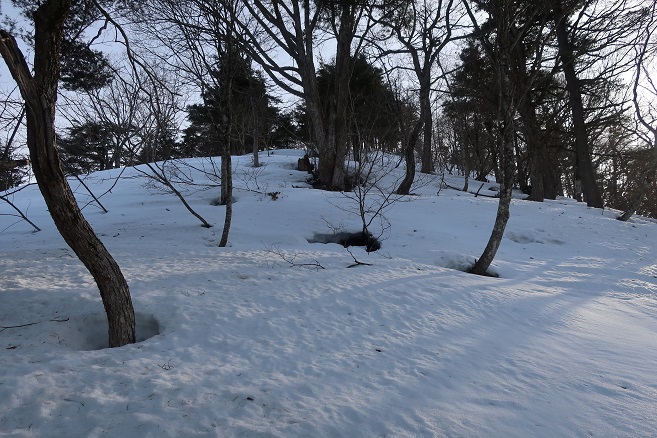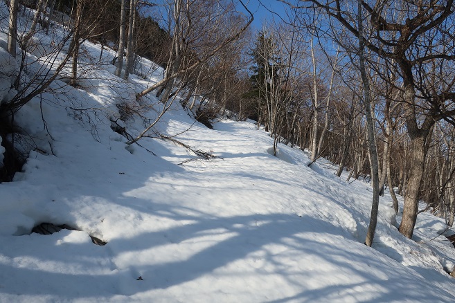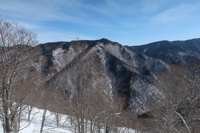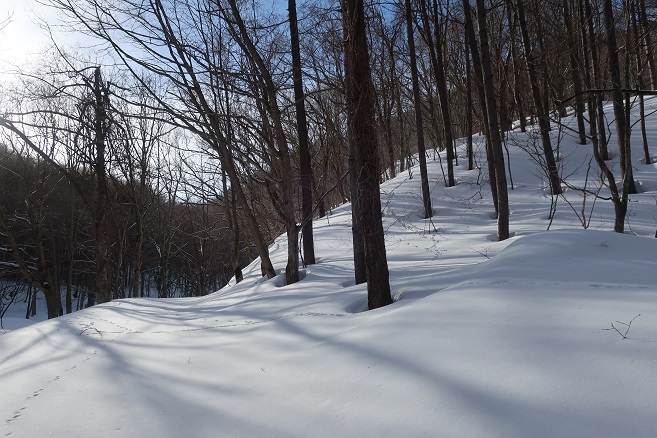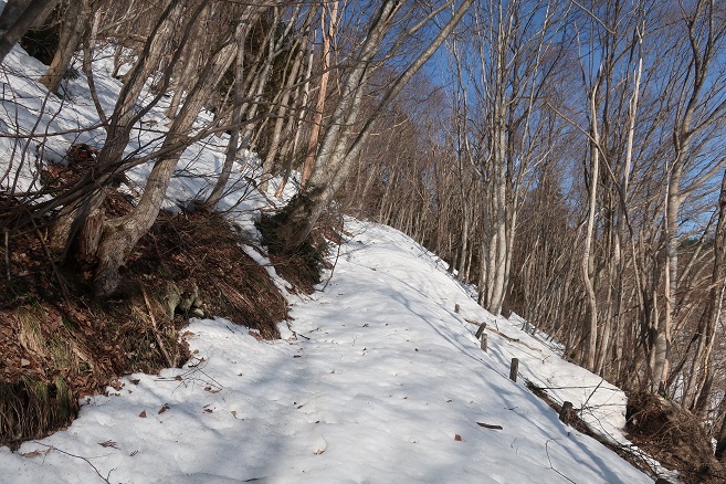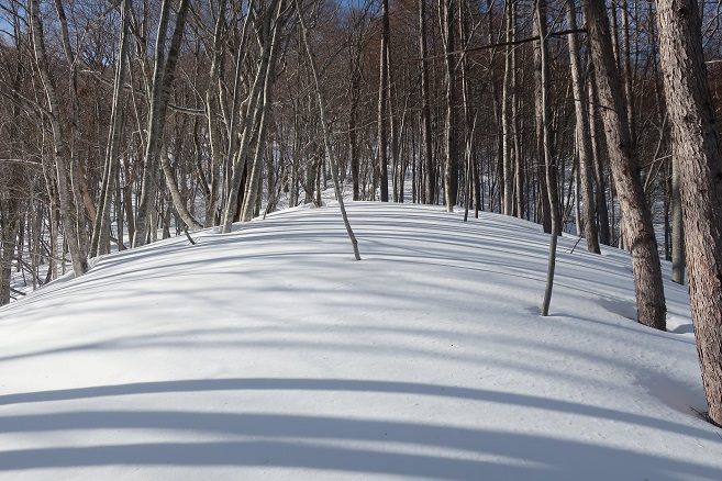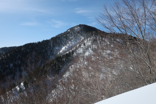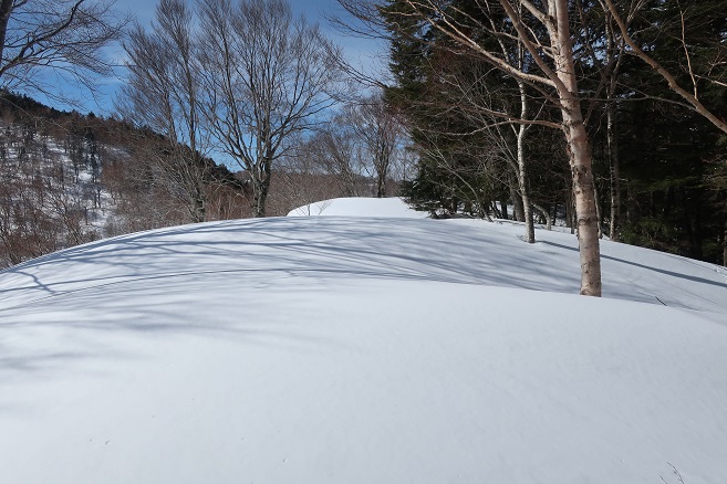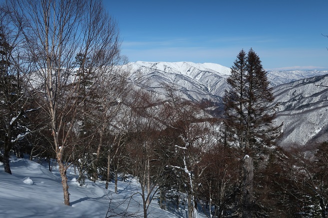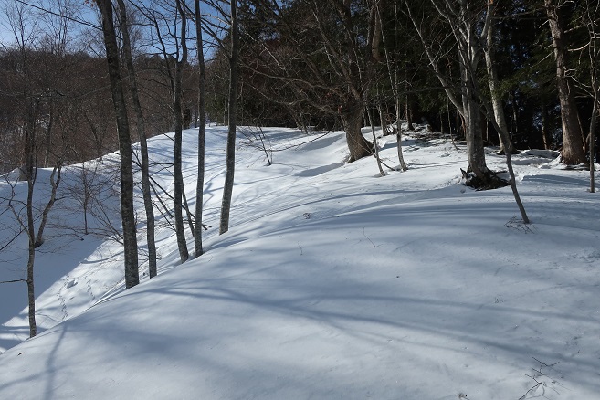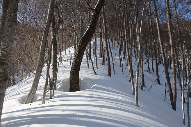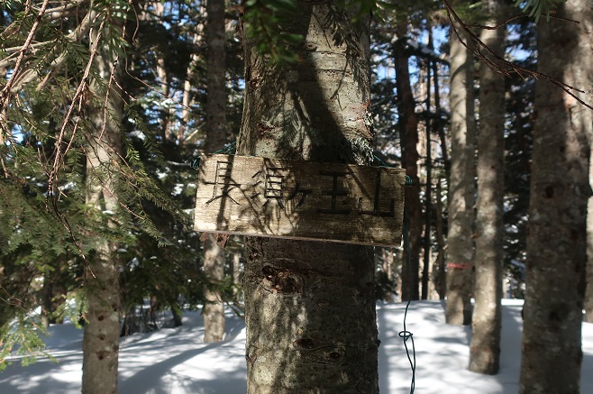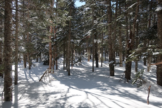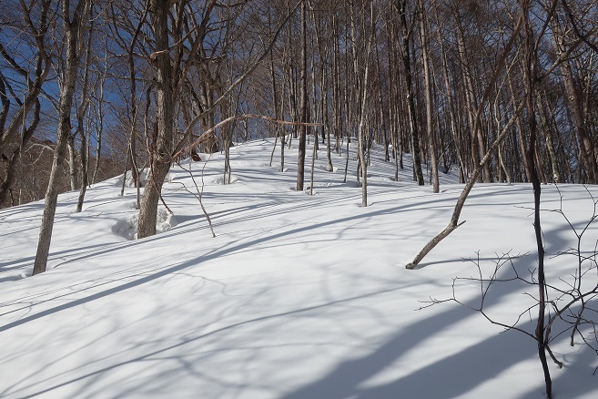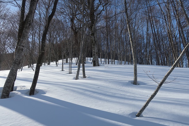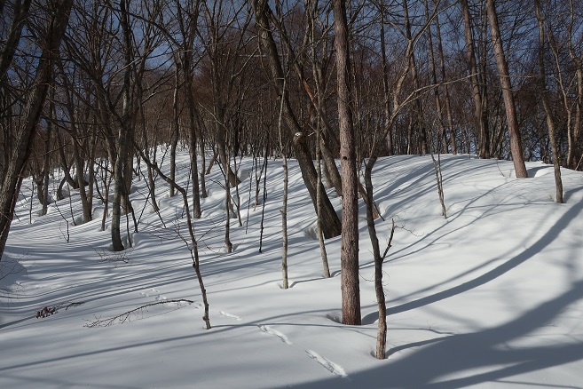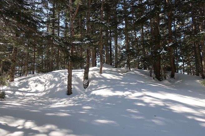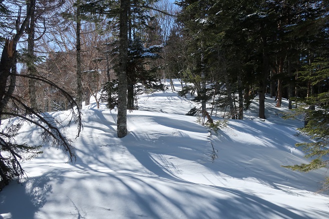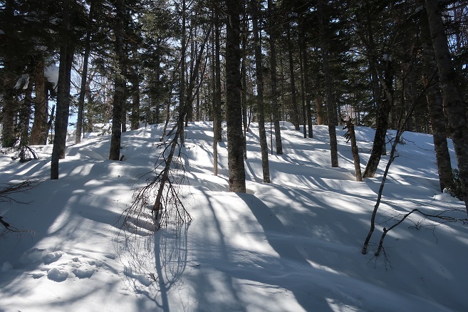1085m地点から登山道の道型があるかのような顕著な尾根に乗ると、ここも雪が予想以上に良く締っていたので、スノーシューのクライミングサポートを使って直登する。 ルーファンの必要もないほど極めて登り易い尾根で、図らずも中間点の1651m峰まで予想の半分以下の僅か1時間半ほどで登れてしまった。 1651m峰からは新雪や段つきで登高スピードは落ちたが、相変わらず登り易い尾根で傾斜も緩くなり、次第に樹間が詰まっていく山頂まで僅か1時間ほどで登れてしまった。 太く高い木々に囲まれた山頂からの展望は全く無かったが、むしろそれがこの寂峰には似合っているかのように思えた。