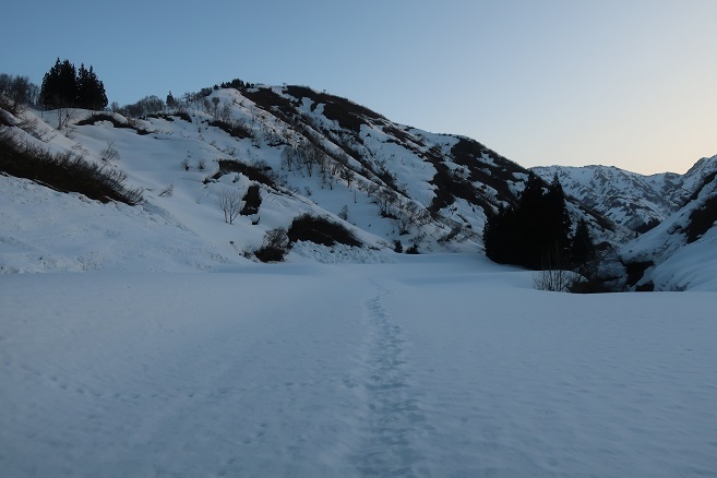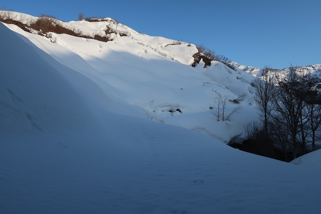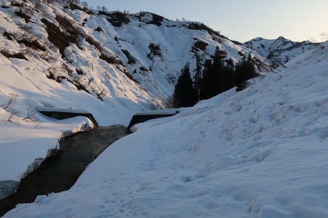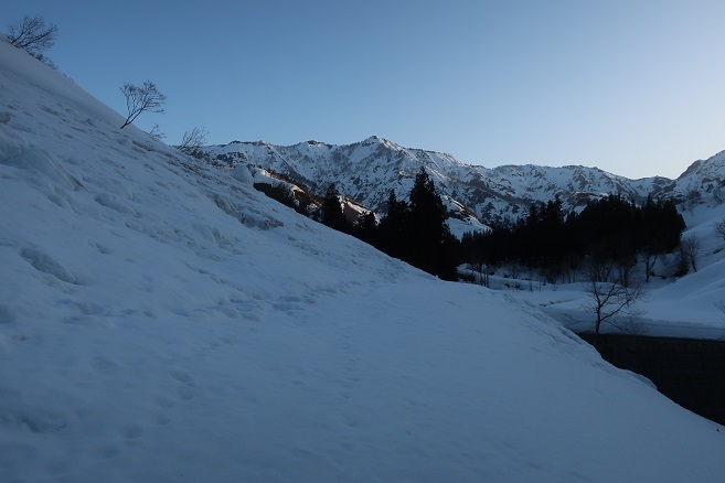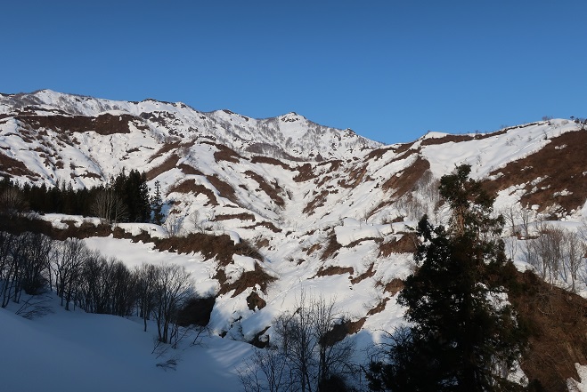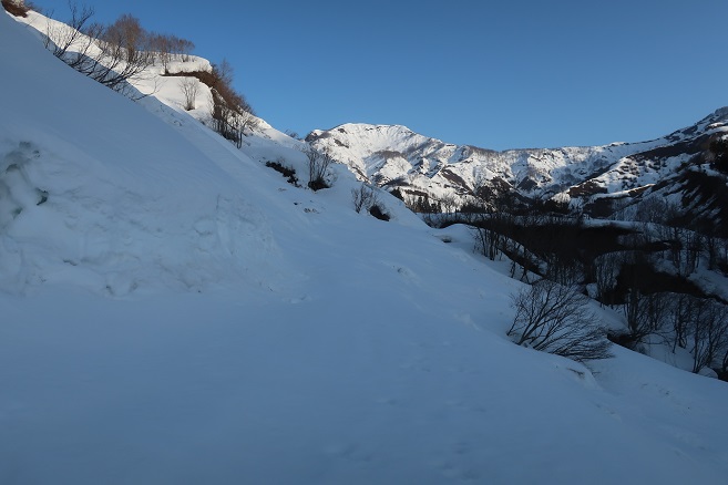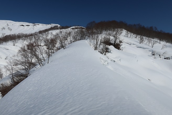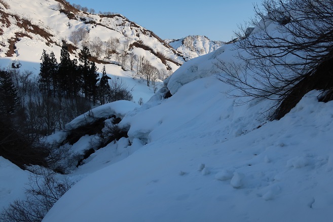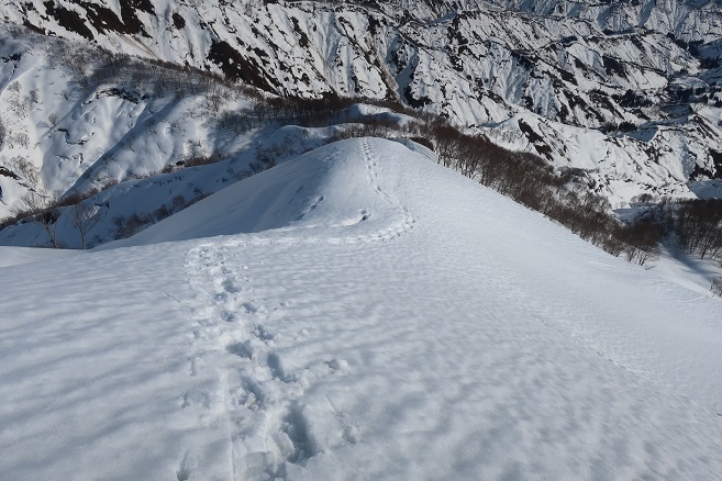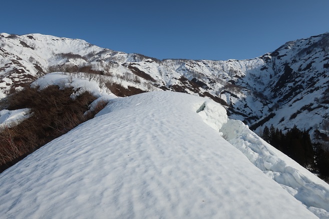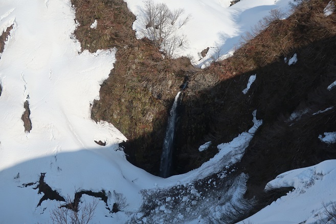 中子沢の集落から手ノ又登山口へ3キロほど未除雪の林道を歩く。 デブリが多い林道には複数の古いトレースが見られたが、途中の林道の分岐から違う方向に向かっていた。 分岐からは林道の道型が所々で消えていたので歩きにくく時間が掛った。 林道の終点の登山口から唐松山と上権現堂山を繋ぐ稜線の分岐へは登山道のある顕著な尾根を登る。 植林がないので終始展望が良かった。 眼下に不動滝を望む滝見台の先では尾根の雪庇が痩せていたのでアイゼンを着ける。 尾根の雪は繋がっていたが、山肌が露出している所もあり、山はすでに残雪期に入った感じだった。 稜線に近づくにつれて尾根は広くなり、登山道のある稜線分岐の手前から唐松山寄りの最低コルとなる鏡池へトラバースする。