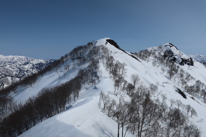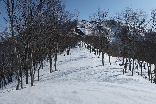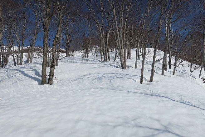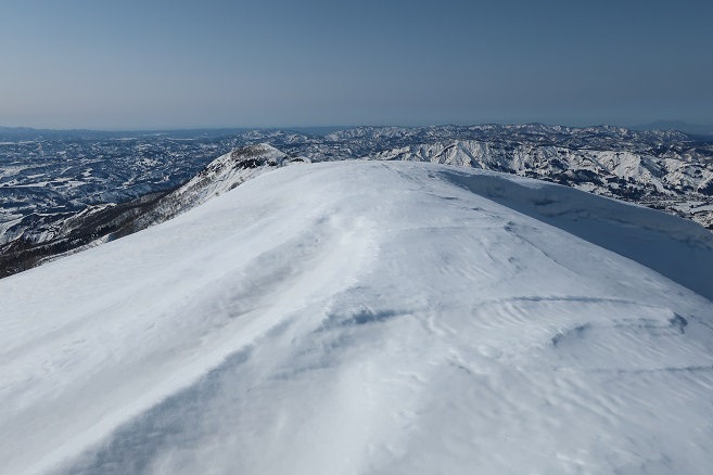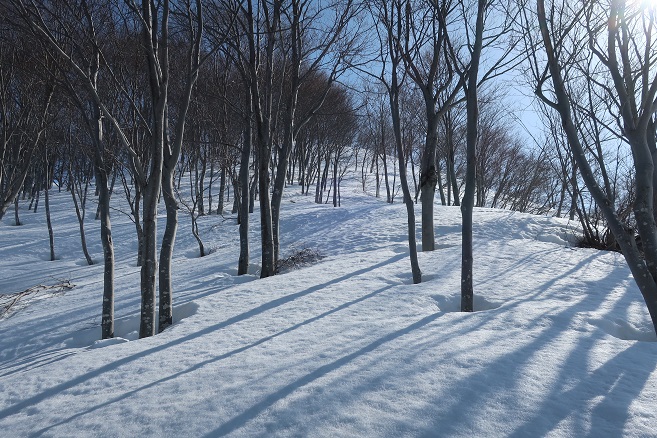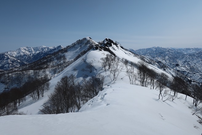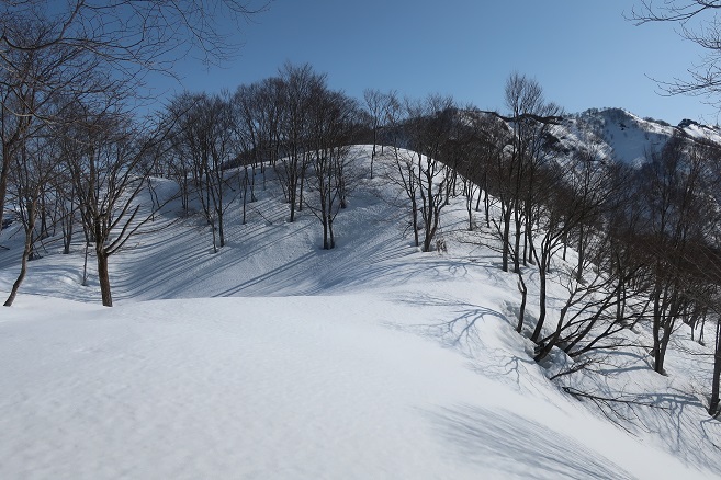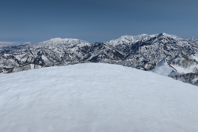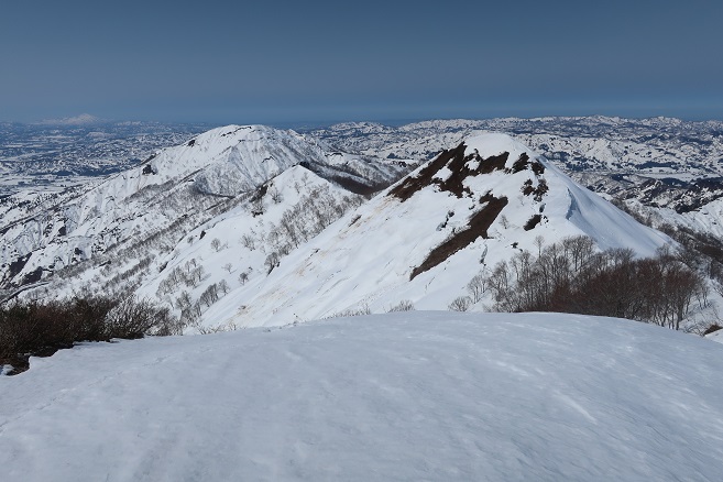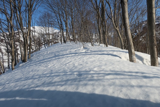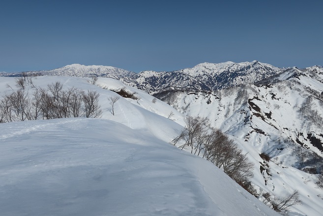 唐松山からは登りの半分の時間で鏡池まで下れたので、計画にはなかったが上権現堂山を往復することにした。 雪が柔らかくなってきたので、アイゼンからスノーシューに履き替える。 ルート上には急な斜面が少しあったが、痩せ尾根など困難な所はなかったのでスノーシューのままで登れた。 広い上権現堂山の山頂には下権現堂山方面からの古いトレースが見られた。 一年ぶりの山頂からの展望は記憶に新しく、唐松山と同じように秀逸だった。 上権現堂山を登ったことで山行の印象度は更に深まった。