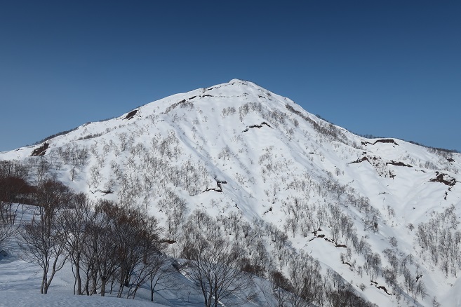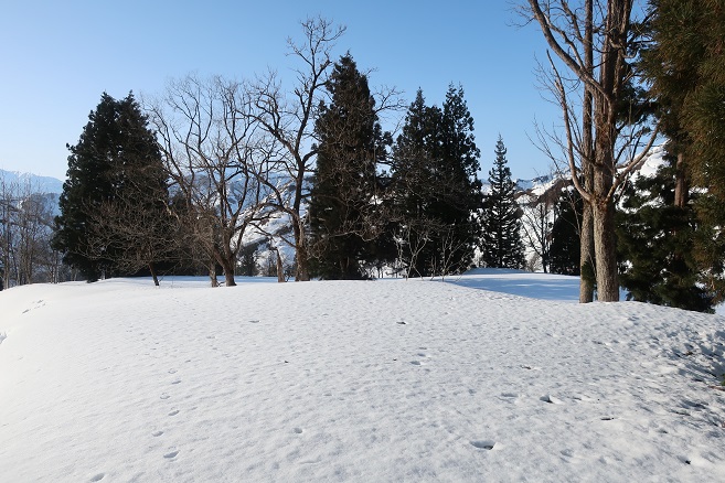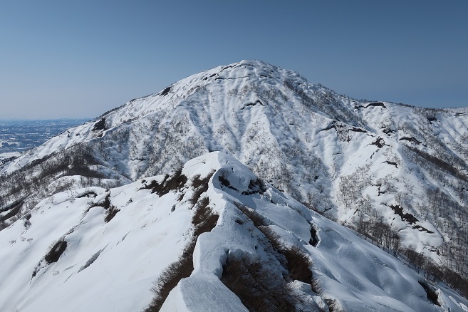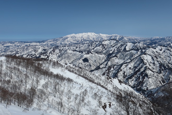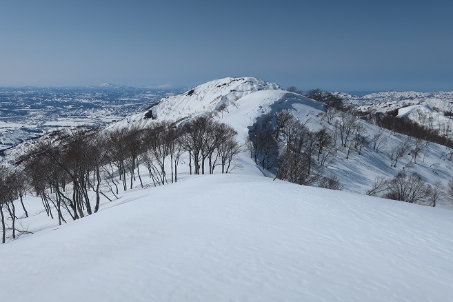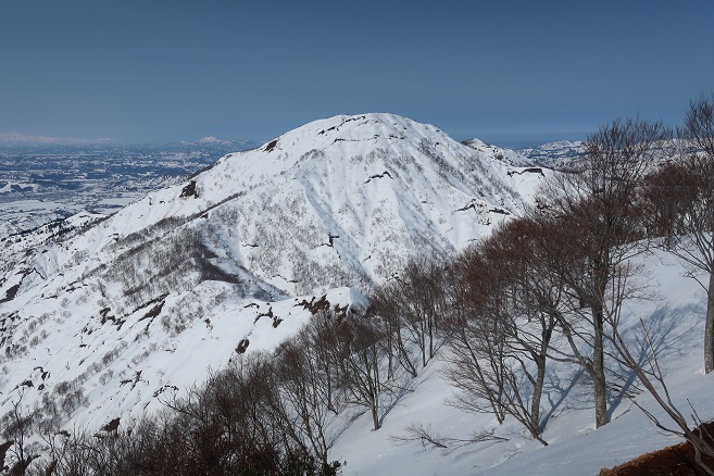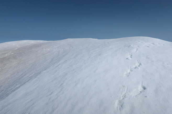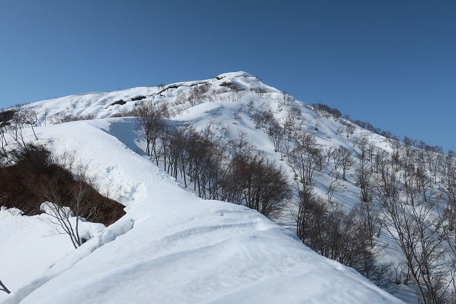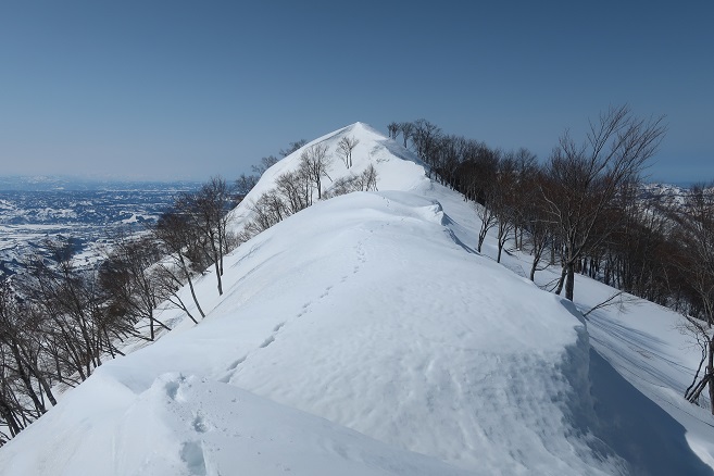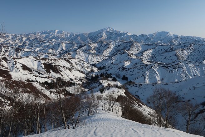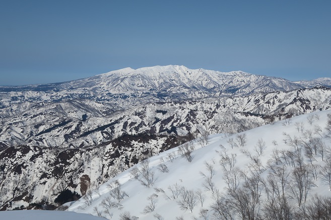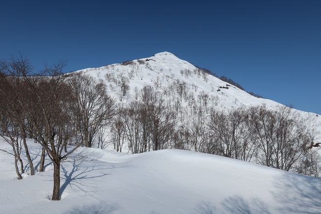 唐松山からは登りの半分の時間で鏡池まで下れたので、計画にはなかったが上権現堂山を往復することにした。 雪が柔らかくなってきたので、アイゼンからスノーシューに履き替える。 ルート上には急な斜面が少しあったが、痩せ尾根など困難な所はなかったのでスノーシューのままで登れた。 広い上権現堂山の山頂には下権現堂山方面からの古いトレースが見られた。 一年ぶりの山頂からの展望は記憶に新しく、唐松山と同じように秀逸だった。 上権現堂山を登ったことで山行の印象度は更に深まった。