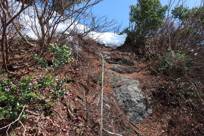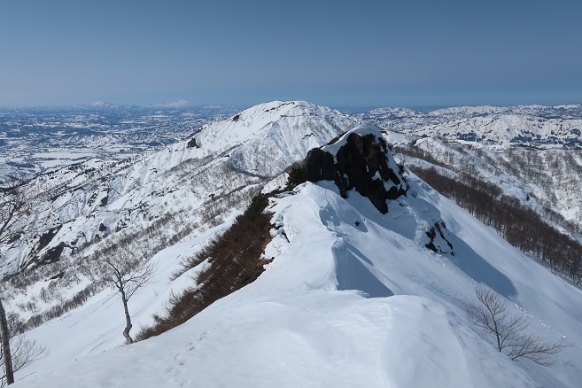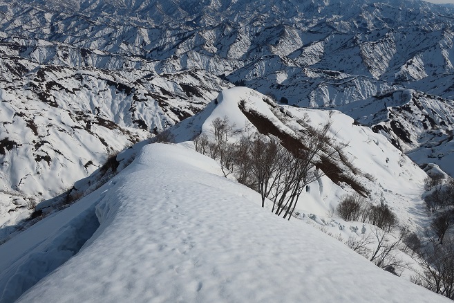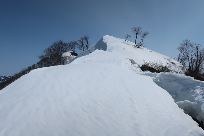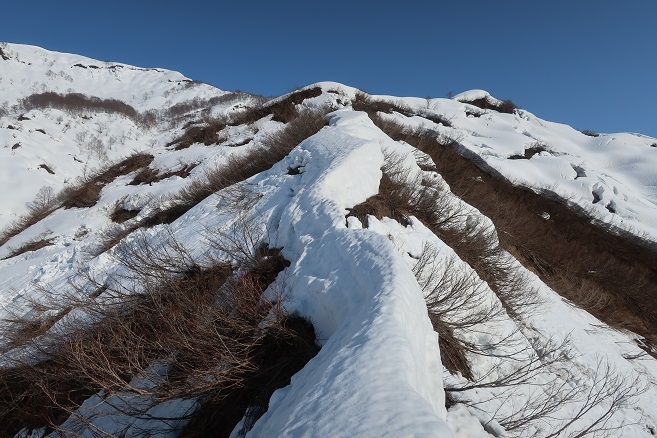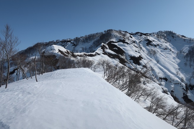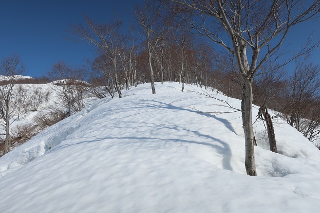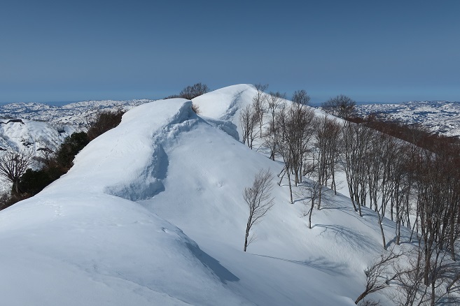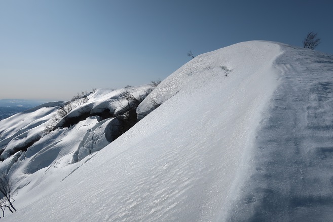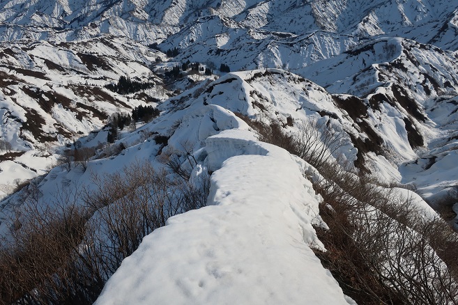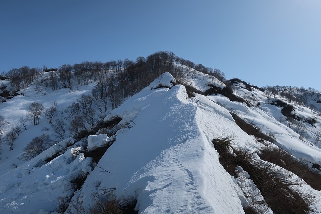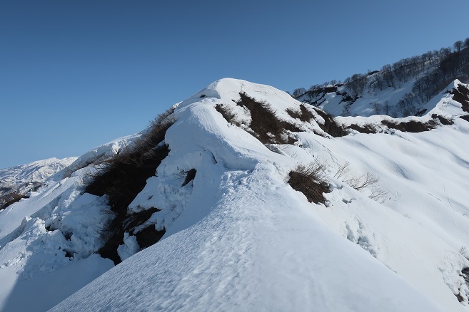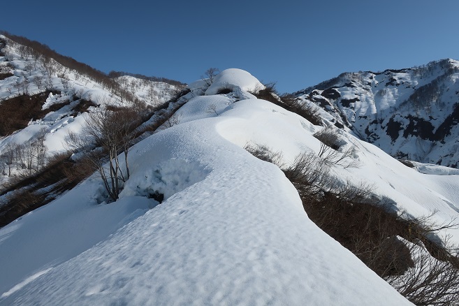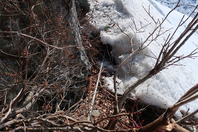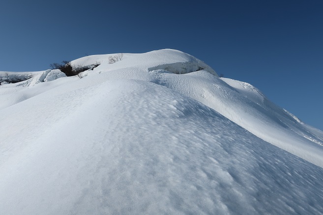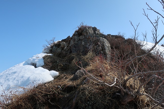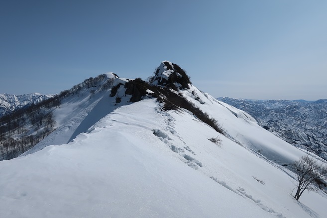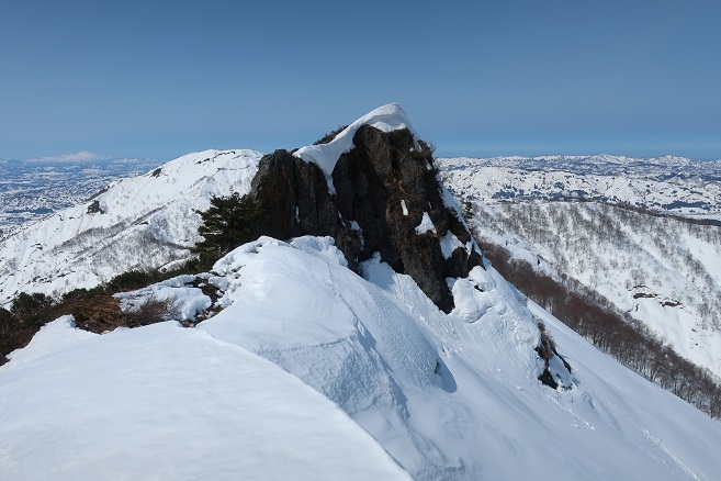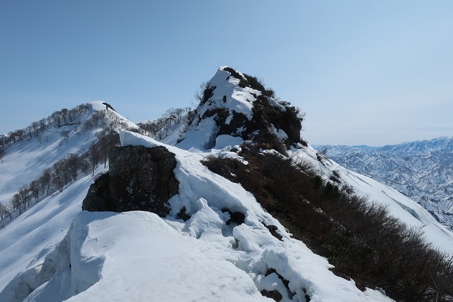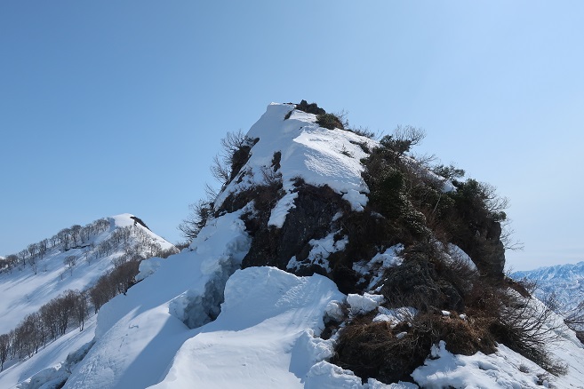 雪に埋もれた鏡池から最初のピークとなるいっぷく平(954m峰)へは快適な尾根の登高だと思われたが、尾根の雪庇が痩せている区間の通過に難儀した。 雪のドームとなっていたいっぷく平は360度の展望が利き、猫岩を挟んで唐松山への稜線がすっきり見渡せた。 いっぷく平からは稜線漫歩となり、労せずして猫岩の基部まで着いた。 今回の核心と思えた猫岩の岩塔の基部に着くと、登山道が一部露出していたので、これを辿って簡単に猫岩に登れたが、猫岩から先の岩場は垂直の崖で下ることが出来なかった。 仕方なく基部に戻って左右に巻き道を探すと、右側に太い固定ロープの一部が見えたので、登山道は猫岩の基部を右から巻いていることが分った。 猫岩の基部の通過は急斜面のトラバースとなったので、帰路の安全を担保するために両足が置けるほどの立派な足場を時間を掛けて作りながら進むと、20メートルほどでミックスの薮に取り付くことが出来た。 薮をかき分けながら進むと、登山道に張られた固定ロープが見え、何とか猫岩を通過することが出来た。