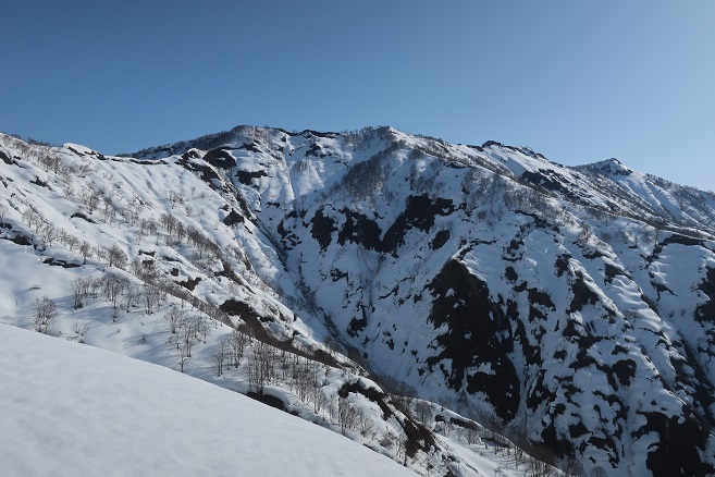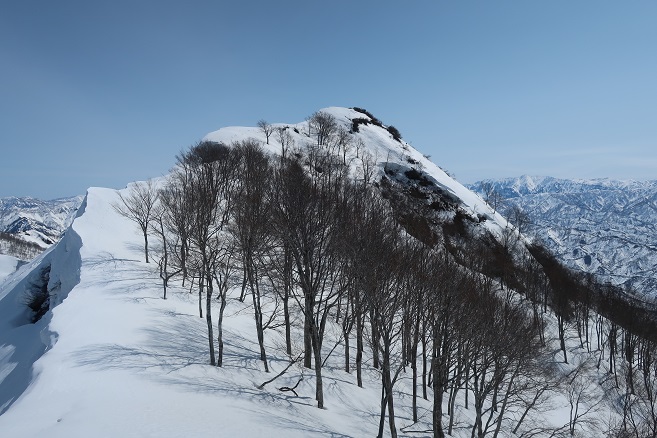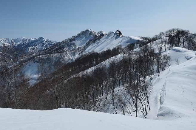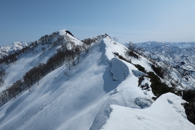 猫岩から先はビクトリーロードとなり、前衛峰の通過も全く苦にならず意気揚々と唐松山に向かう。 唐松山への登頂は正午になってしまったが、快晴無風の天気が続いていたので、期待以上の素晴らしい展望を満喫出来た。 予想どおり残雪期の唐松山は変化に富み、とても印象に残る山だった。