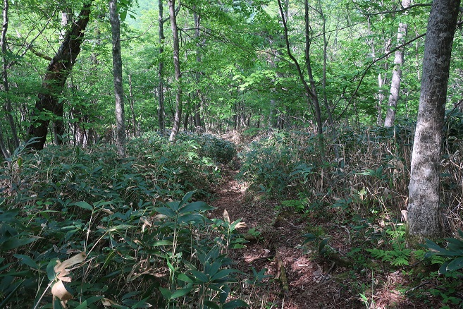 伏美岳の登山口となる伏美小屋へのトムラウシ沢林道は2016年夏台風で崩壊したため、林道入口のゲートから伏美小屋まで7キロほど歩く。 平日だが天気が良いのでゲートの前には登山者の車が2台停まっていた。 今日の行程は伏美岳までと短いので7時半のスタートしたが、昨日から全道的に真夏日となっていることで朝から気温が高くて既に暑い。 明日の行程は長いので、意識的にこまめに休憩を取りながらゆっくり歩く。 林道の崩壊箇所は多かったが、既に復旧している他の林道の状況を考えると、林道としての役割が薄いためだろうと思われた。 意外にも林道にはヒグマの糞は見られず、不思議とその気配も感じられなかった。