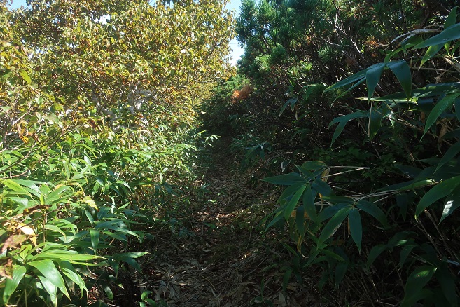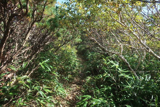 登る前はネガティブなイメージが強すぎたが、登山口から間もなくブナの木々が見られるようになり、登山道は北海道の山とは思えないほど良く整備されていて、そのせいかヒグマの気配はあまり感じなかった。 登山道には1合目毎に新しい標識があり、笹藪に覆われた中間点の5合目(915m地点)で初めて前山の臼別頭(1251m)方面が見えるようになったが、頂稜部は毎朝発生するような厚い雲に覆われていた。