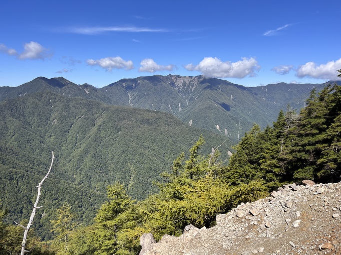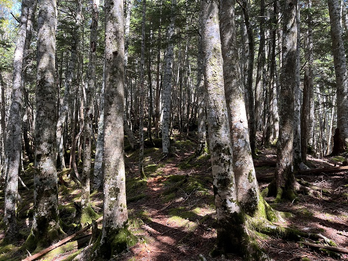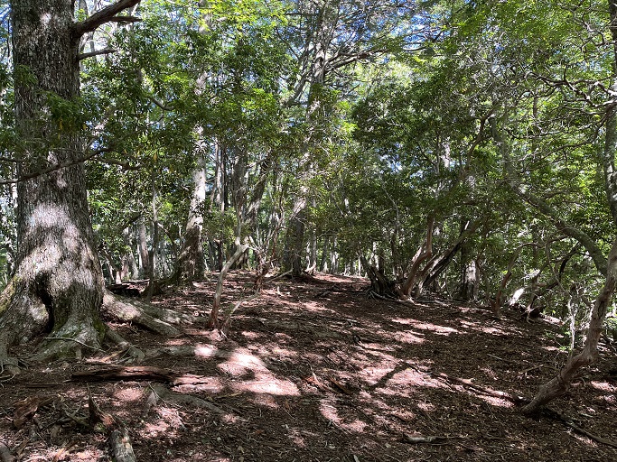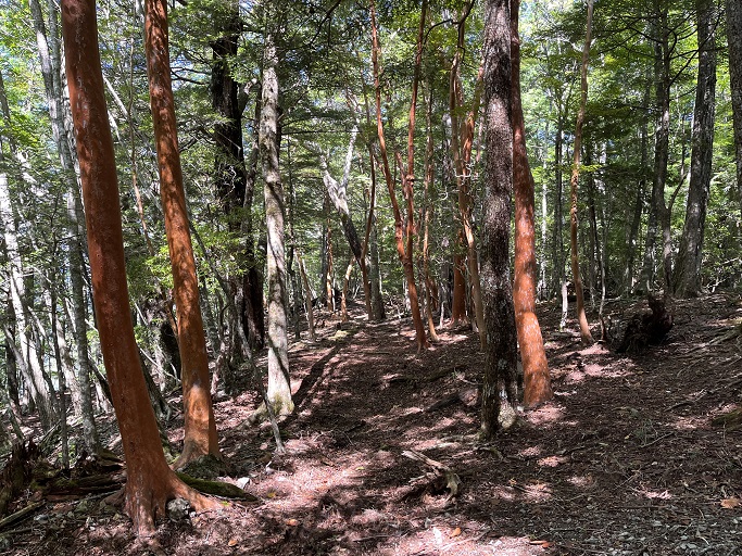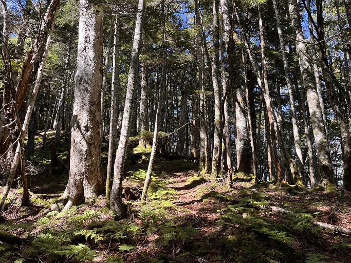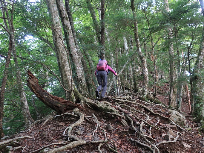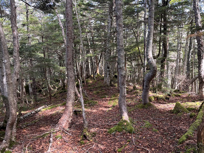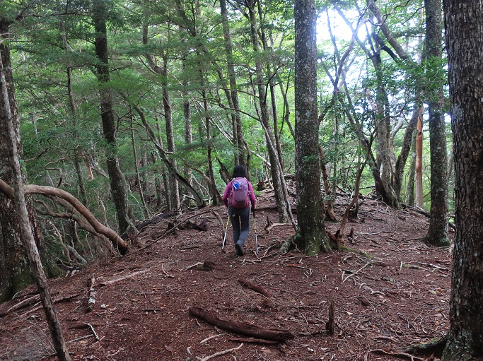 静岡市葵区・川根本町の大根沢山(2239m*静岡の百山)を田代沢ノ頭(2112m)を経て登った。 地形図に登山道は記されていないが、ネットの記録を参考にして林道途中の送電線の巡視路の入口から顕著な尾根を辿って登った。 深南部の山だが予想よりも踏み跡は濃く、藪も全くなかったので、ピンクリボンが付けば実線の登山道と遜色がないように思えた。