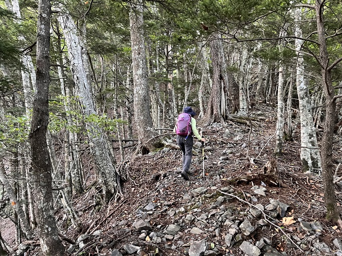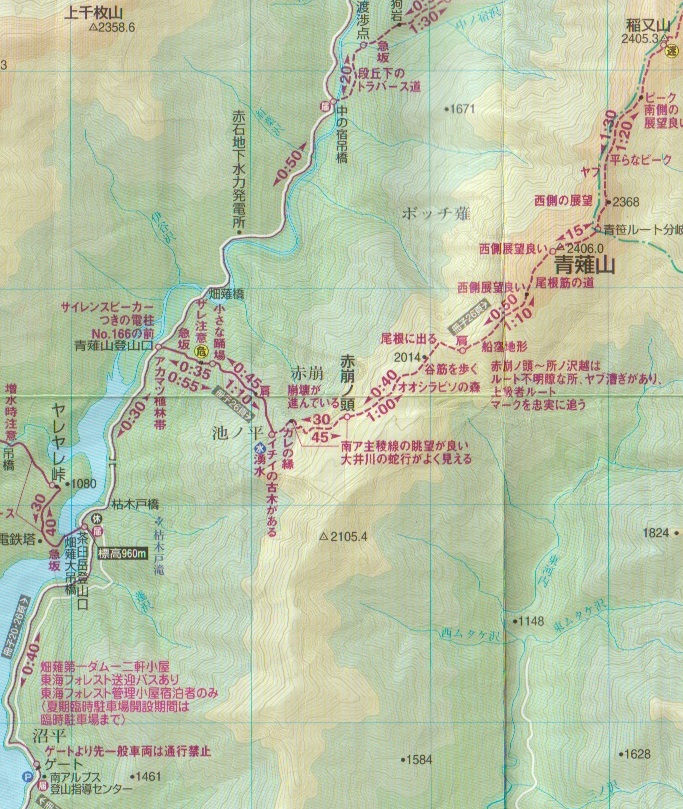 静岡市葵区の青薙山(2406m*静岡の百山)と隣接する静岡市葵区・山梨県早川町の稲又山(2405m*日本の山1000)を登った。 昭文社の登山地図では池ノ平から稲又山方面の登山道が破線になっているが、近年登山者が増えたようで踏み跡は実線並にあった。 両山とも山頂からの展望は得られなかったが、豊富な水が湧き出している池ノ平や、赤崩という崩壊地の特異な風景が印象的だった。