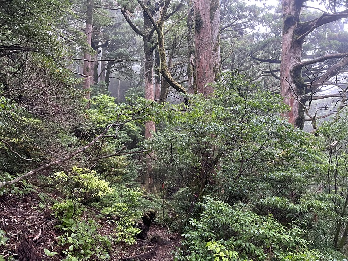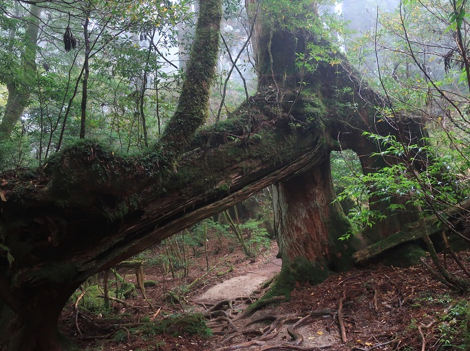 鹿児島県屋久島町の太忠岳(1497m)を登った。 ルートの前半はヤクスギランドの散策路になっていて、樹齢2600年の母子杉などのヤクスギが見られた。 未明から屋久島特有の湿った霧が湧き、この山のシンボルの高さ50mほどの山頂の天柱石がすっきり望めなかったことが残念だった。