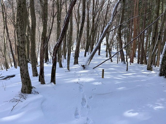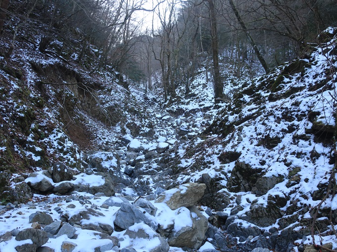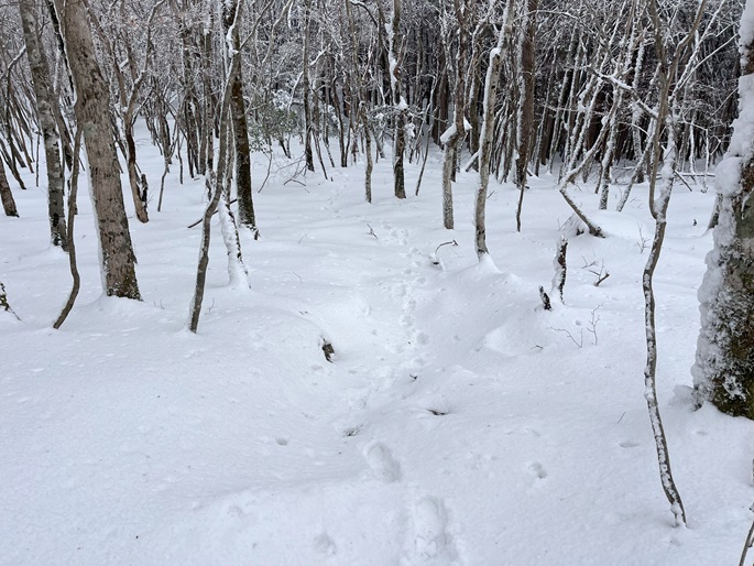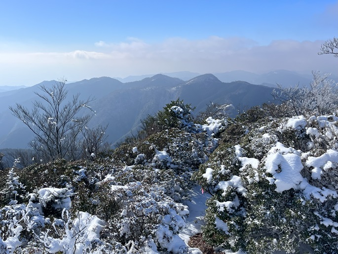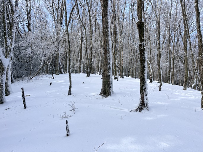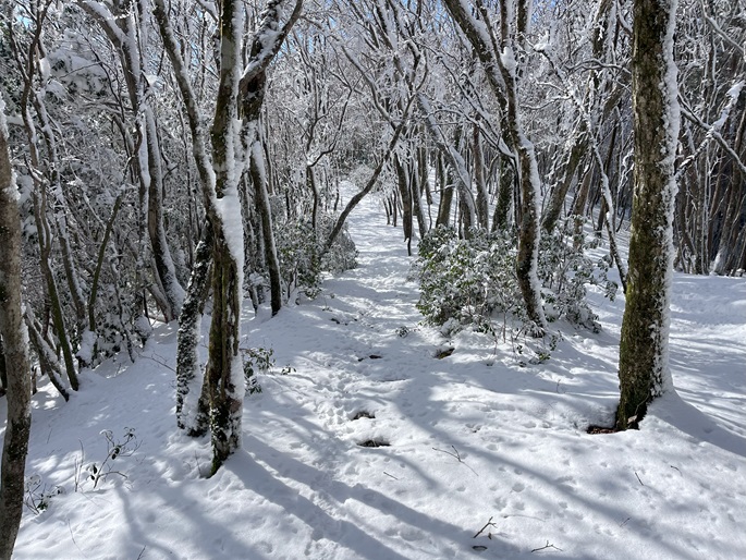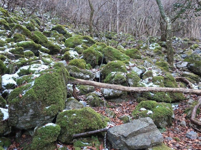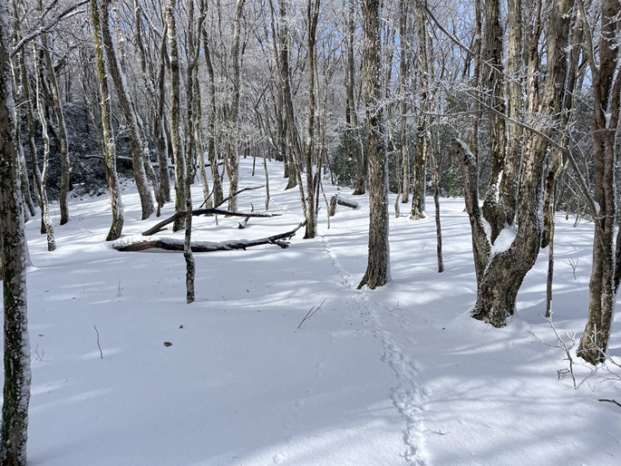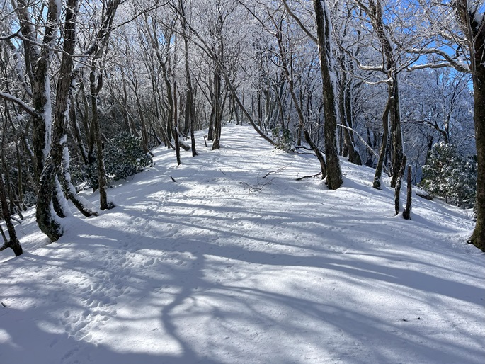 熊本県山江村・相良村の仰烏帽子山(1302m*日本の山1000*九州百名山)を登った。 元井谷登山口へアプローチする林道は昨今の水害で崩壊していたため3キロほど歩いた。 登山口から涸れた沢を辿る登山道も土石流により荒れていてた。 九州に大雪が降ってから5日が過ぎたが、予想どおりトレースはなく膝下の軽いラッセルとなった。 予報どおり天気は良かったが、霧のため山頂からの展望が冴えなかったことが惜しまれた。