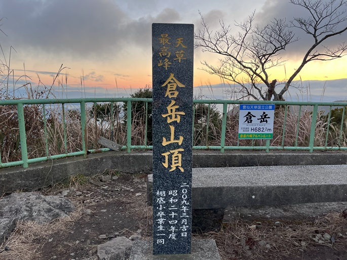 熊本県天草市の倉岳(682m*日本の山1000*九州百名山)を登った。 尾根続きの矢筈嶽(626m)まで縦走する計画だったが、直前の次郎丸岳への登山が天気待ちで半日遅れとなってしまったので、山頂に通じる車道の終点手前から倉岳神社の参道を登った。 登頂は日没直後になってしまったが、一等三角点が置かれた山頂からは天草諸島の眺めが良かった。