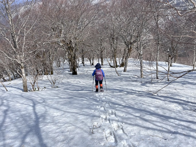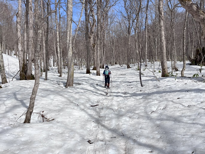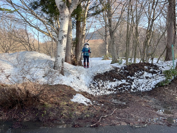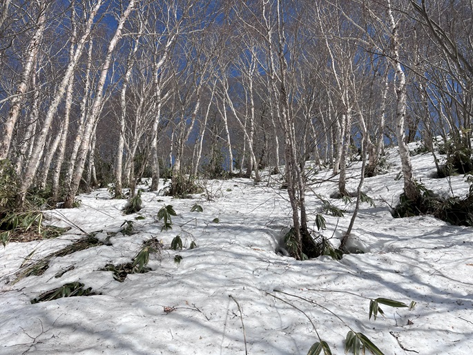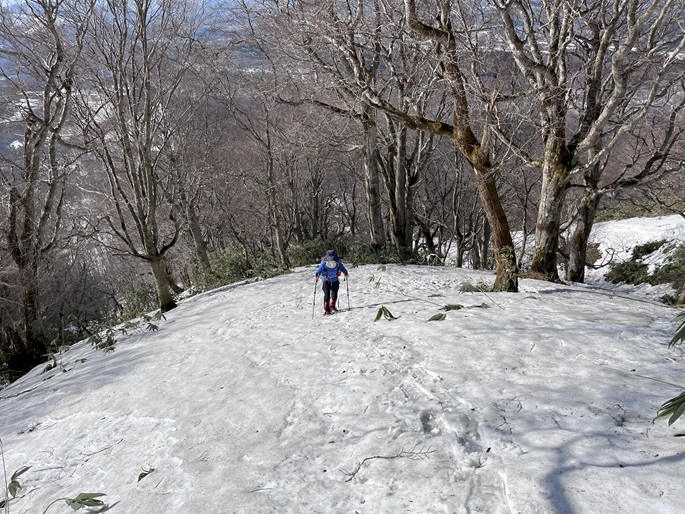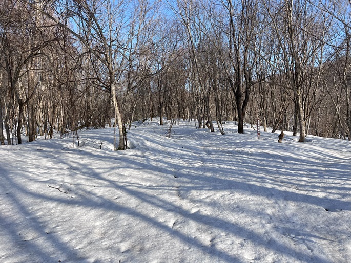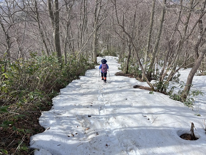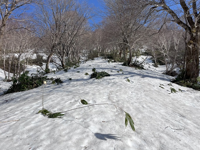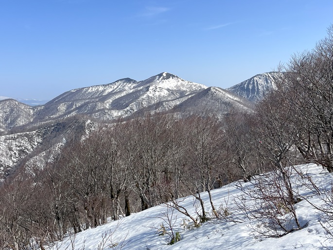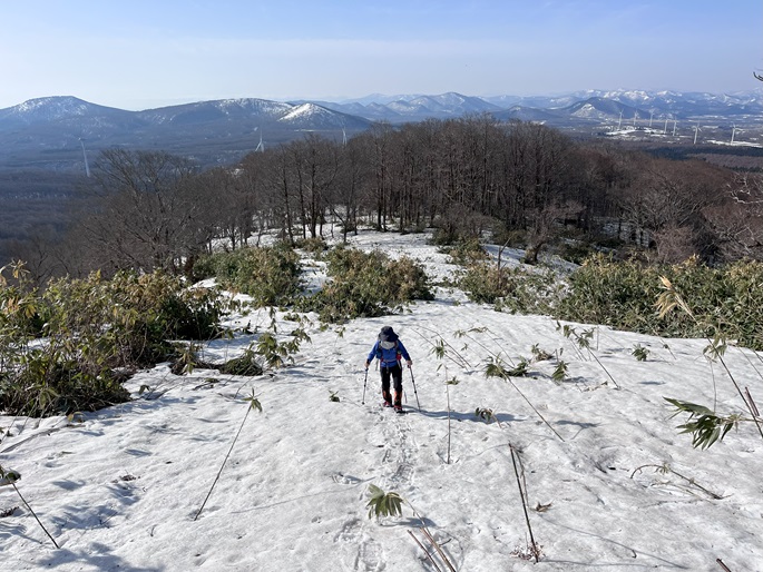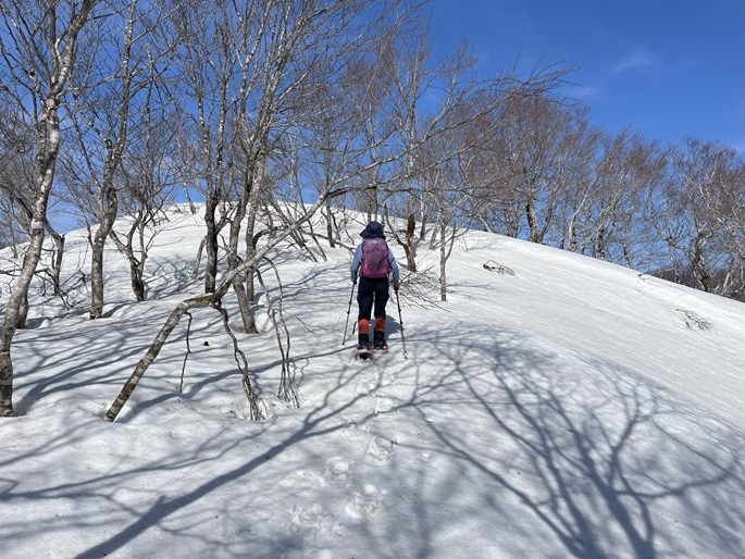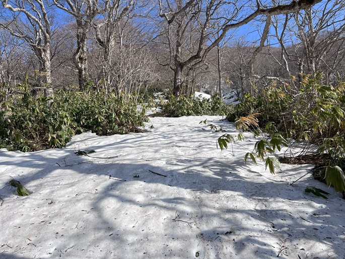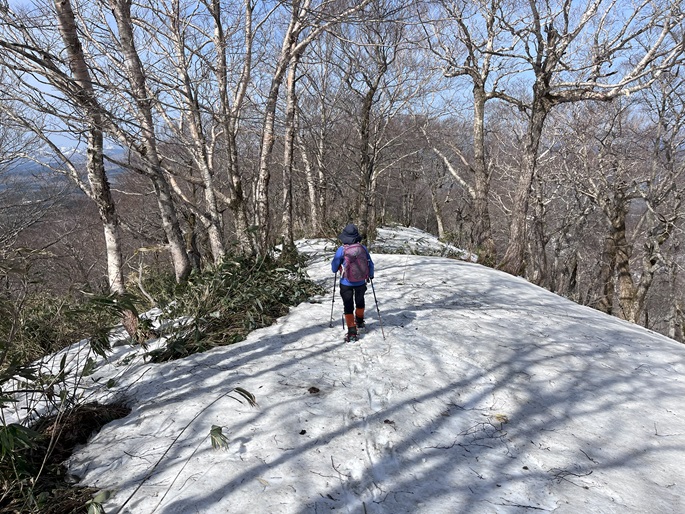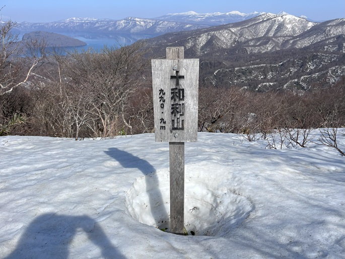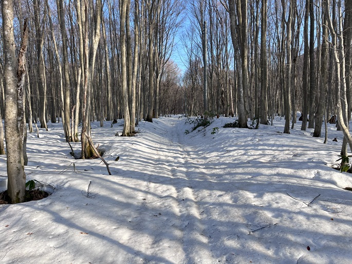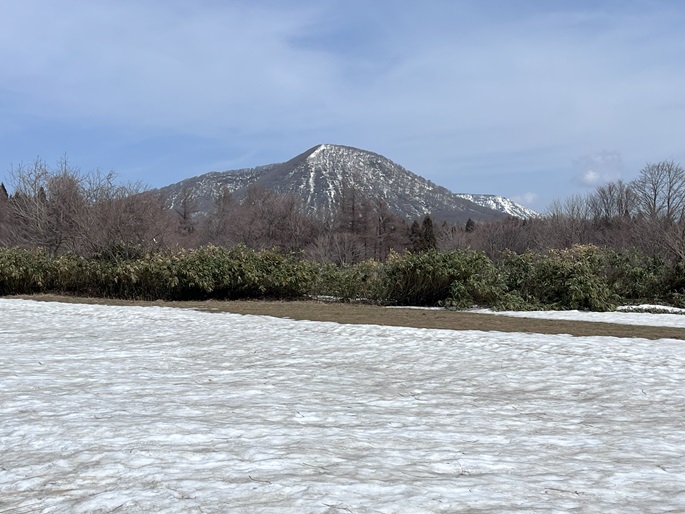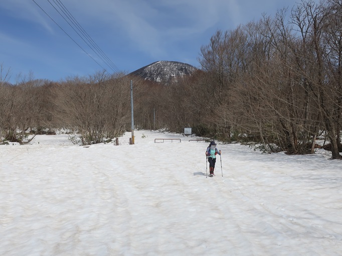 青森県三戸町・十和田市・秋田県鹿角市の十和利山(991m*日本の山1000*東北百名山)を登った。 トレースが無かったので登山口からスノーシューを履いて登った。 勾配が急な東コースを登って西コースを下ったが、残雪期にはこの方法がベストチョイスだと思われた。