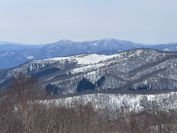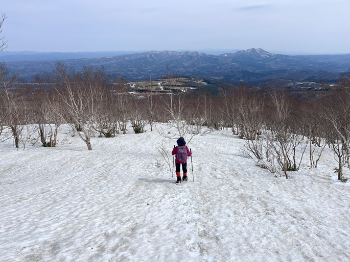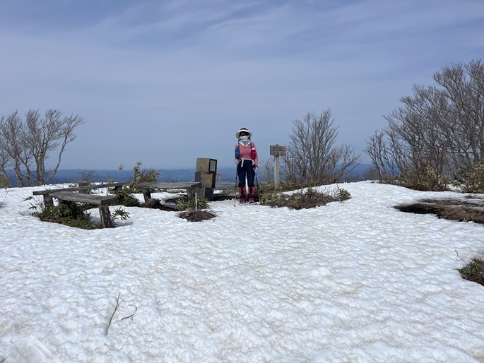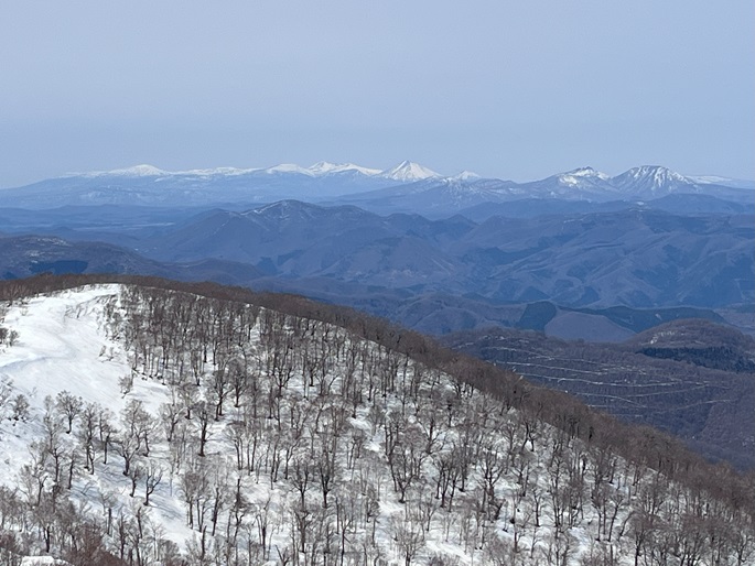 岩手県二戸市の稲庭岳(1078m*日本の山1000*岩手百名山)を登った。 残雪が豊富で登山口からスノーシューを履いて登った。 広い山頂は春霞ながら展望が雄大だった。 帰路は残雪を利用して傾斜の緩い尾根を下って周回した。