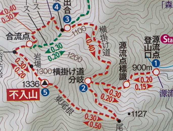 源流点登山口 〜 四万十川源流点 〜 横掛け道分岐 〜 不入山 〜 船戸林道分岐 〜 横掛け道分岐 〜 源流点登山口 (周回)