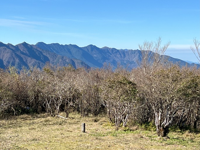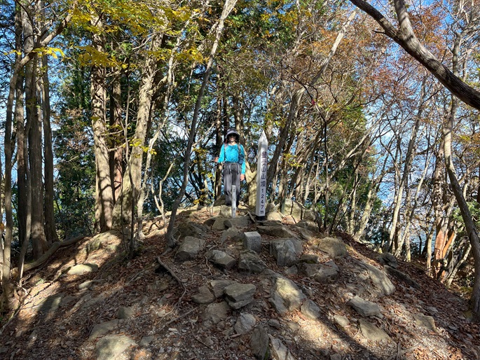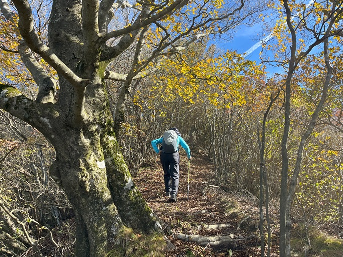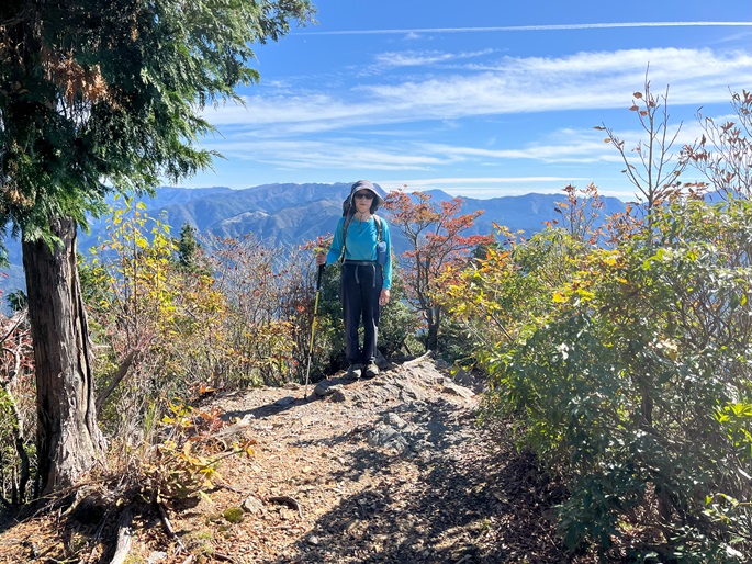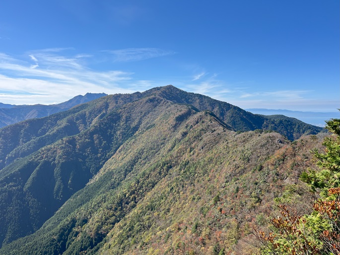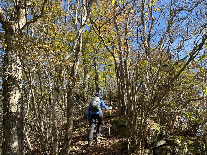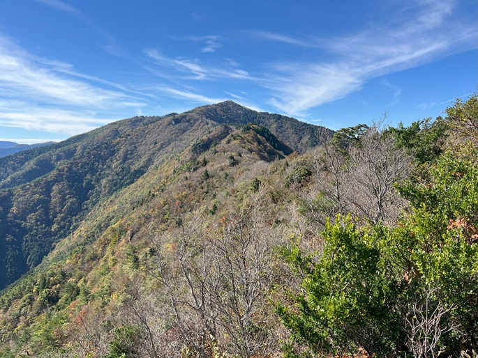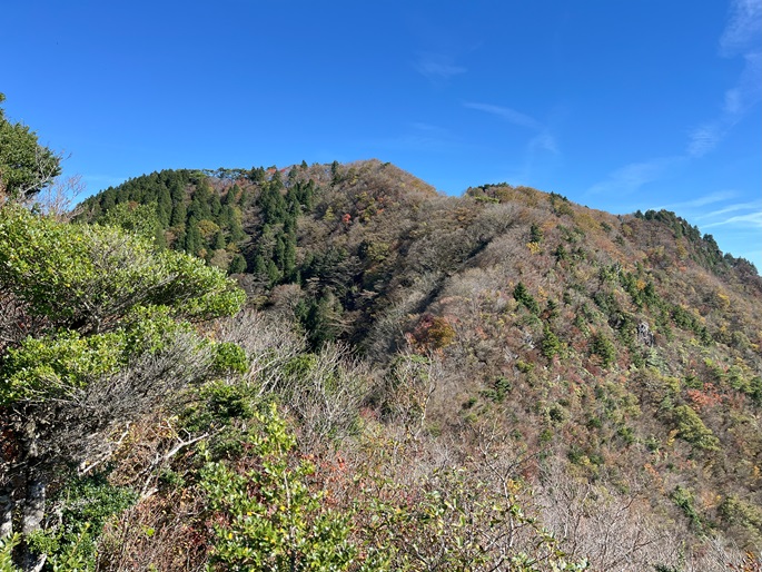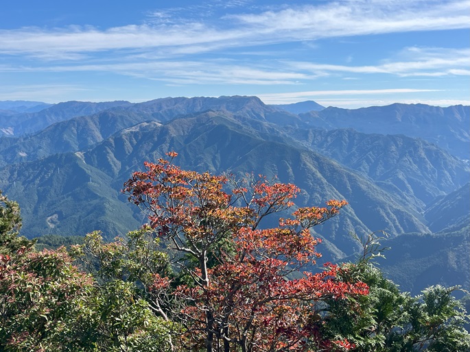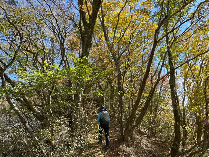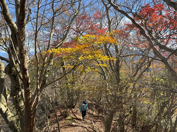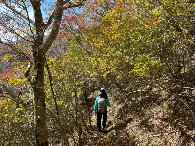 下り基調となる赤星山から豊受山への明るい稜線には紅葉が見られたが、豊受山の山頂は雑木に囲まれて展望は冴えず、頂上稜線の東端の展望台で赤星山などの展望を楽しんだ。