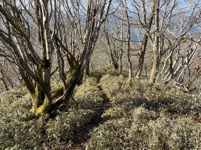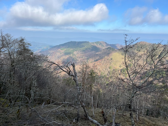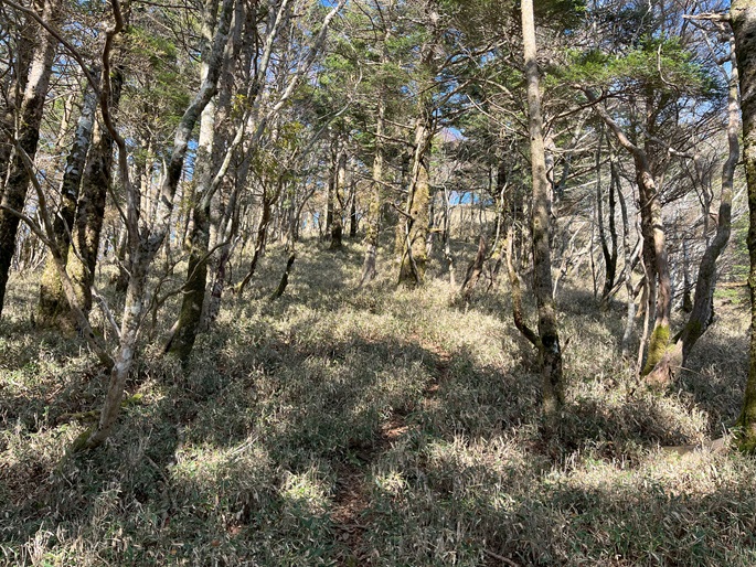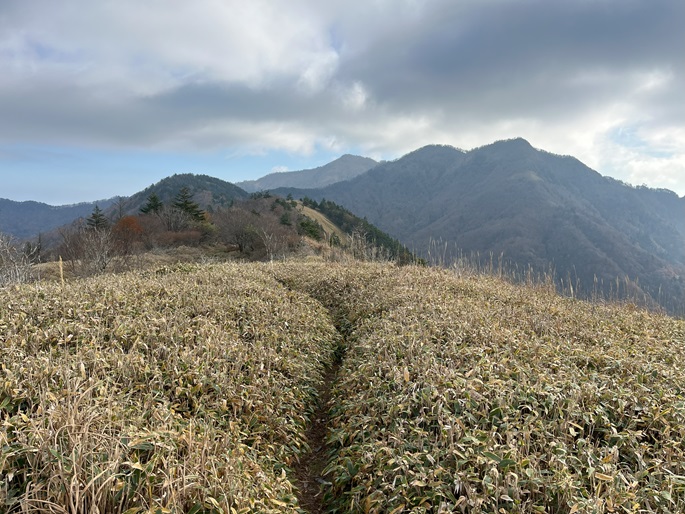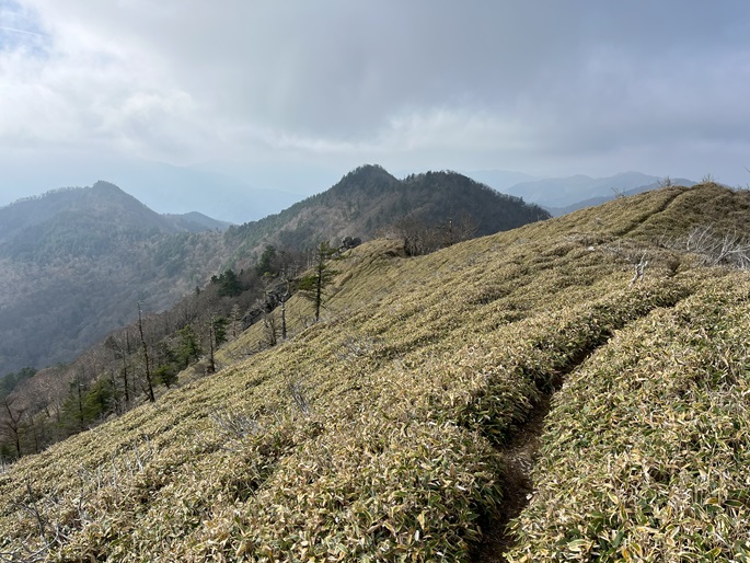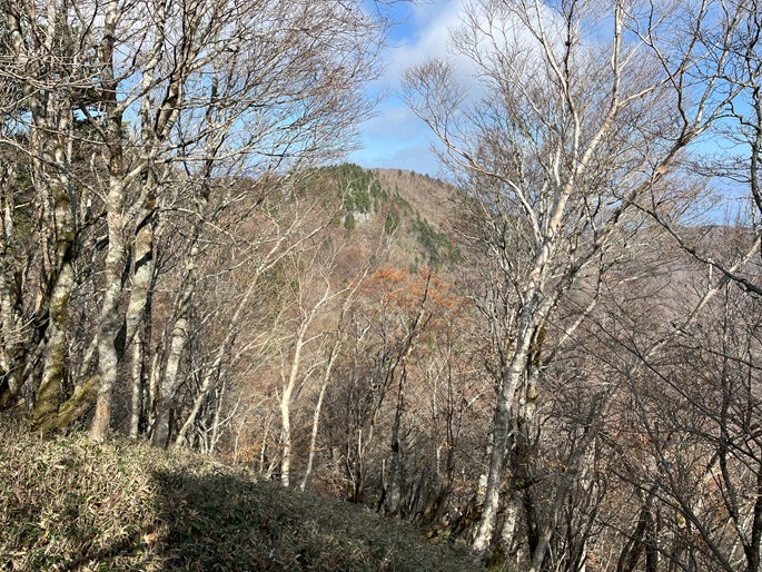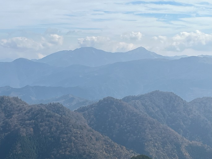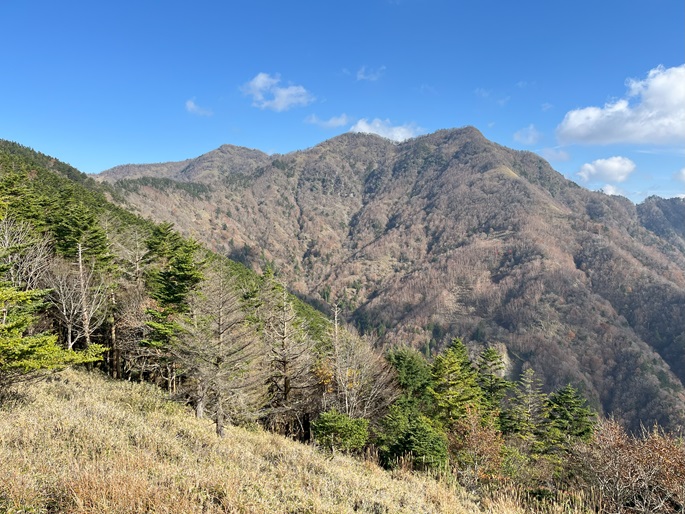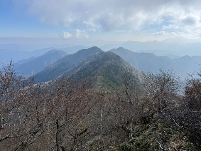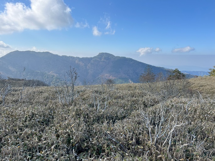 徳島県三好市の石堂山(1636m*四国百名山)を矢筈山(1848m*日本の山1000*四国百名山)を経て登った。 矢筈山の山頂からは逆光ながら昨日縦走した剣山から三嶺への長大な稜線が遠望された。