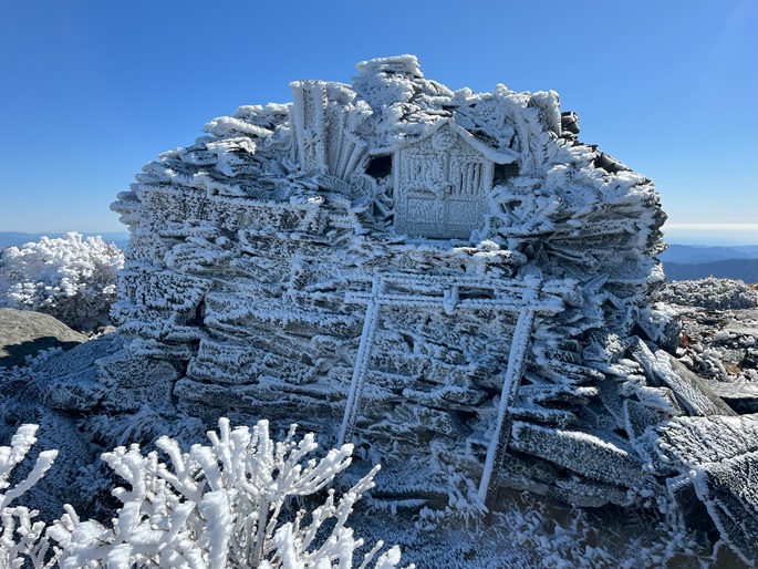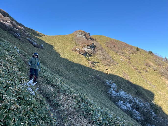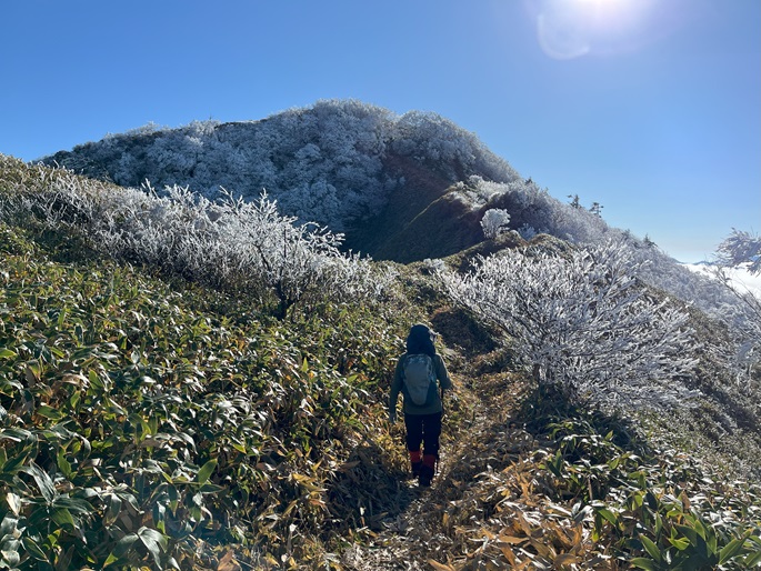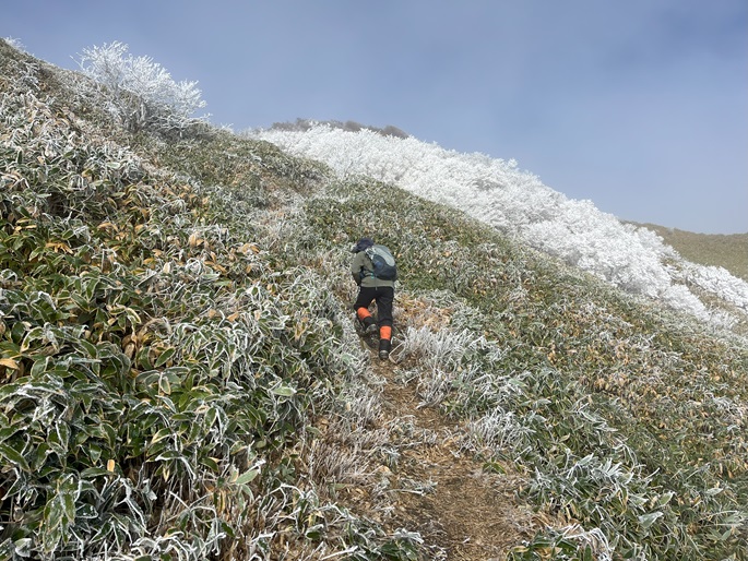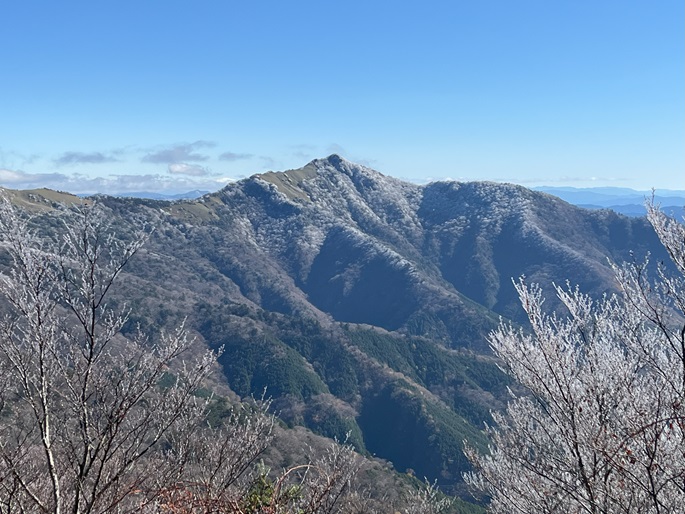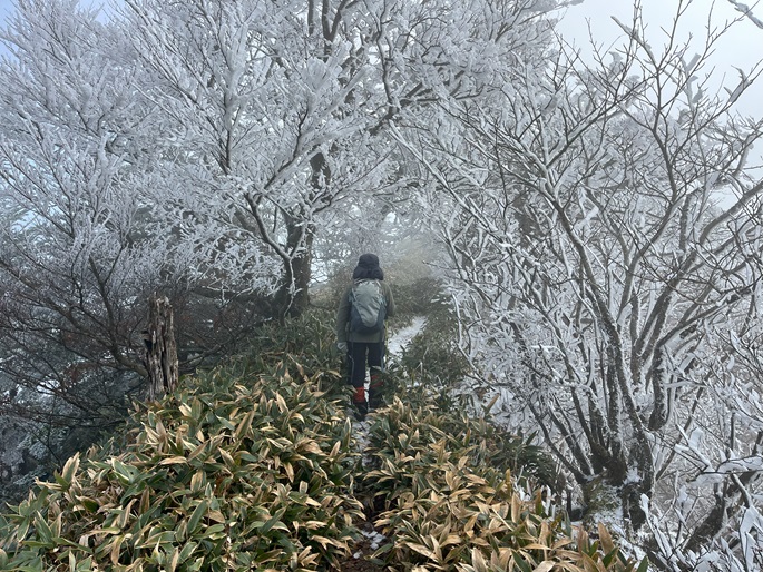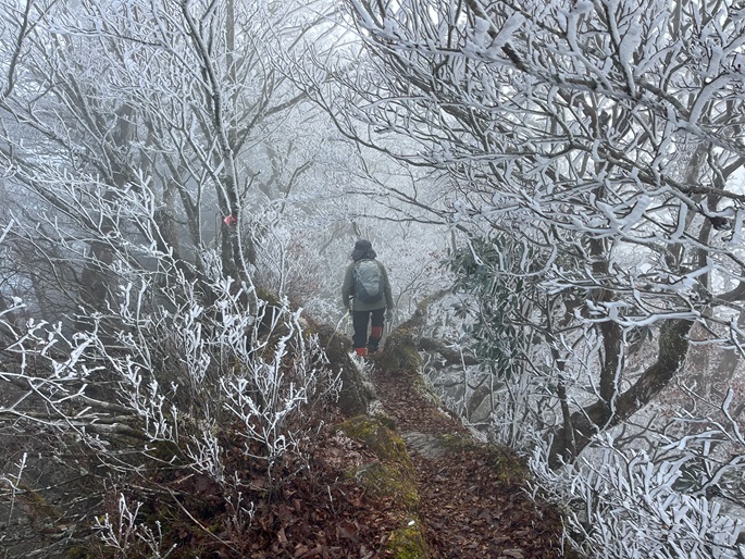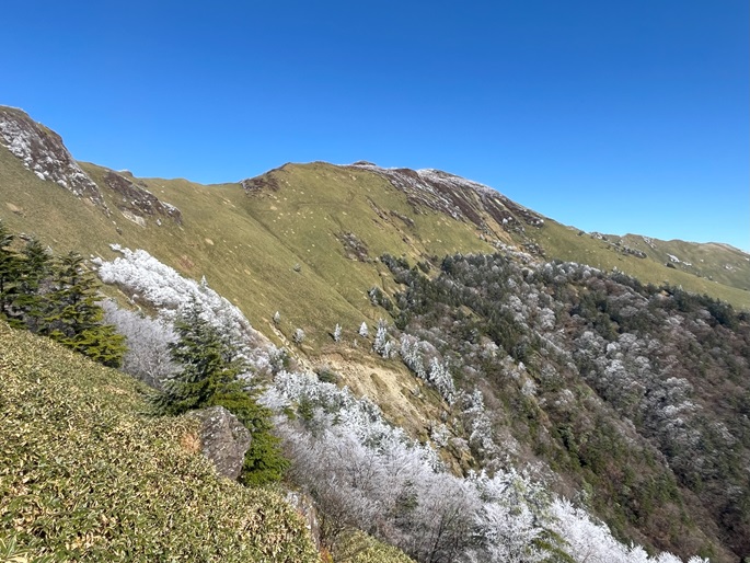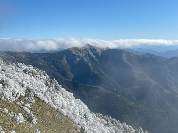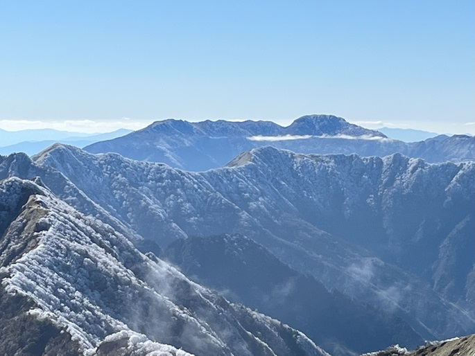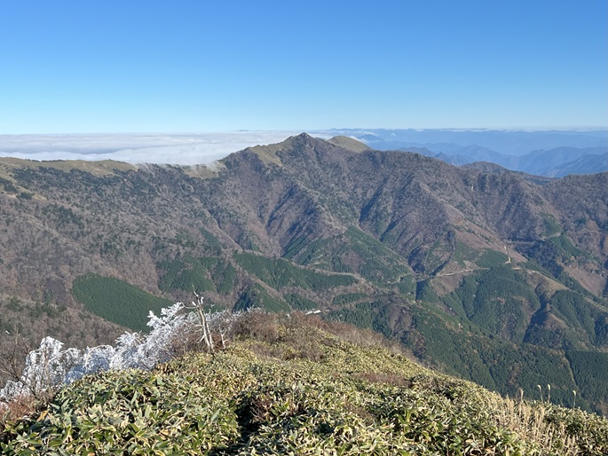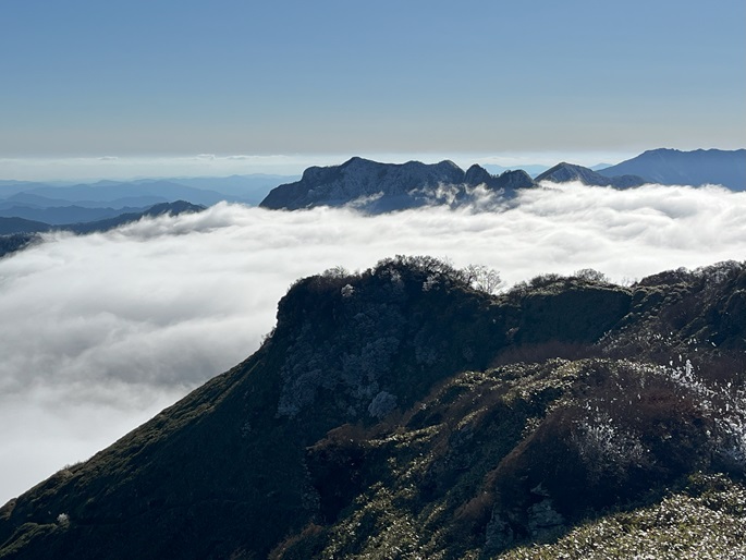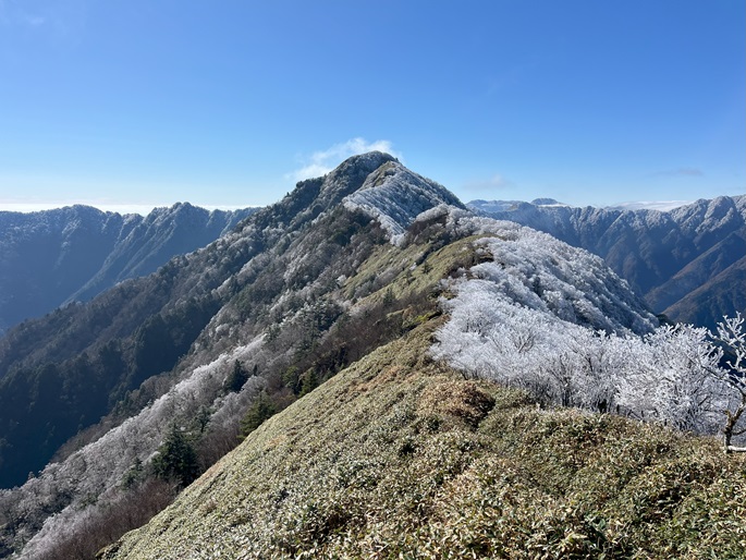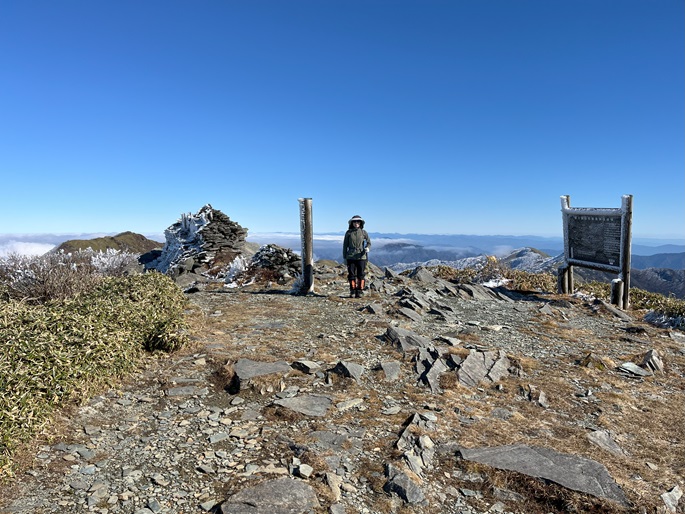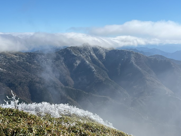 日本二百名山の未踏の山(3座)のうち、高知県いの町・愛媛県西条市の笹ケ峰(1859m*日本の山1000*四国百名山)を寒風山(1763m*日本の山1000*四国百名山)を経て登った。 笹ケ峰は20年前の1月に積雪のため途中の寒風山で敗退した山で今回ようやくリベンジが叶った。 前日の破天荒の影響で寒風山までは霧に覆われていたが、図らずも桑瀬峠から先の稜線では今シーズン初の霧氷が見られて大いに楽しめた。 意外にも笹ケ峰の手前からは笹被りが酷く、凍った笹が溶けた水で靴が浸水して難儀したが、一等三角点が置かれた山頂からの展望はそれを忘れさせるほど素晴らしかった。