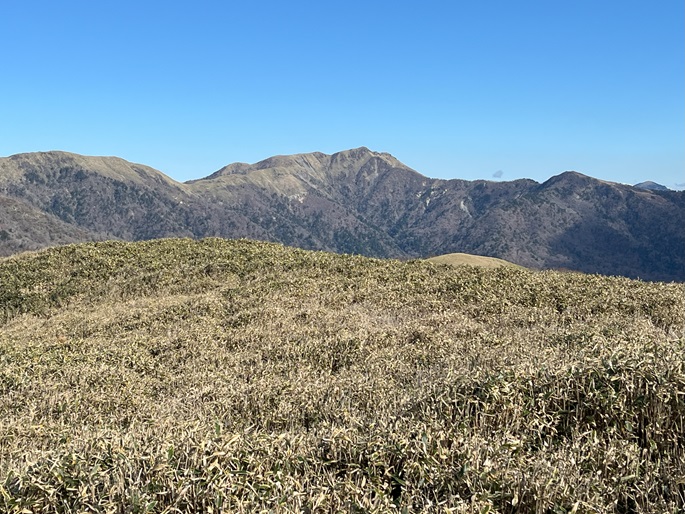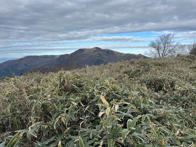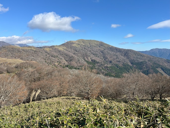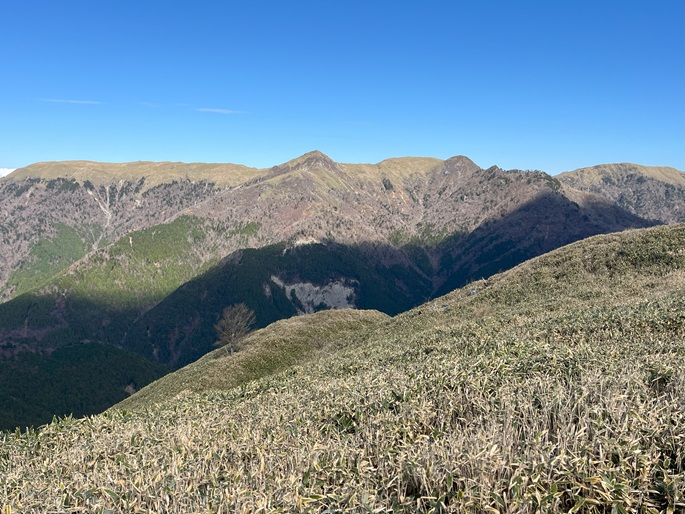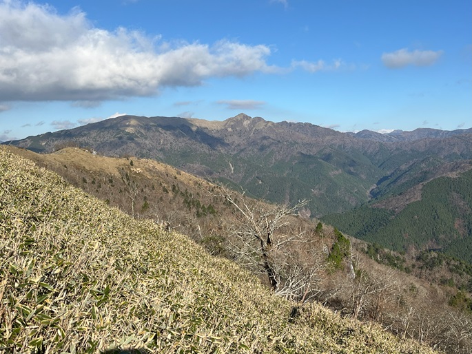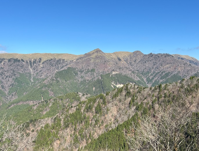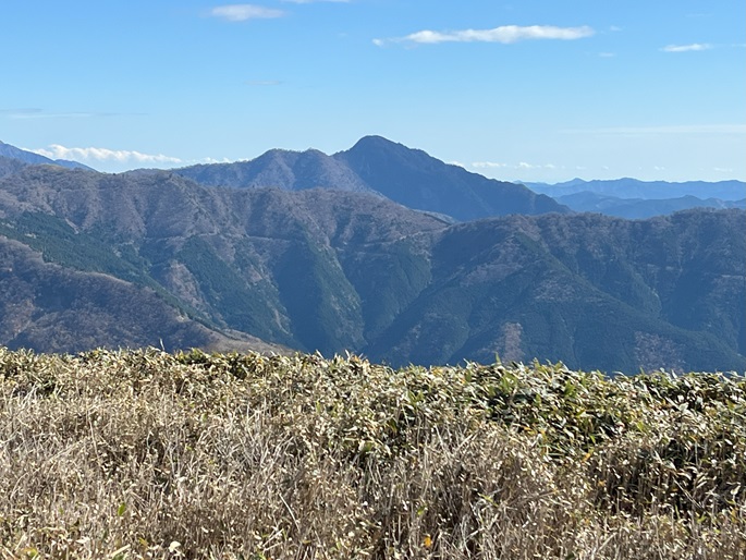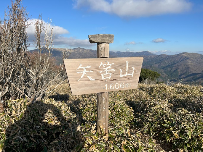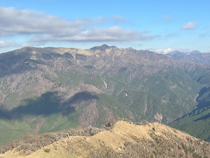 高知県香美市・徳島県三好市の土佐矢筈山(1607 m*日本の山1000*四国百名山)を登った。 午前中に登った綱附森と矢筈峠(1235m)を挟んで対峙する山で、山頂からは綱附森や天狗塚から牛ノ背の稜線の眺めが良く、石鎚山系の山々も遠望された。