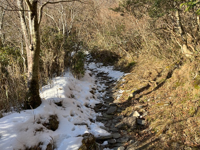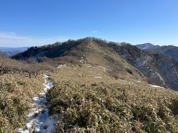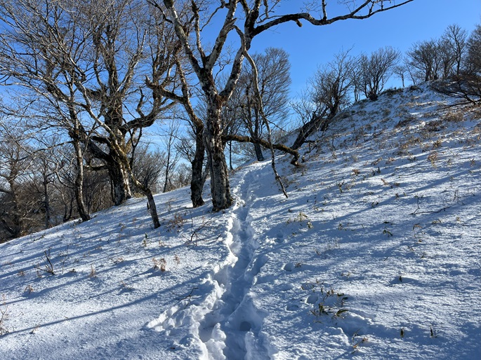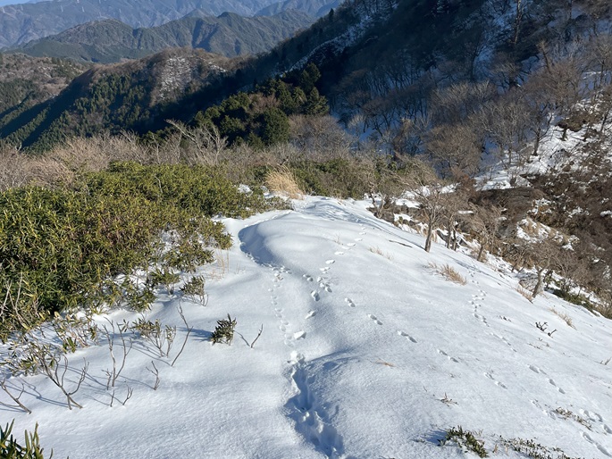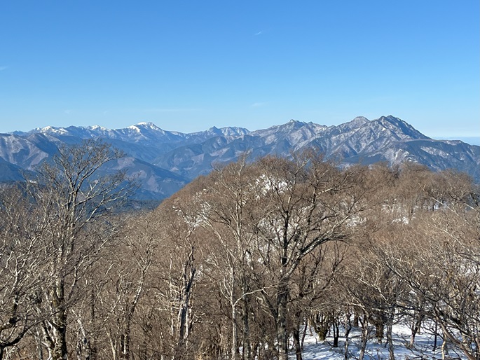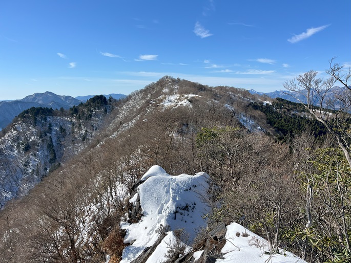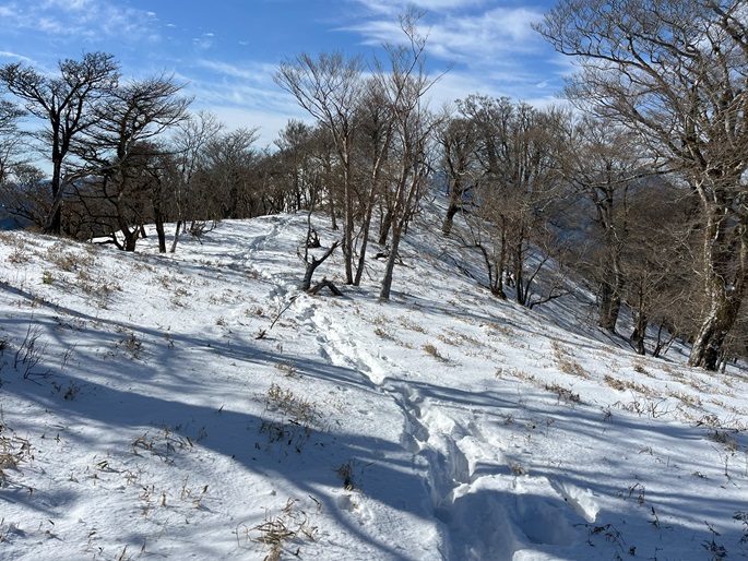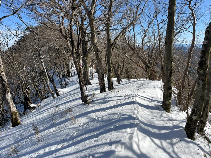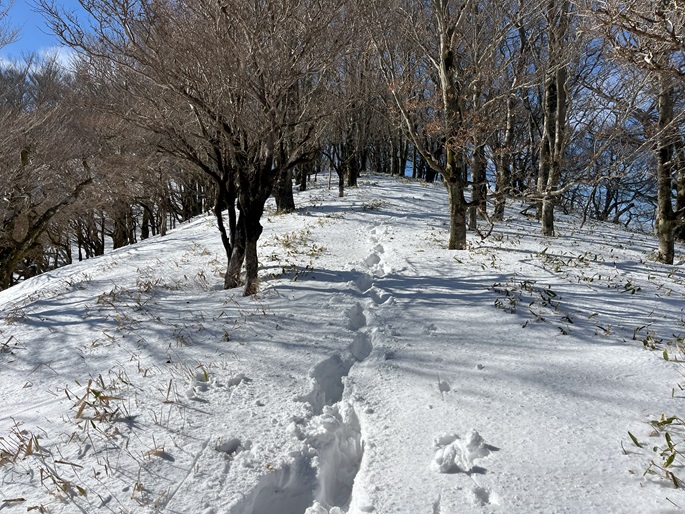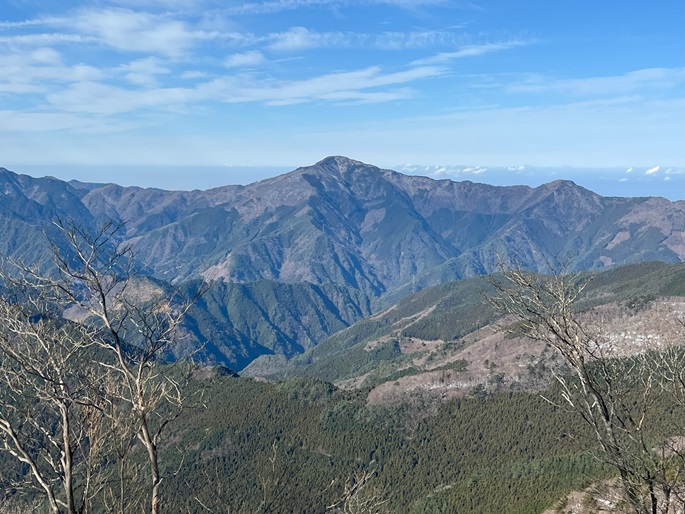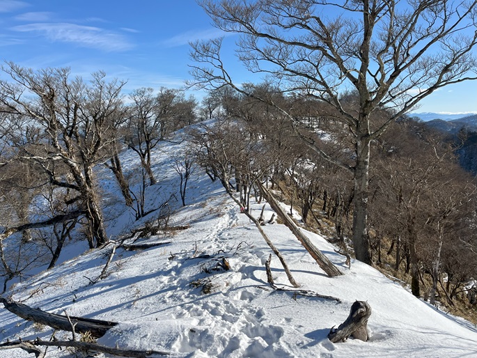 高知県本山町・愛媛県四国中央市の佐々連尾山(1404m*四国百名山)を大森山(1433m)を経て登った。 ピラミダルな大森山の方が標高も高く、好天に恵まれた山頂からの展望が良かった。 大森山から先は膝下のラッセルとなったが、明るくて気持ちの良い変化に富んだ稜線歩きを楽しめた。