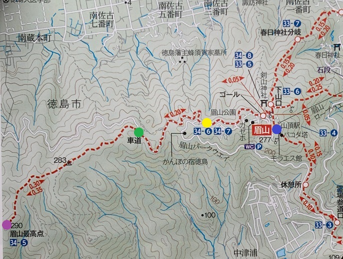 眉山公園 〜 登山口 〜 眉山最高点 〜 登山口 〜 眉山公園 〜 眉山三角点 (往復)