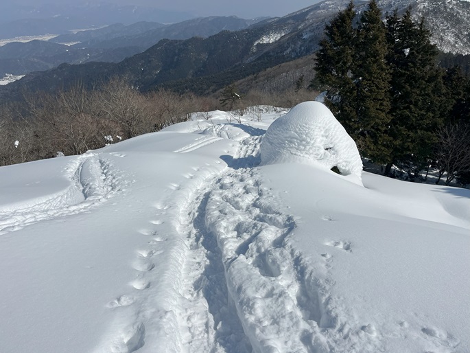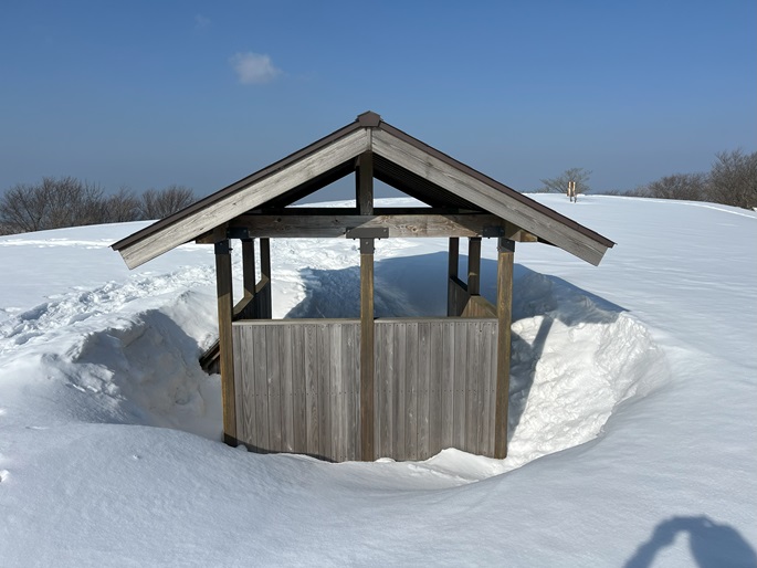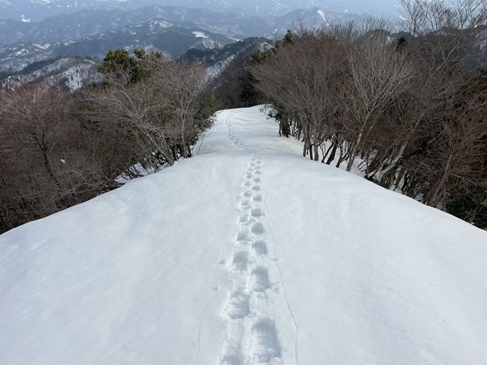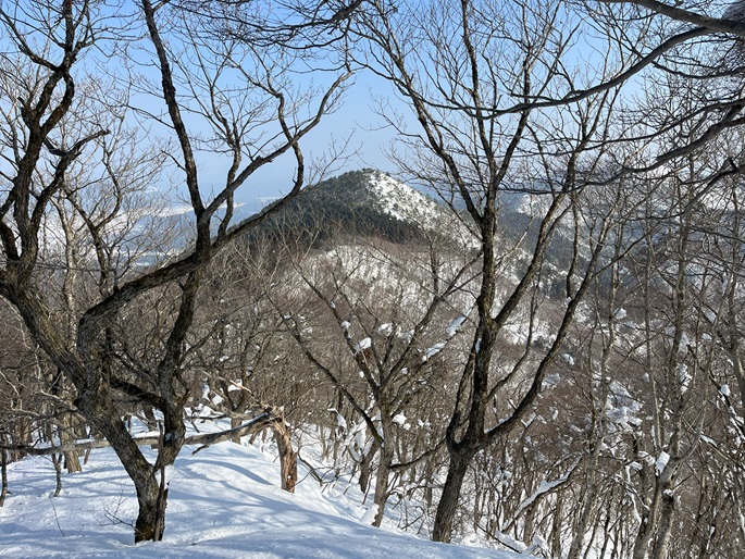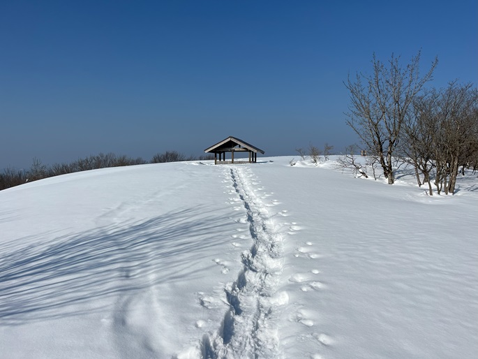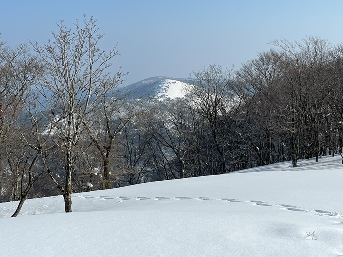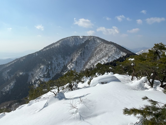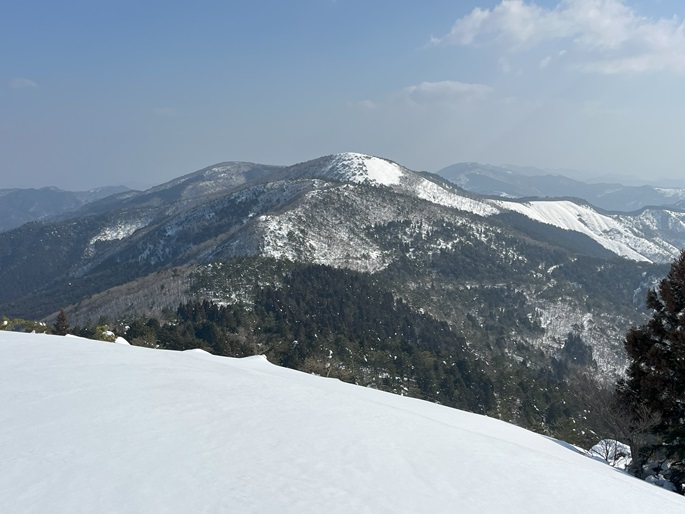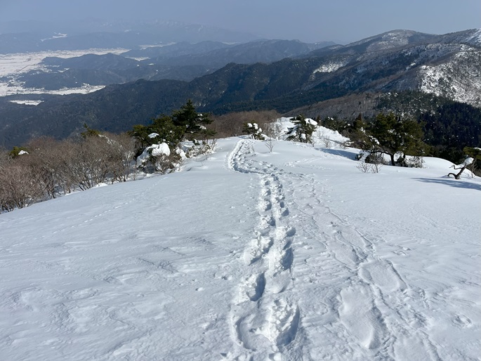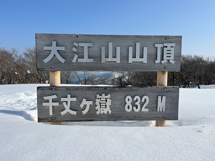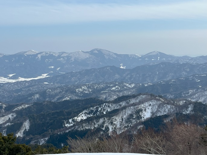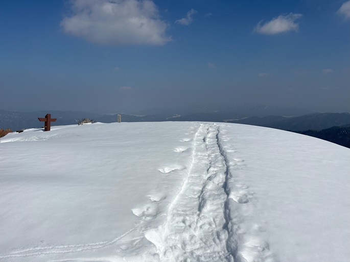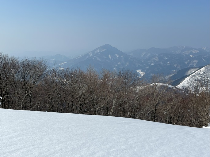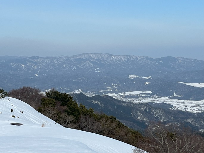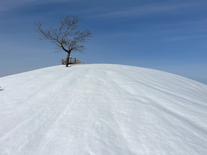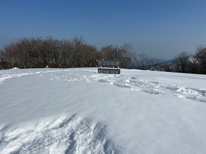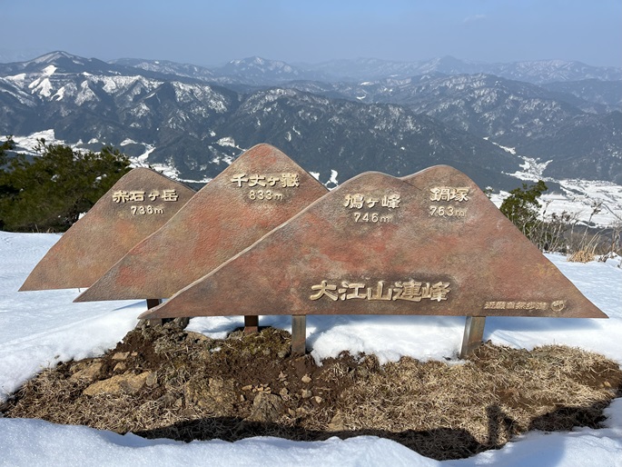 京都府福知山市・与謝野町の大江山(832m*日本の山1000*関西百名山)を登った。 地元で愛されている山のようで、登山口付近まで除雪されていた。 除雪終了点からスノーシューを履いて残雪期限定の尾根ルートで登ったが、週末のトレースが濃く登山道よりも歩き易いくらいだった。 東屋が建つ広い山頂からの展望は雄大だったが春霞だったことが惜しまれた。 山頂から大江山の一峰ともされる鳩ケ峰(746m)への稜線は明るく快適で、地元の人に愛されている理由が頷けた。