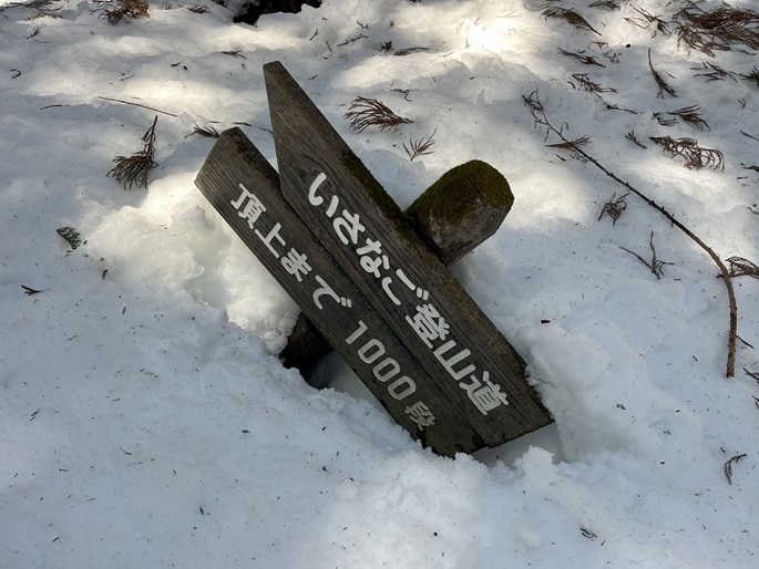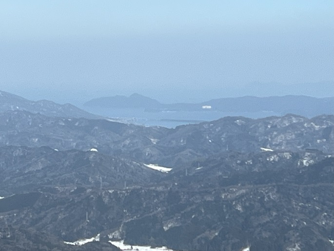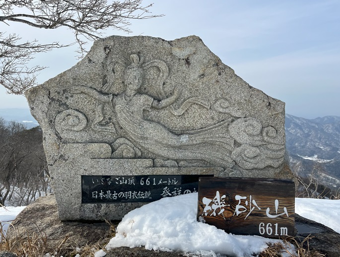 京都府京丹後市の磯砂山(661m*日本の山1000) を登った。 登山口へアプローチする車道は除雪されてなかったので2キロほどスノーシューを履いて歩いた。 午後の雪は重たかったが1時間ほどで駐車場や休憩舎のある羽衣茶屋に着いた。 登山口の道標には山頂まで1000段の階段があると記されていたが、積雪が多く1段も見ることはなかった。 無木立の山頂には展望台があり、春霞ながら四方の山々の眺めが良かった。