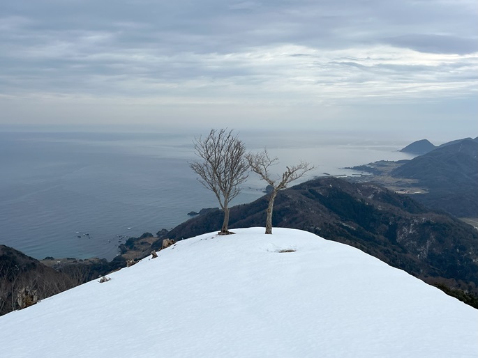 京都府京丹後市の依遅ケ尾山(540m*日本の山1000*関西百名山)を登った。 登山口へアプローチする車道は除雪されてなかったので1キロほどスノーシューを履いて歩いた。 丹後半島の北端に位置する独立峰で、山頂からは日本海の眺めが良かった。