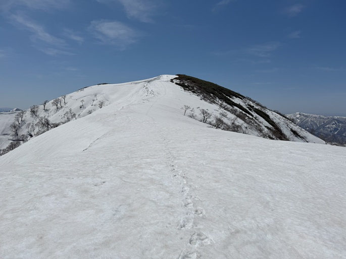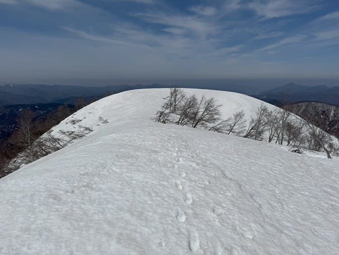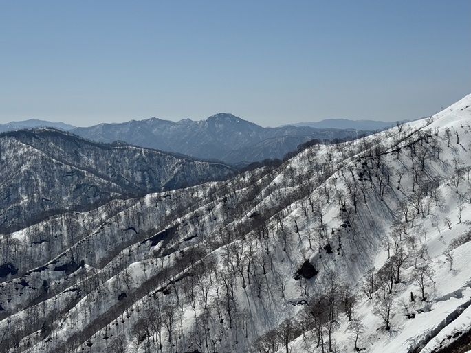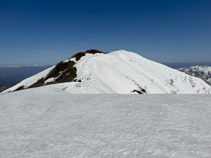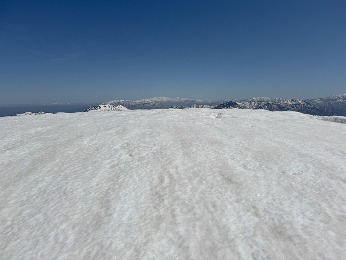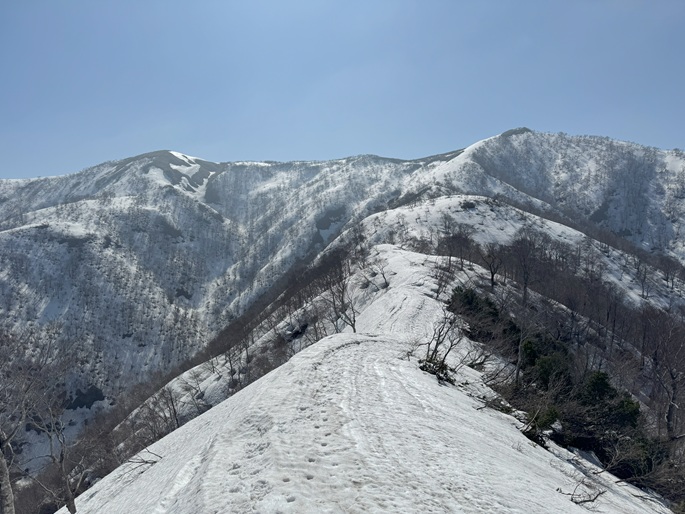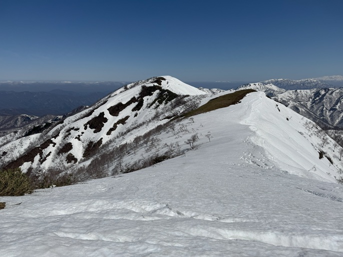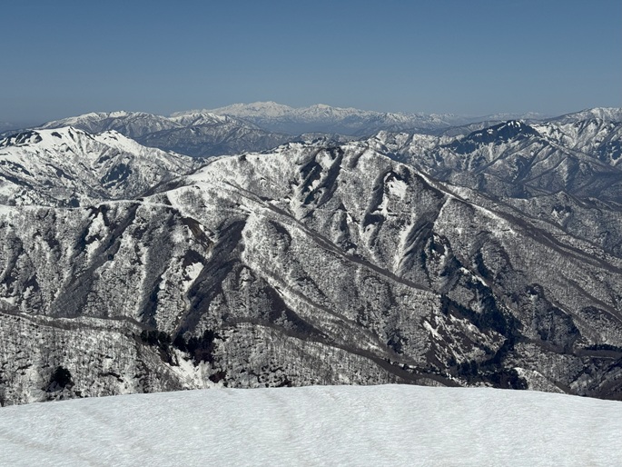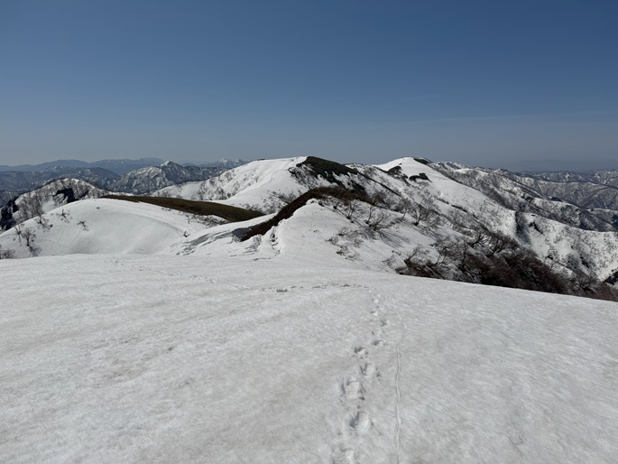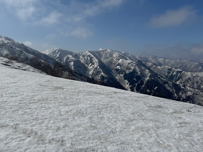 岐阜県揖斐川町・福井県南越前町の笹ケ峰(1284m*ぎふ百山)を登った。 登山道がないので専ら残雪期に福井県側の広野ダムの先から登られている。 今シーズンは積雪が例年よりも多かったことで取付きへの長いアプローチに苦労したが、尾根や稜線の藪は殆どなく先行者のトレースにも助けられ終始ツボ足のままで快適に歩けた。 厚い残雪に覆われた山頂からの展望は素晴らしく白山も遠望された。