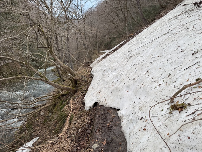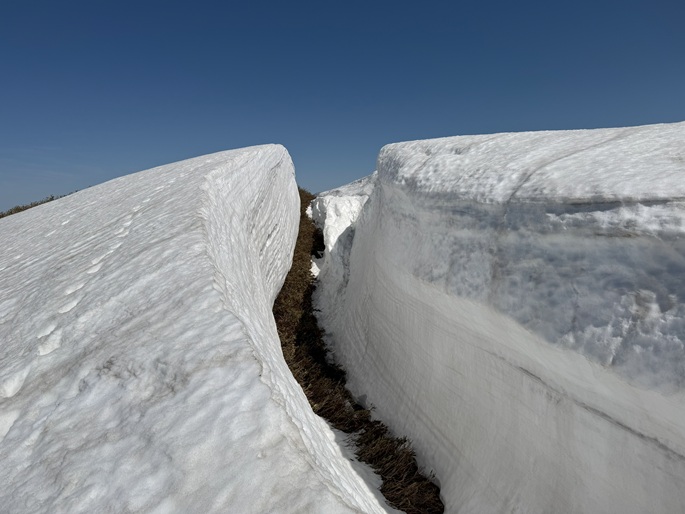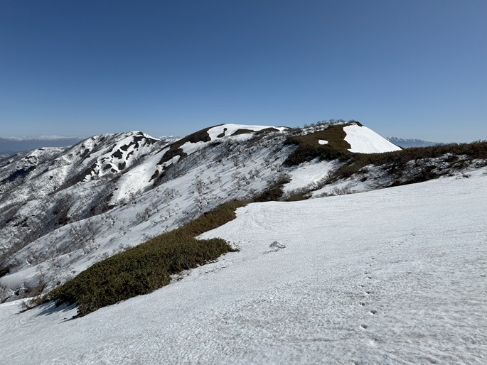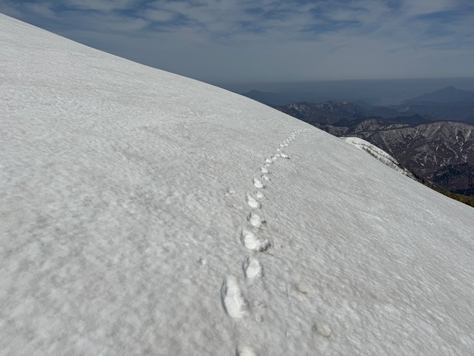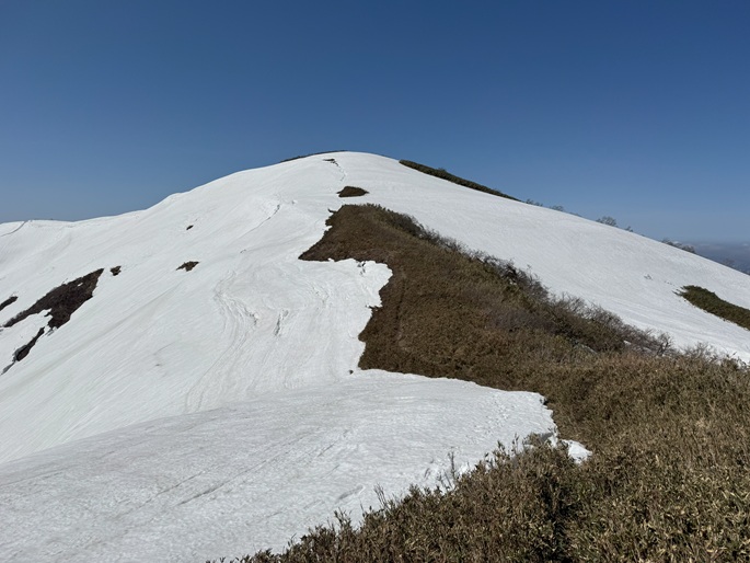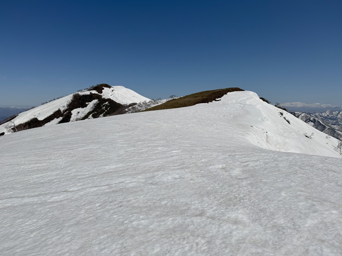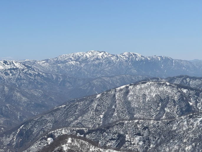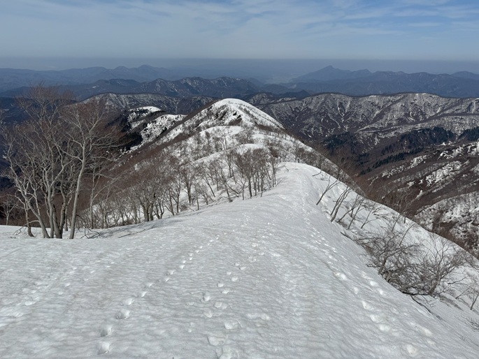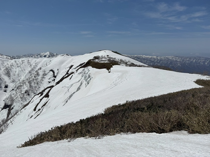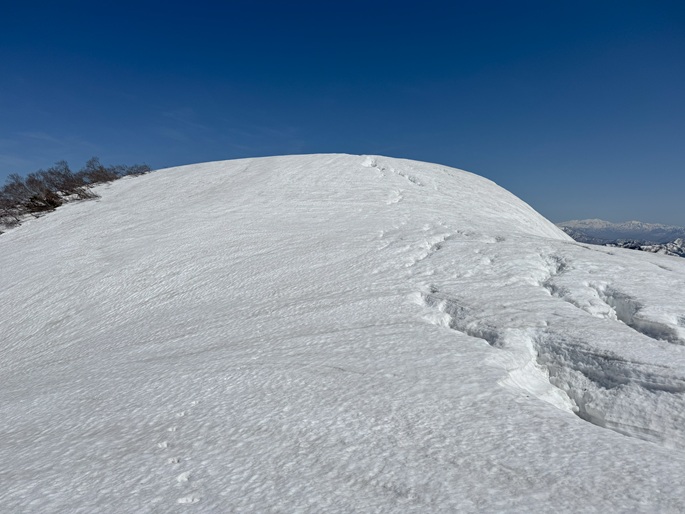 岐阜県揖斐川町・福井県南越前町の笹ケ峰(1284m*ぎふ百山)を登った。 登山道がないので専ら残雪期に福井県側の広野ダムの先から登られている。 今シーズンは積雪が例年よりも多かったことで取付きへの長いアプローチに苦労したが、尾根や稜線の藪は殆どなく先行者のトレースにも助けられ終始ツボ足のままで快適に歩けた。 厚い残雪に覆われた山頂からの展望は素晴らしく白山も遠望された。
