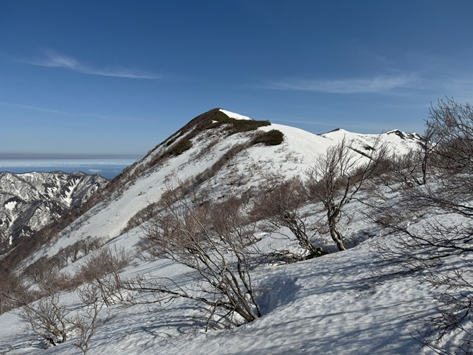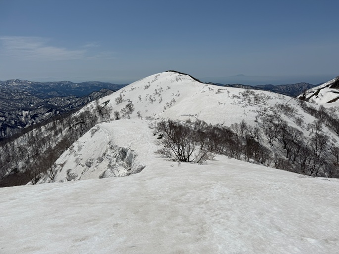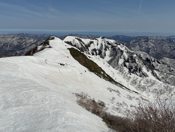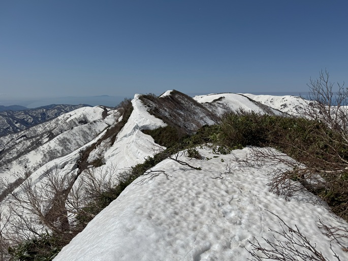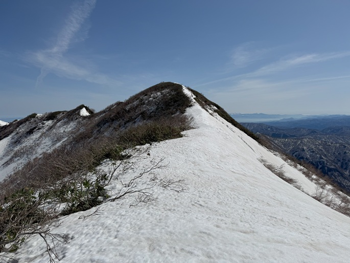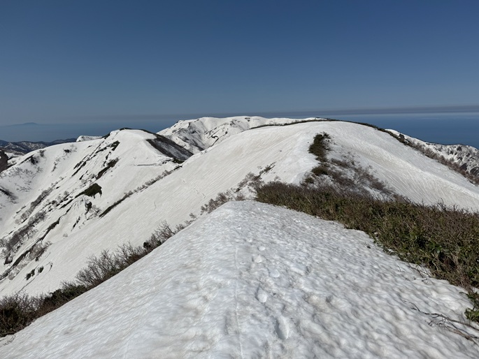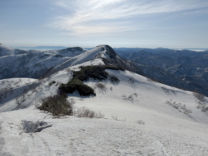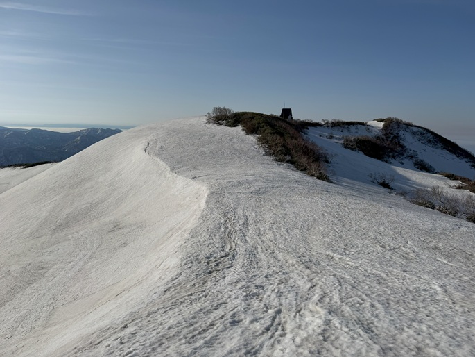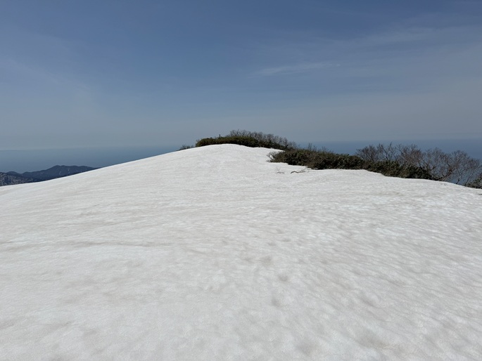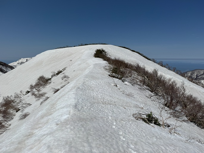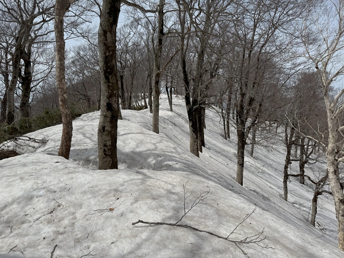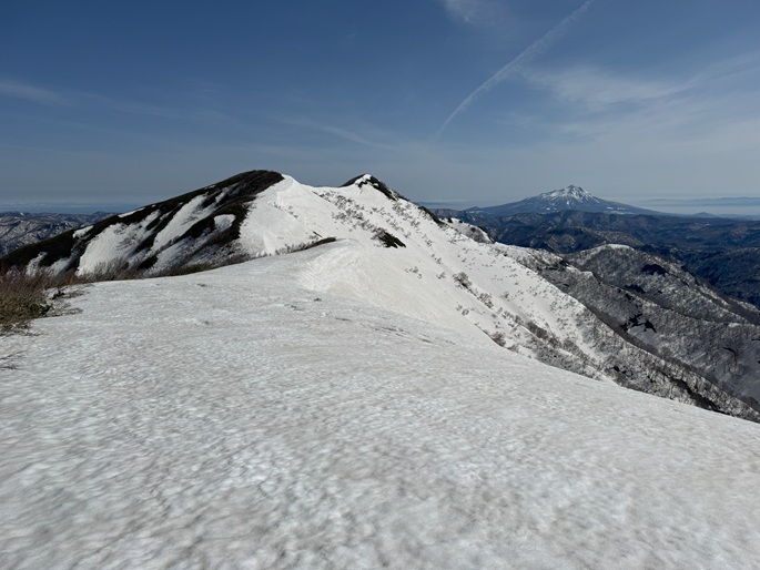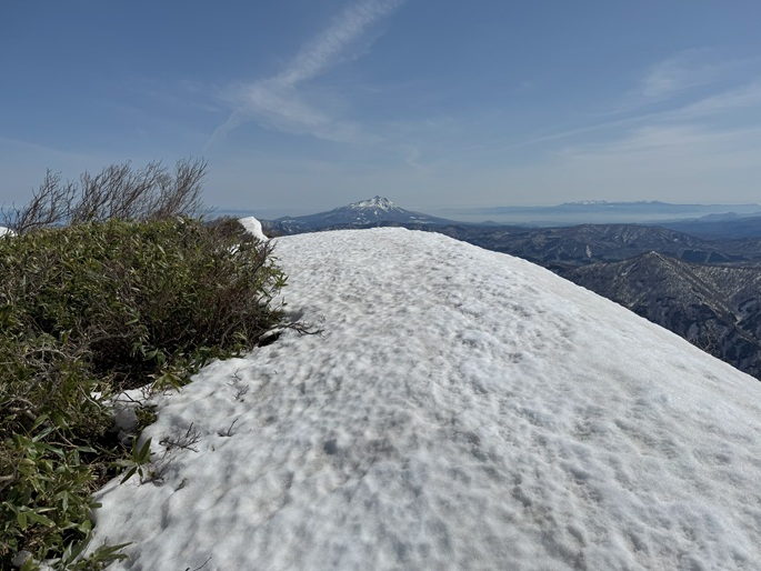 青森県深浦町の向白神岳(1250m*日本の山1000)を白神岳(1231m)を経て登った。 白神岳から向白神岳の間には登山道がなく専ら残雪期に登られている。 白神岳の山頂の避難小屋は以前から泊まってみたいと願っていたが、今シーズンは良い天気が二日続かず今回も日帰りでの登山となった。 稜線の残雪は正味期限が迫り僅かばかりの藪漕ぎがあったが、逆にちょうど良い締まり具合でアイゼンを着けることなく、白神岳から向白神岳までの所要時間は予想よりも早い2時間ほどだった。
