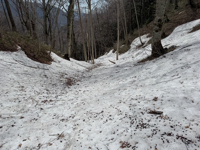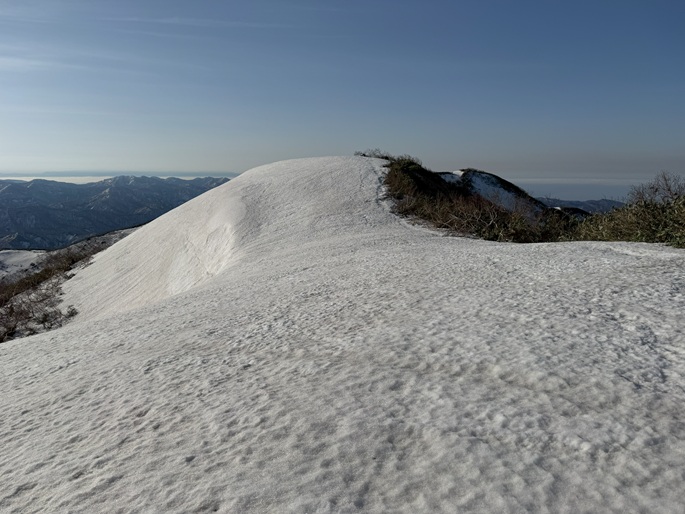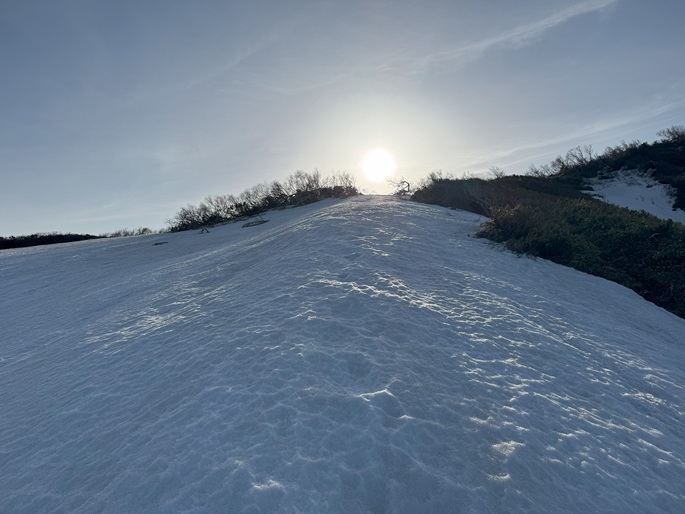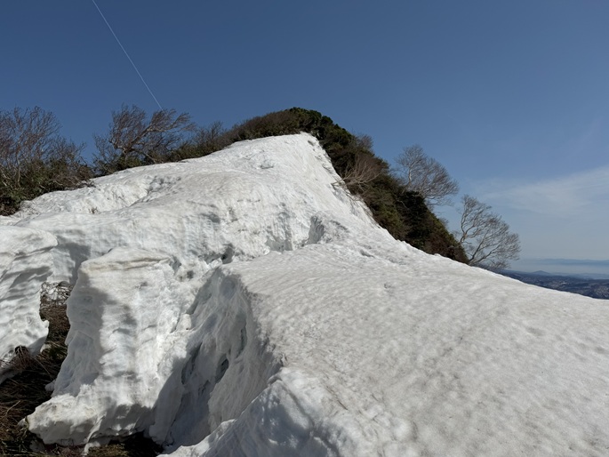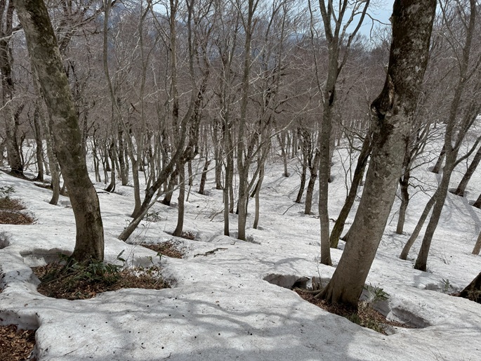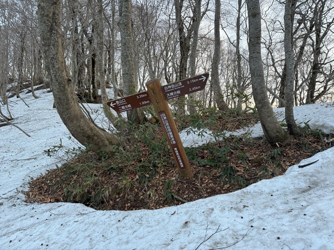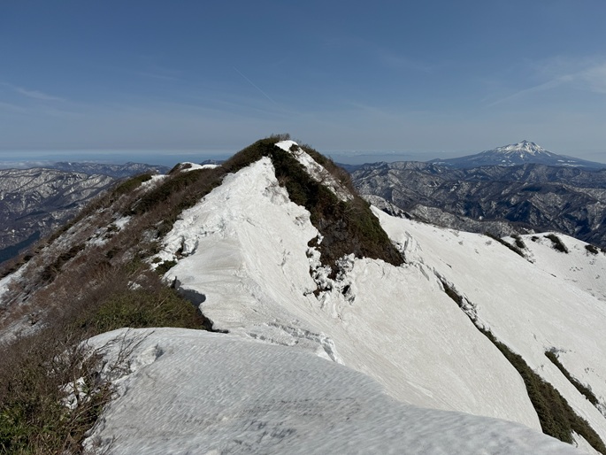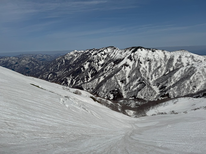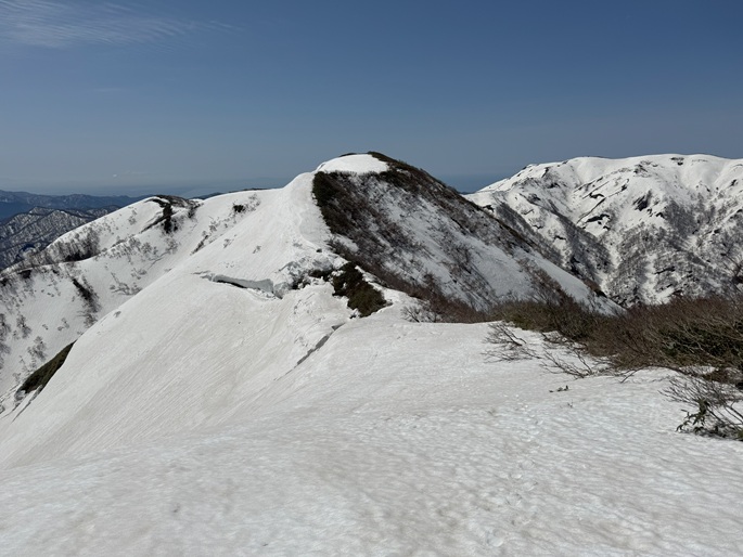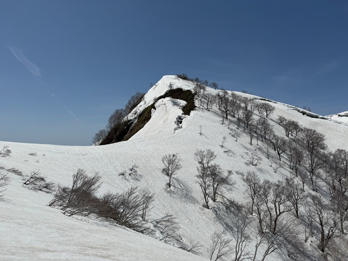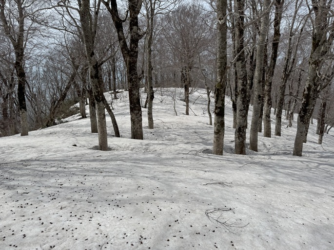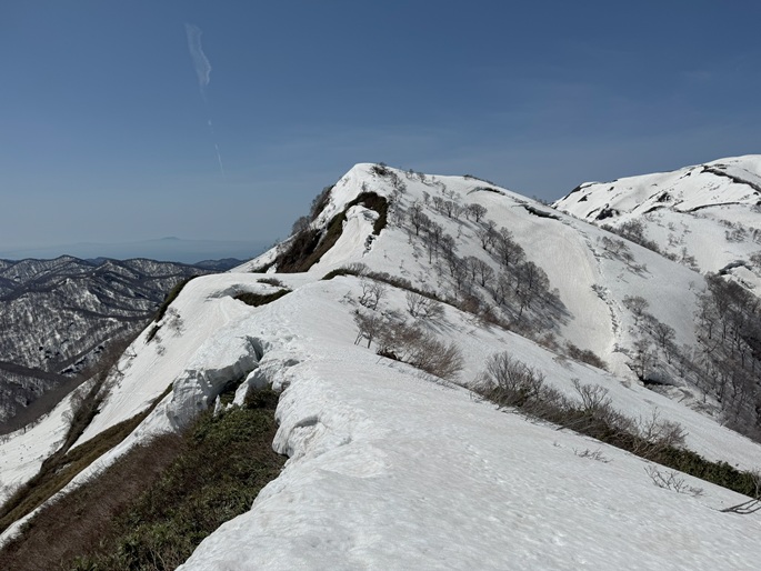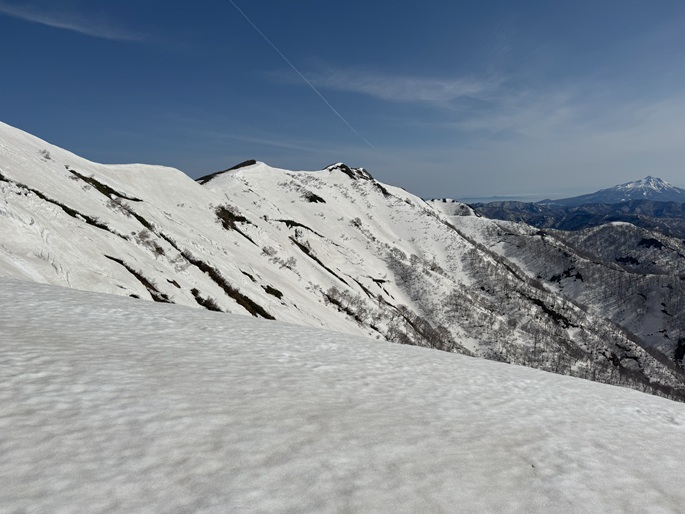 青森県深浦町の向白神岳(1250m*日本の山1000)を白神岳(1231m)を経て登った。 白神岳から向白神岳の間には登山道がなく専ら残雪期に登られている。 白神岳の山頂の避難小屋は以前から泊まってみたいと願っていたが、今シーズンは良い天気が二日続かず今回も日帰りでの登山となった。 稜線の残雪は正味期限が迫り僅かばかりの藪漕ぎがあったが、逆にちょうど良い締まり具合でアイゼンを着けることなく、白神岳から向白神岳までの所要時間は予想よりも早い2時間ほどだった。