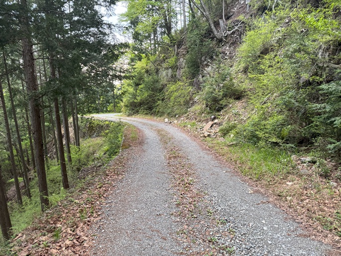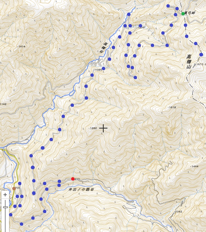 林道起点 〜 林道分岐 〜 取付き 〜 井出小路山 〜 取付き 〜 林道分岐 〜 真弓峠 〜 高樽山 〜 真弓峠 〜 林道分岐 〜 林道起点 (往復)