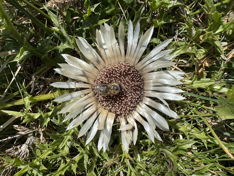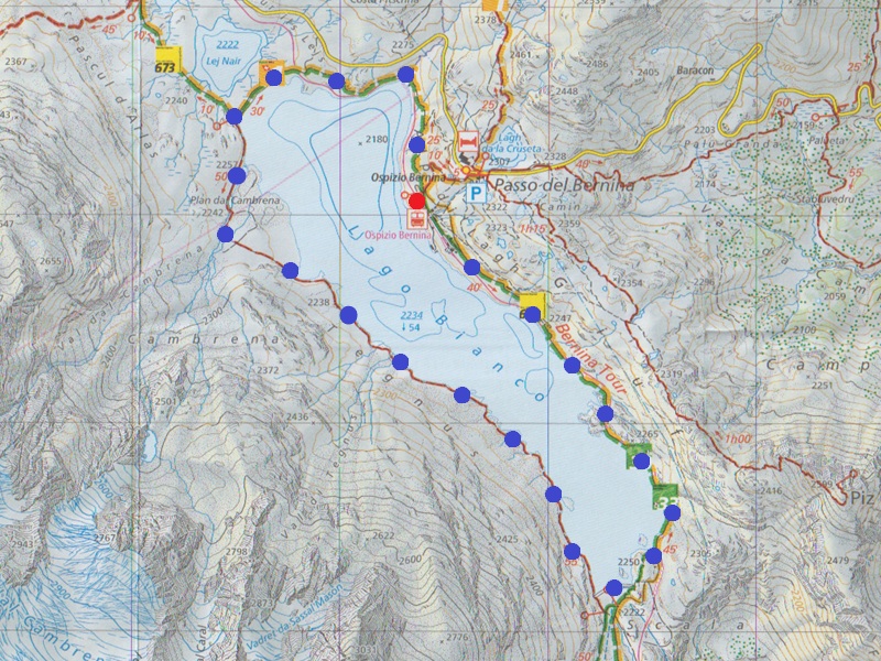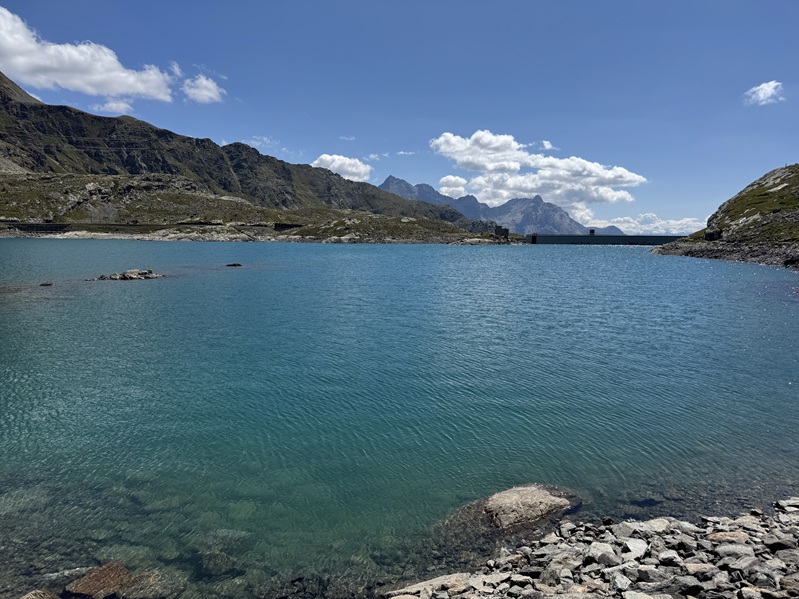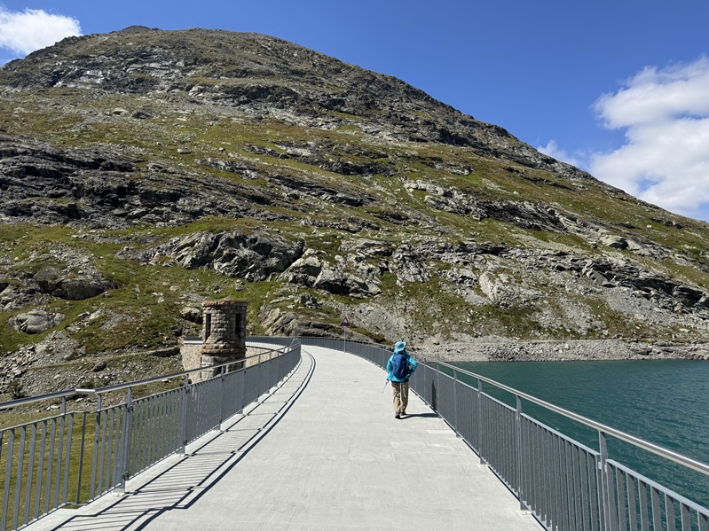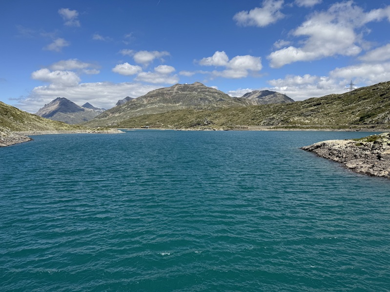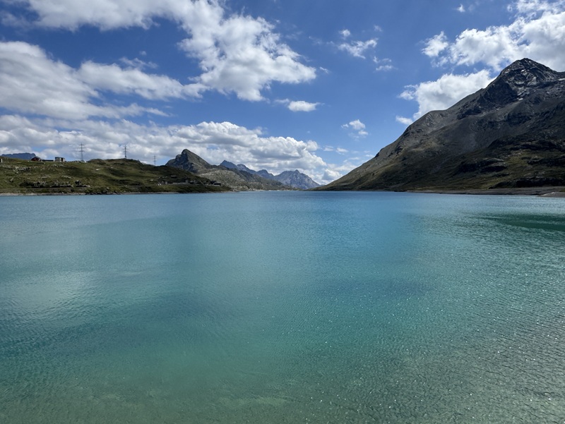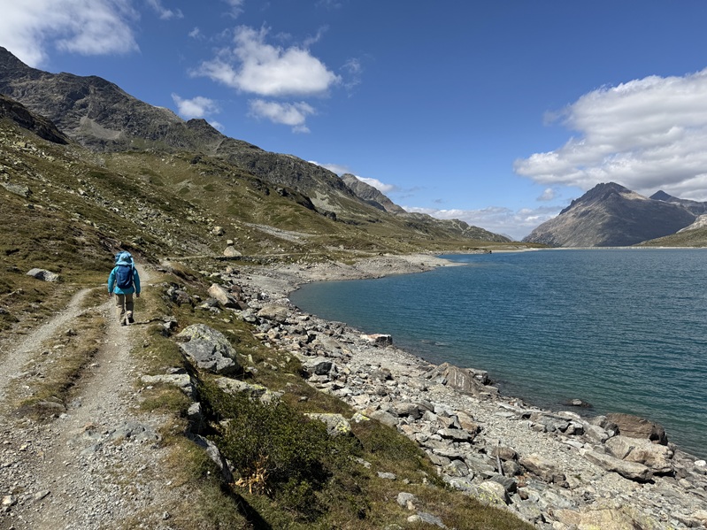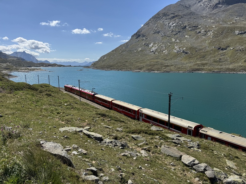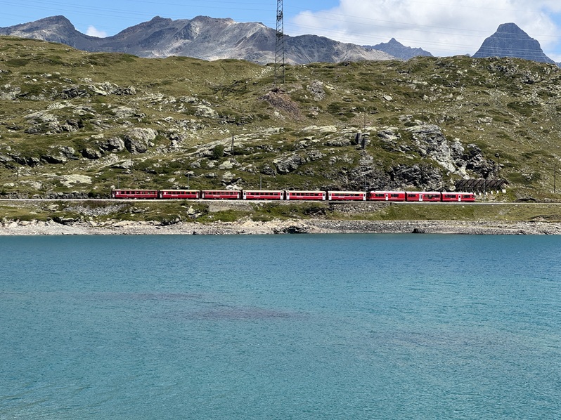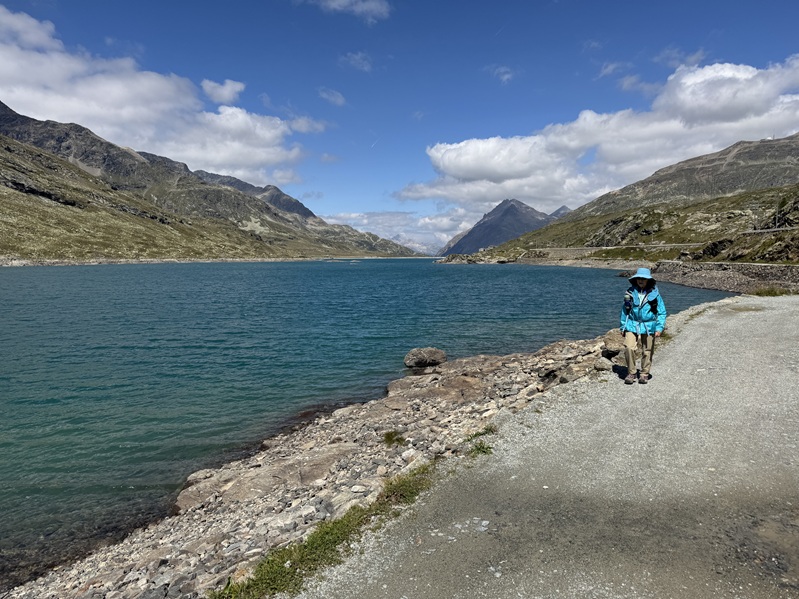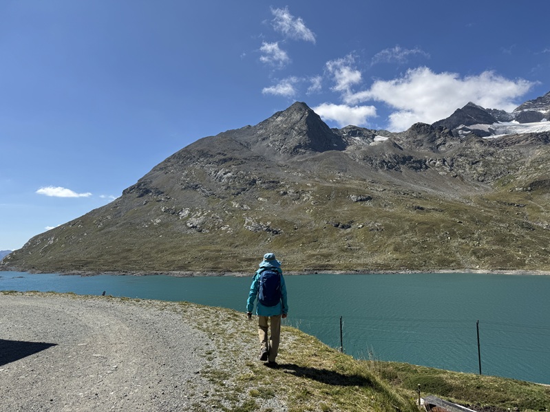 オスピツィオ・ベルニナ駅から時計回りにラーゴ・ビアンコの湖畔を一周する起伏の少ない8.5キロのハイキングトレイルを歩く。 21年前に見たラーゴ・ビアンコは名前のとおり乳白色(イタリア語でビアンコは白)だったが、今日の湖は水源の氷河の後退の影響なのか青緑色だったので違和感があった。 8両編成の列車が頻繁に湖岸を走り、以前よりも観光化が進んでいることを実感した。