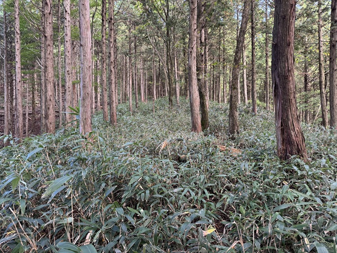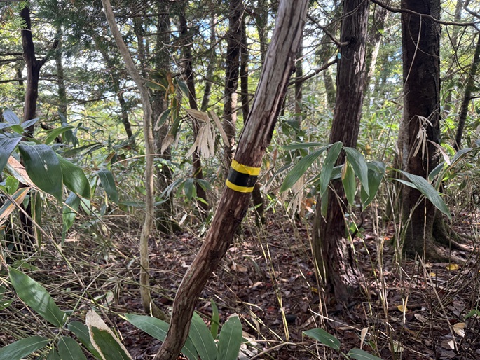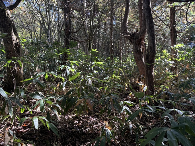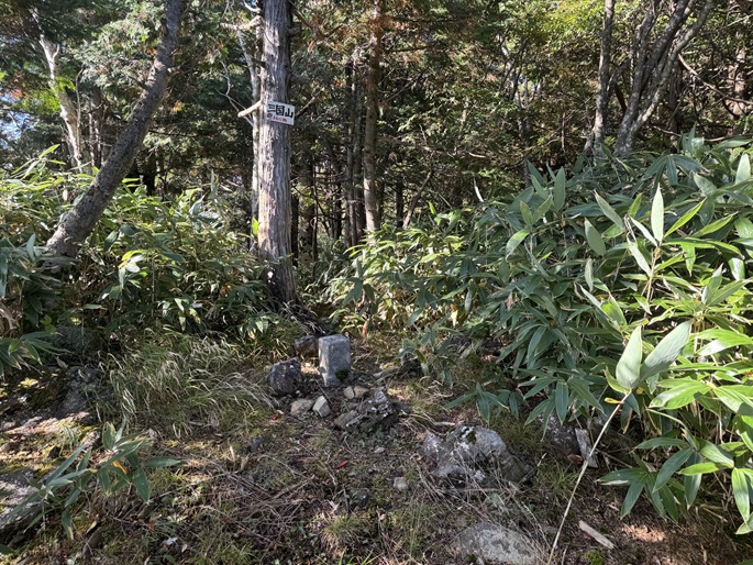 岐阜県下呂市・中津川市・長野県大滝村の三国山(1610m*ぎふ百山)を登った。 荒廃した林道を2時間ほど歩いて長野県との県境の鞍掛峠へ。 鞍掛峠から背丈を超える笹藪を2時間以上漕いでようやく山頂に着いた。 笹藪の中では過去に経験したことのない手強さだった。 雑木に囲まれた地味な山頂だが、愛好家が設置した新しい山名板があった。