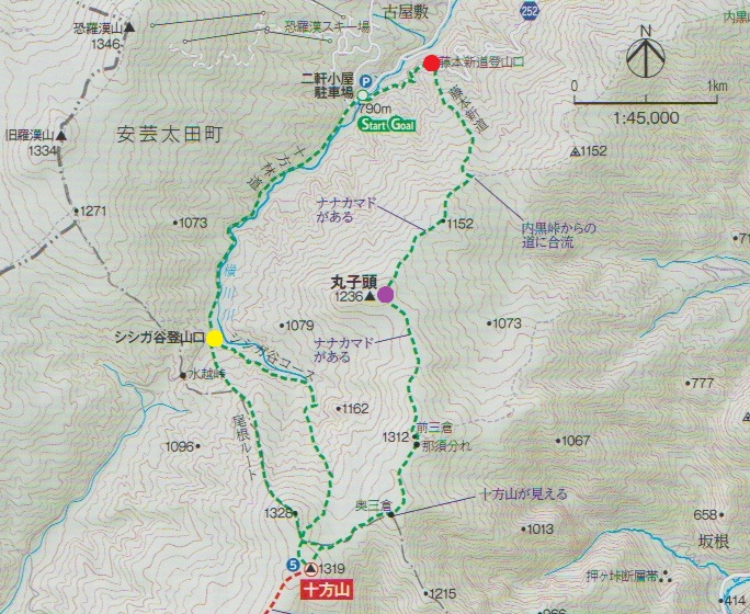 牛小屋高原 〜 藤本新道登山口 〜 丸子頭 〜 十方山 〜 獅子ケ谷登山口 〜 旧羅漢山 〜 恐羅漢山 〜 牛小屋高原 (周回)