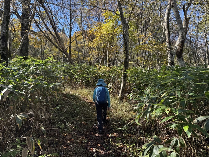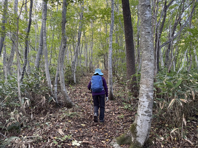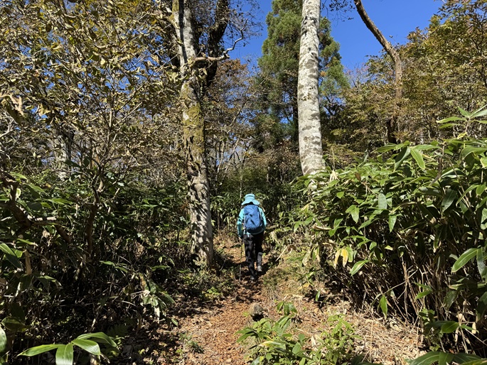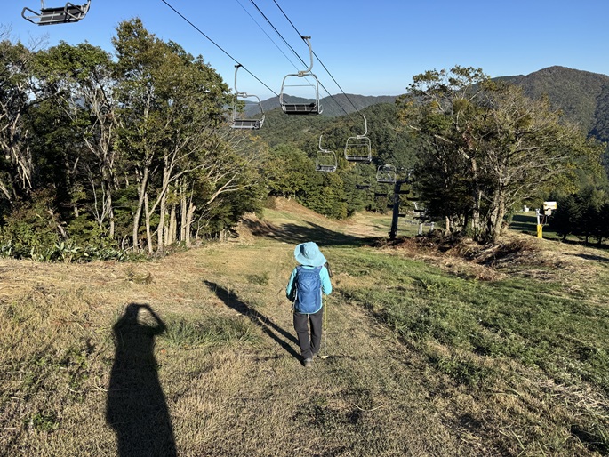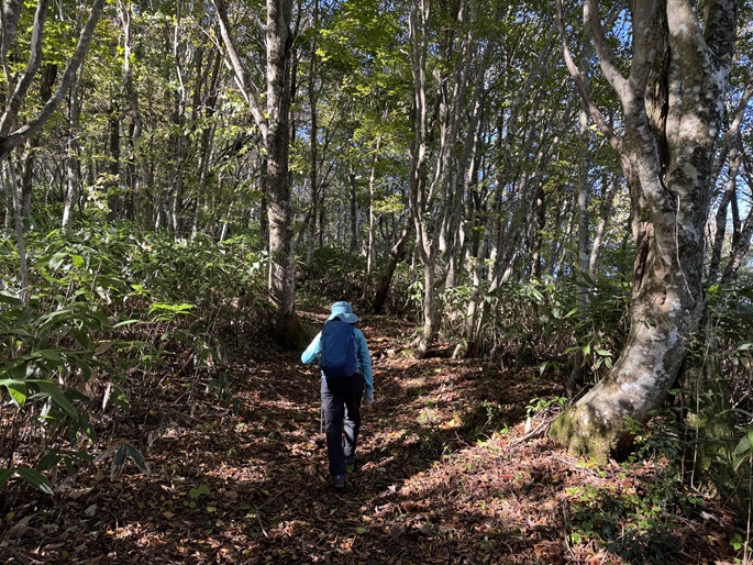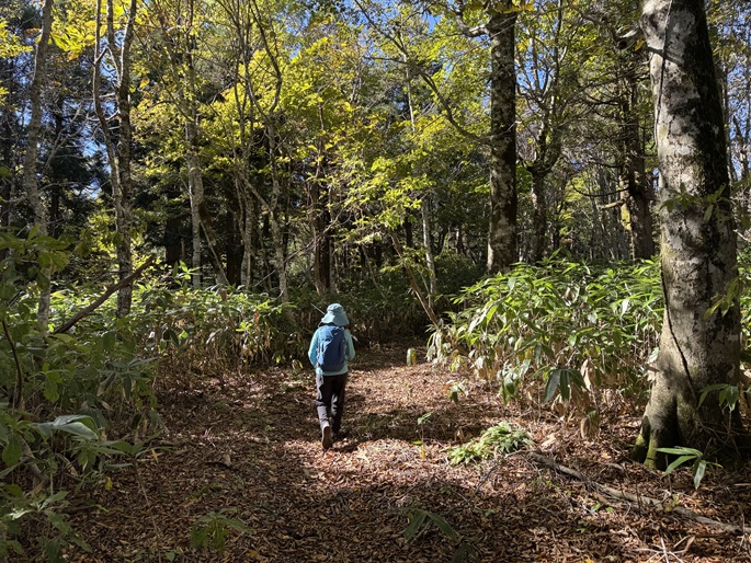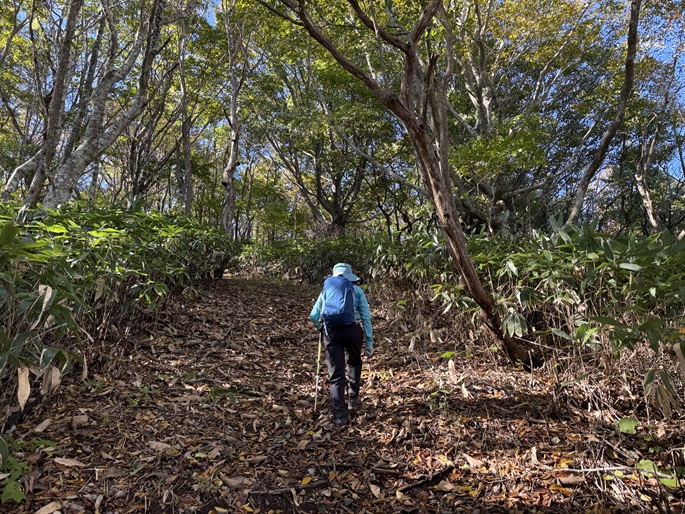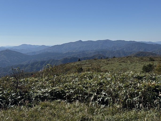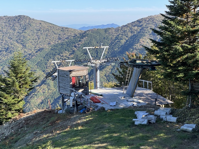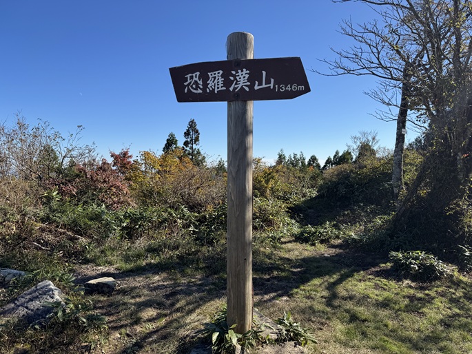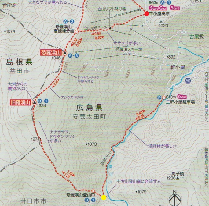 十方山から旧羅漢山(1334m)を経て恐羅漢山を繋ぐ長い稜線は、笹や木々が密集していて終始展望は得られなかった。 広島県と島根県の県境に位置する恐羅漢山は両県の最高峰で、山の東斜面は『恐羅漢スノーパーク』というスキー場になっていた。