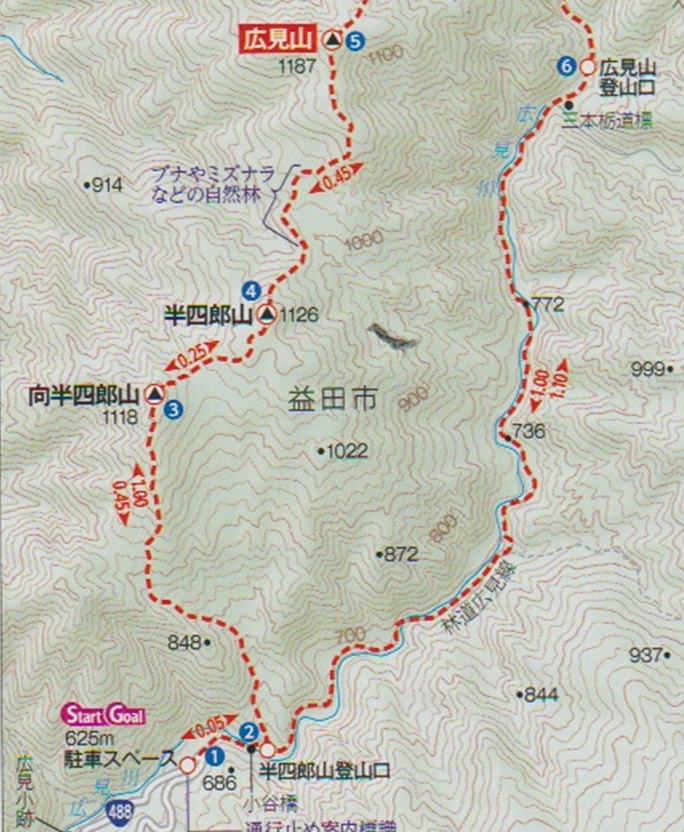 国道駐車地 〜 半四郎山登山口 〜 向半四郎山 〜 半四郎山 〜 広見山 (往復)