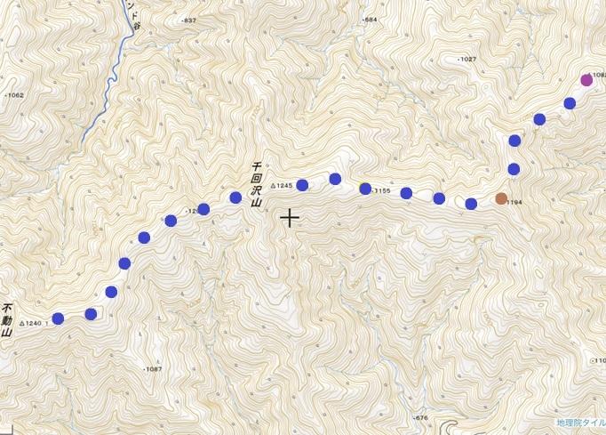 林道ゲート 〜 渡渉点 〜 1082m峰 〜 1194m峰 〜 千回沢山 〜 不動山 (往復)