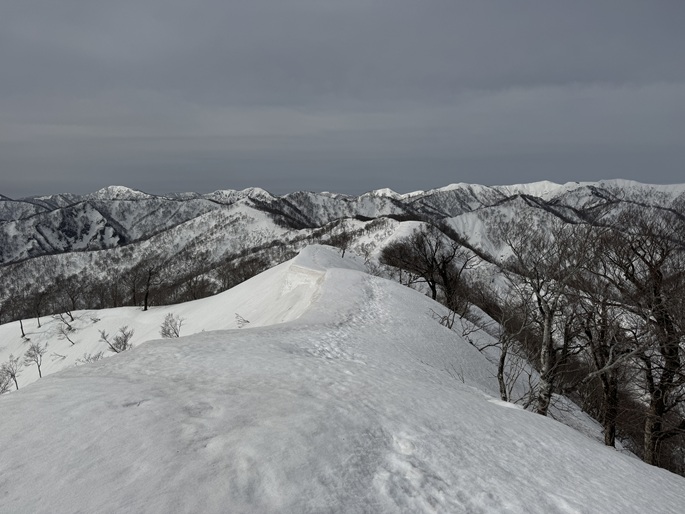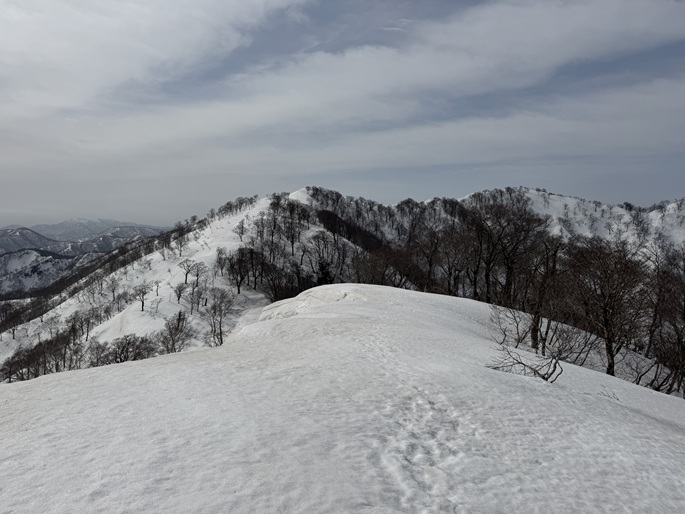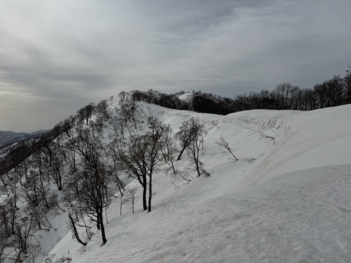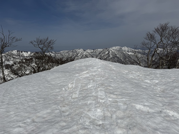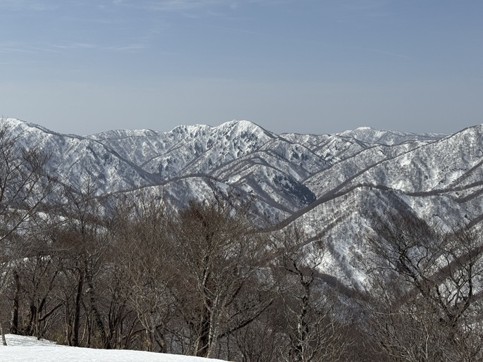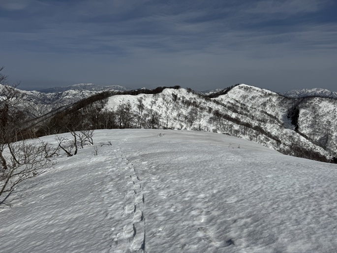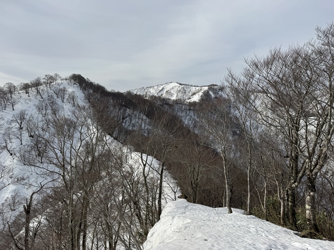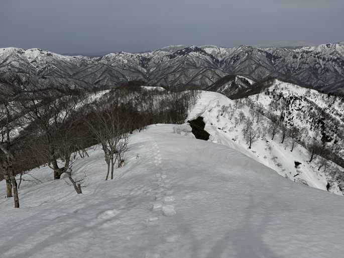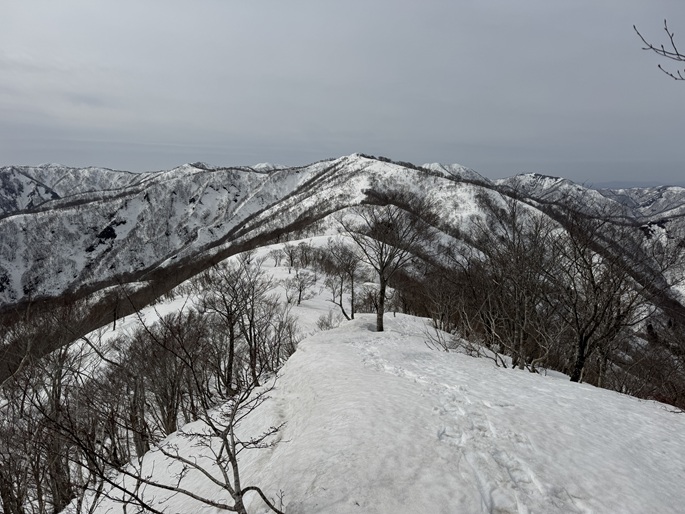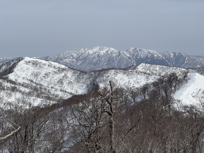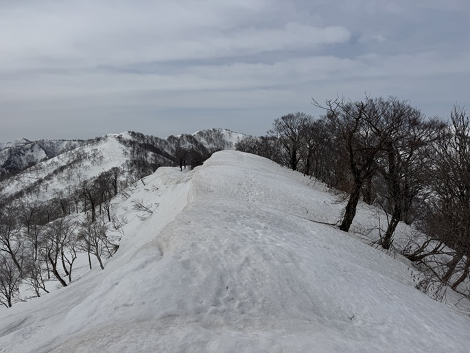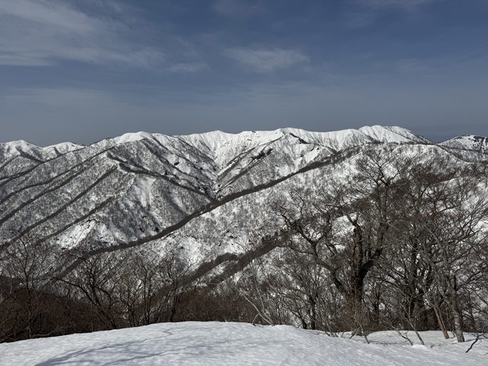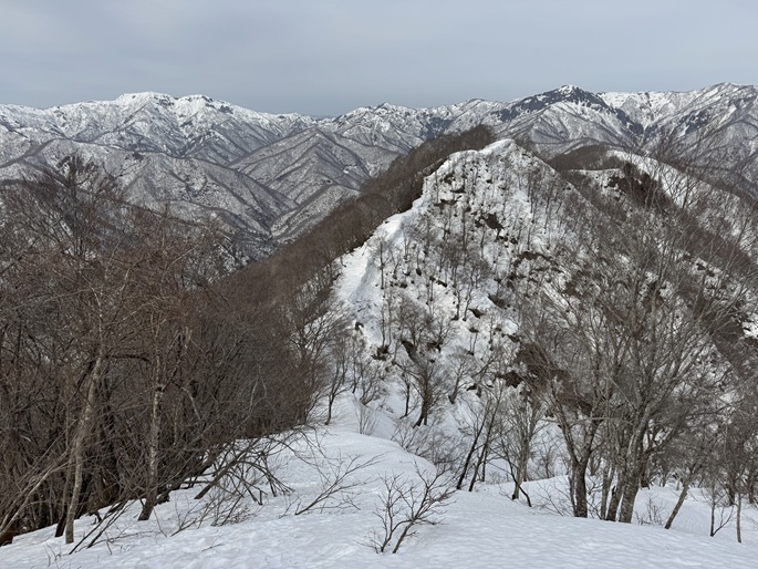 核心の渡渉は登りの水位が膝と股の間、気温が上がる下りは股下近くで、安全に渡るにはギリギリの深さだった。 山の積雪は充分あり藪漕ぎは皆無だったが、連休中続いた季節外れの高温で一気に雪が緩み、登り始めから1時間半ほどの所からスノーシューを履くことになり、重たい雪と踏み抜きで苦労した。 登り返しが多いため取付きからの累積標高差は1600mほどあり、渡渉の手間もあったことで11時間ほどの時間を要した。 渡渉は安価な胴長を初めて使ったが、雪解け水の冷たさは全く感じず、そのコスパの高さに驚かされた。 薮のない稜線上は終始展望が良く、連休直後だったことで山は終日貸し切りだった。