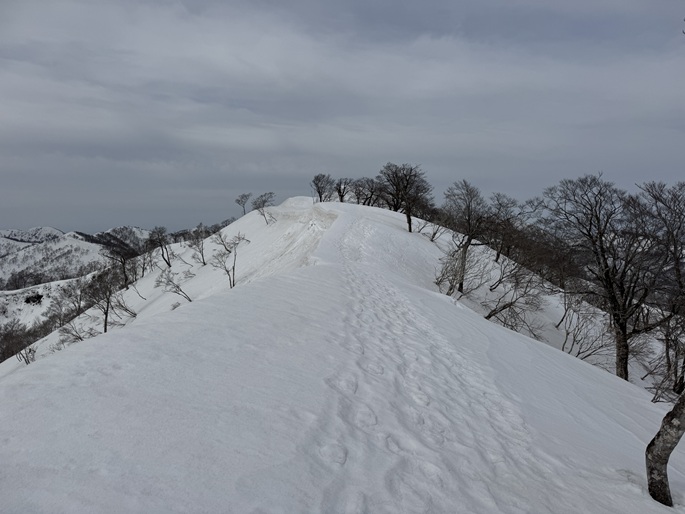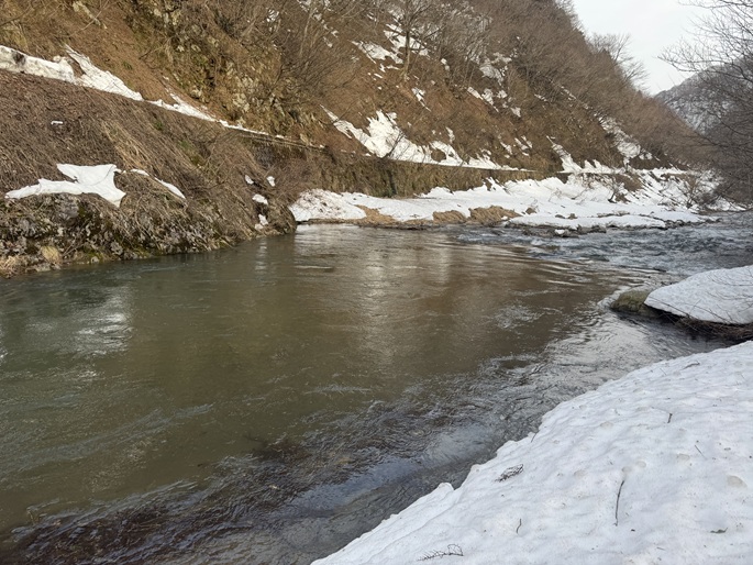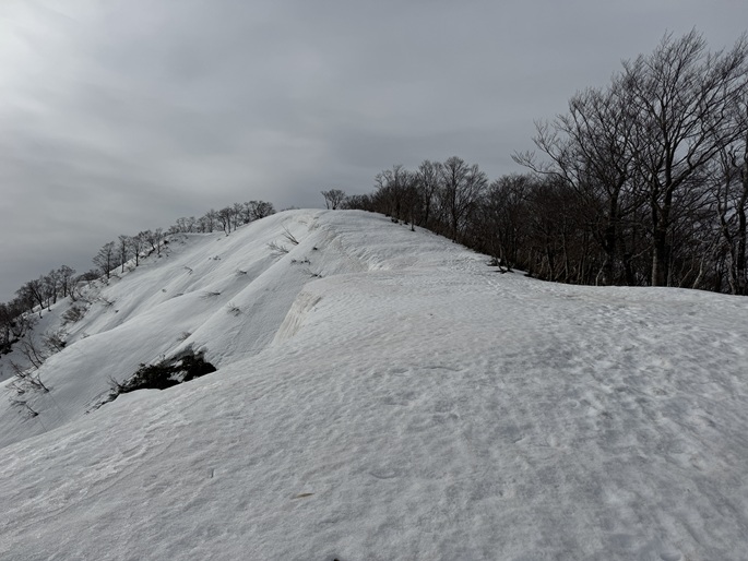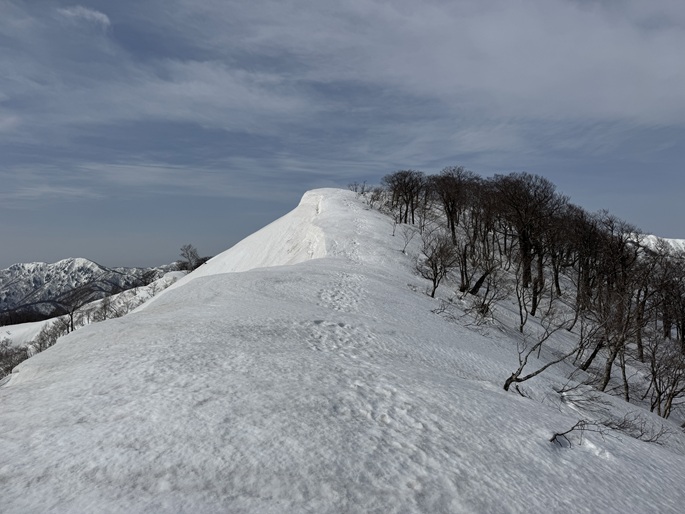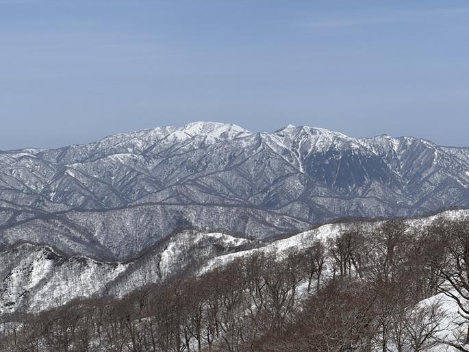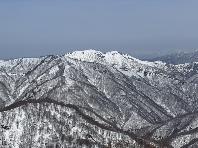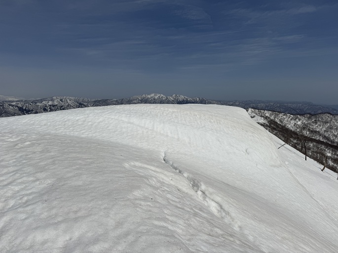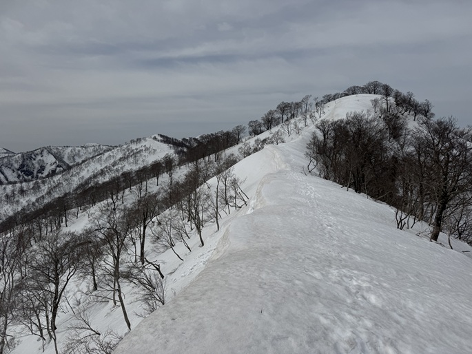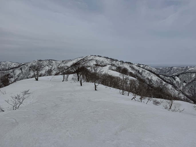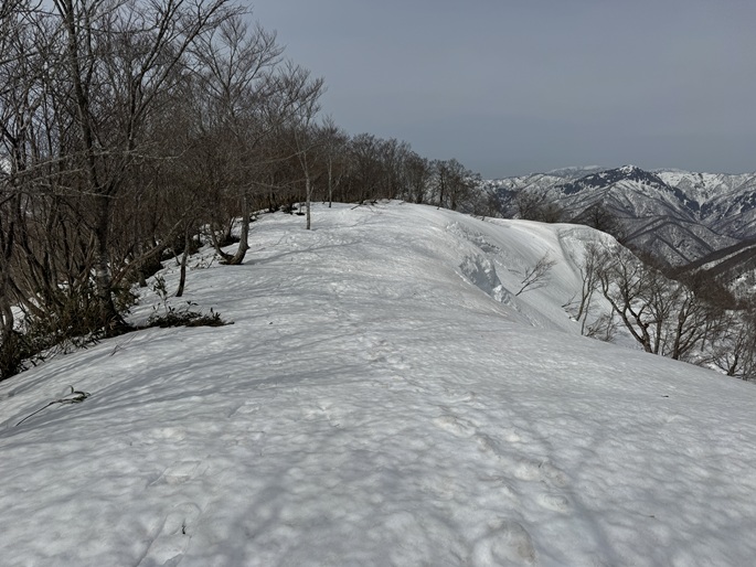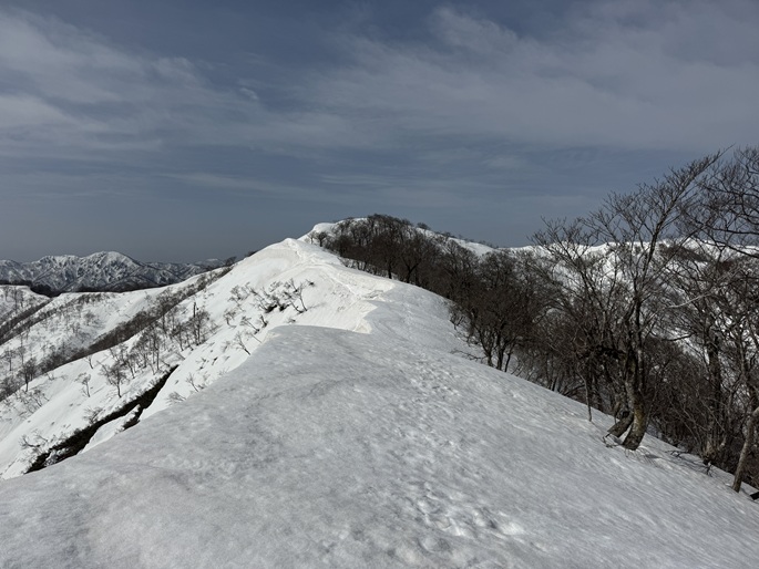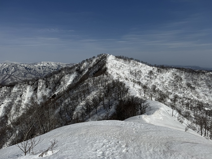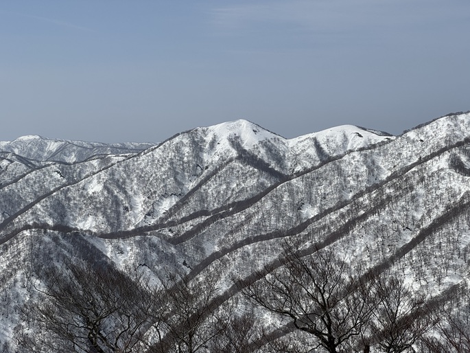 核心の渡渉は登りの水位が膝と股の間、気温が上がる下りは股下近くで、安全に渡るにはギリギリの深さだった。 山の積雪は充分あり藪漕ぎは皆無だったが、連休中続いた季節外れの高温で一気に雪が緩み、登り始めから1時間半ほどの所からスノーシューを履くことになり、重たい雪と踏み抜きで苦労した。 登り返しが多いため取付きからの累積標高差は1600mほどあり、渡渉の手間もあったことで11時間ほどの時間を要した。 渡渉は安価な胴長を初めて使ったが、雪解け水の冷たさは全く感じず、そのコスパの高さに驚かされた。 薮のない稜線上は終始展望が良く、連休直後だったことで山は終日貸し切りだった。